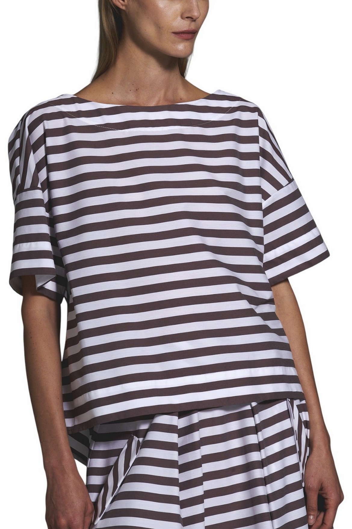 Shirt by Milva Mi. Striped pattern. Half sleeves. Dropped shoulders. Boxy fit. Pleats at the back. Composition: 72% cotton, 25% polyamide, 3% elastane. Made in Italy.