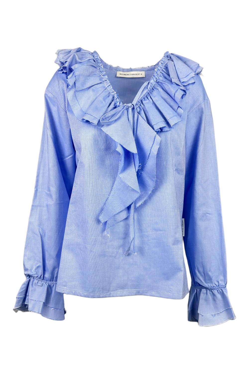 Oxford shirt by Noumeno Concept. Slip-on style. V-neck. Ruffled details at neckline and cuffs. Text on the back. Side slits. Oversized fit. Composition: 100% cotton.