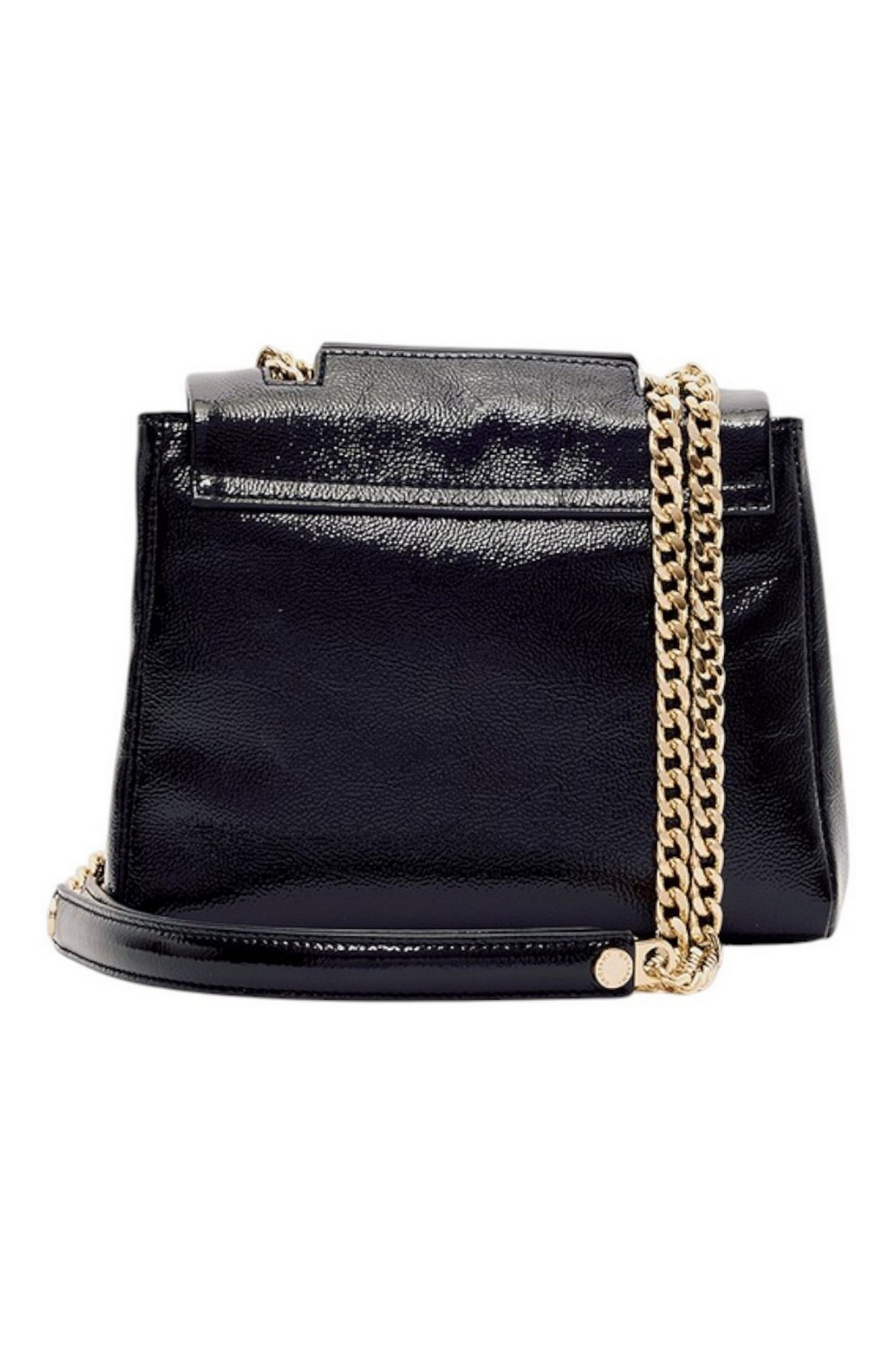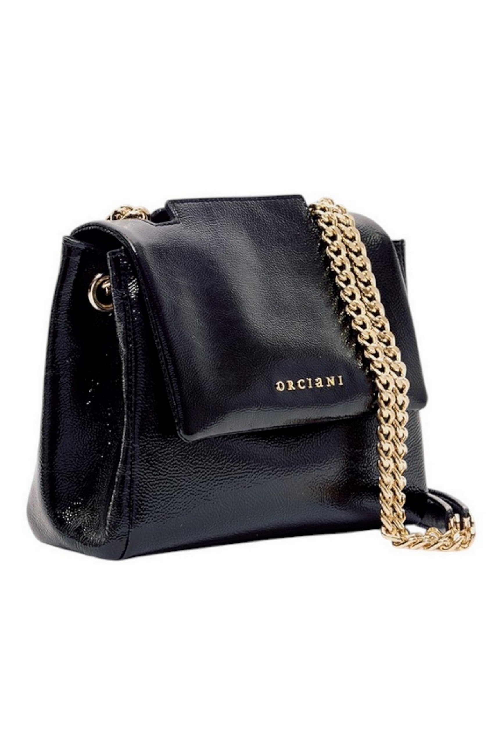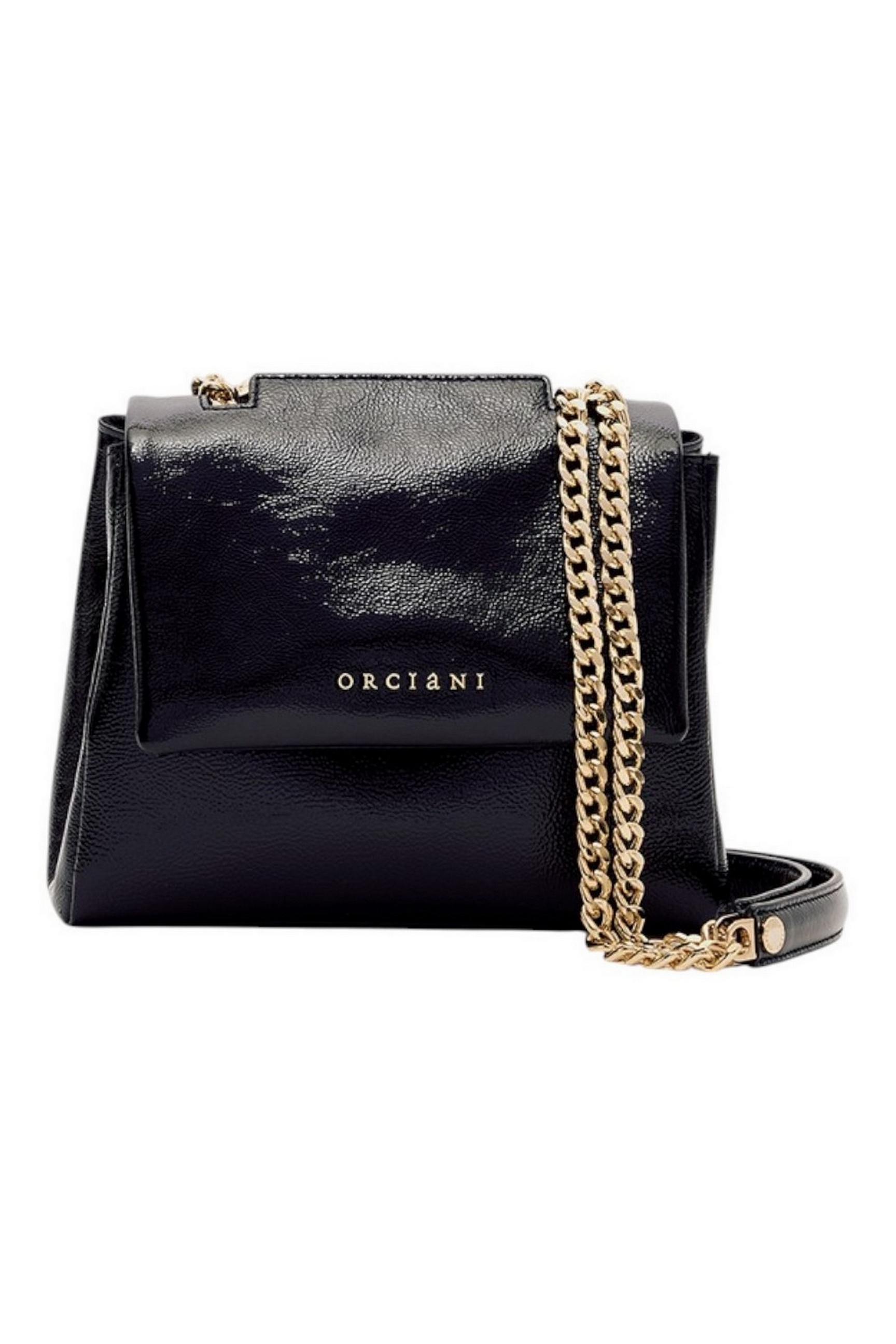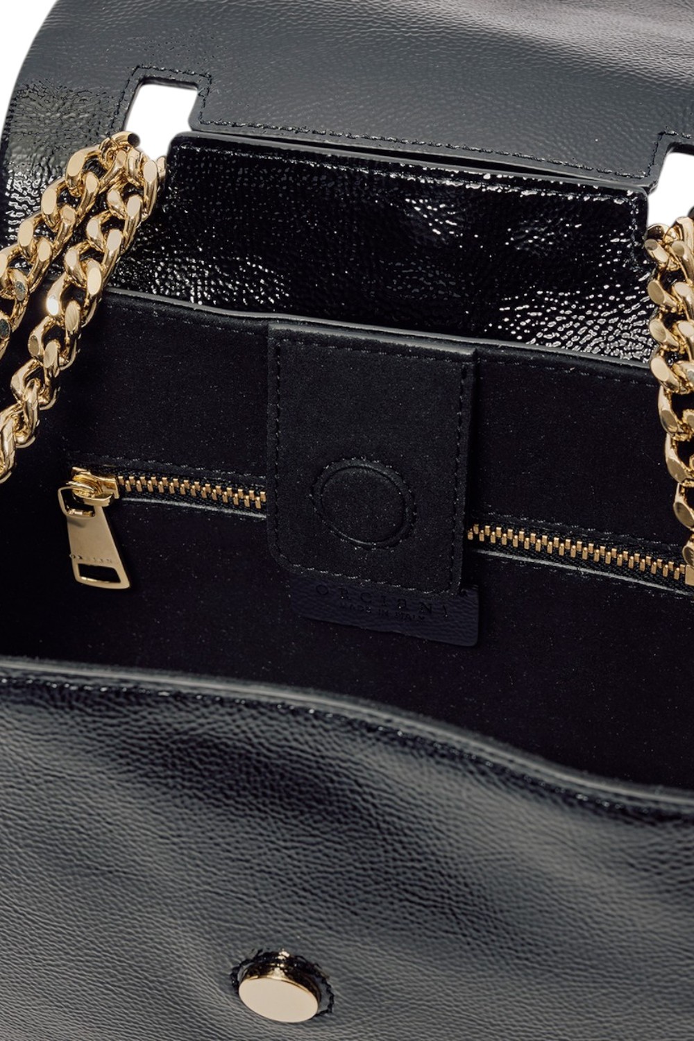 Orciani medium Sveva bag in Naplak leather. Dimensions: Width: 8 inches / Height: 6 inches / Depth: 3 inches. Pockets: 3 internal, one with zip. Closure: flap with magnetic buttons. Features: concealed opening at the top of the flap, chain shoulder straps with leather shoulder pad. Details: light gold finish metal hardware. Material: Naplak leather. Made in Italy.
