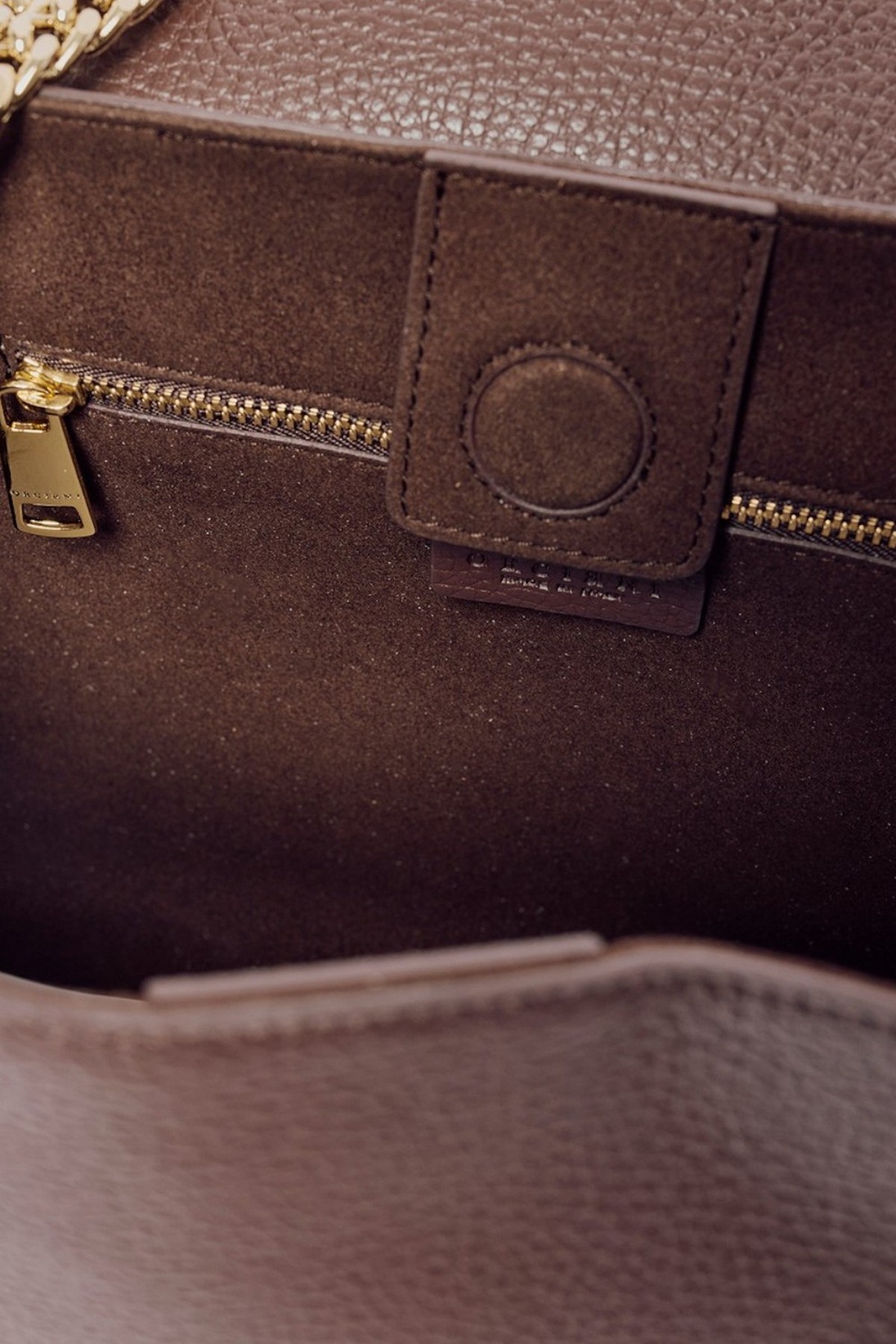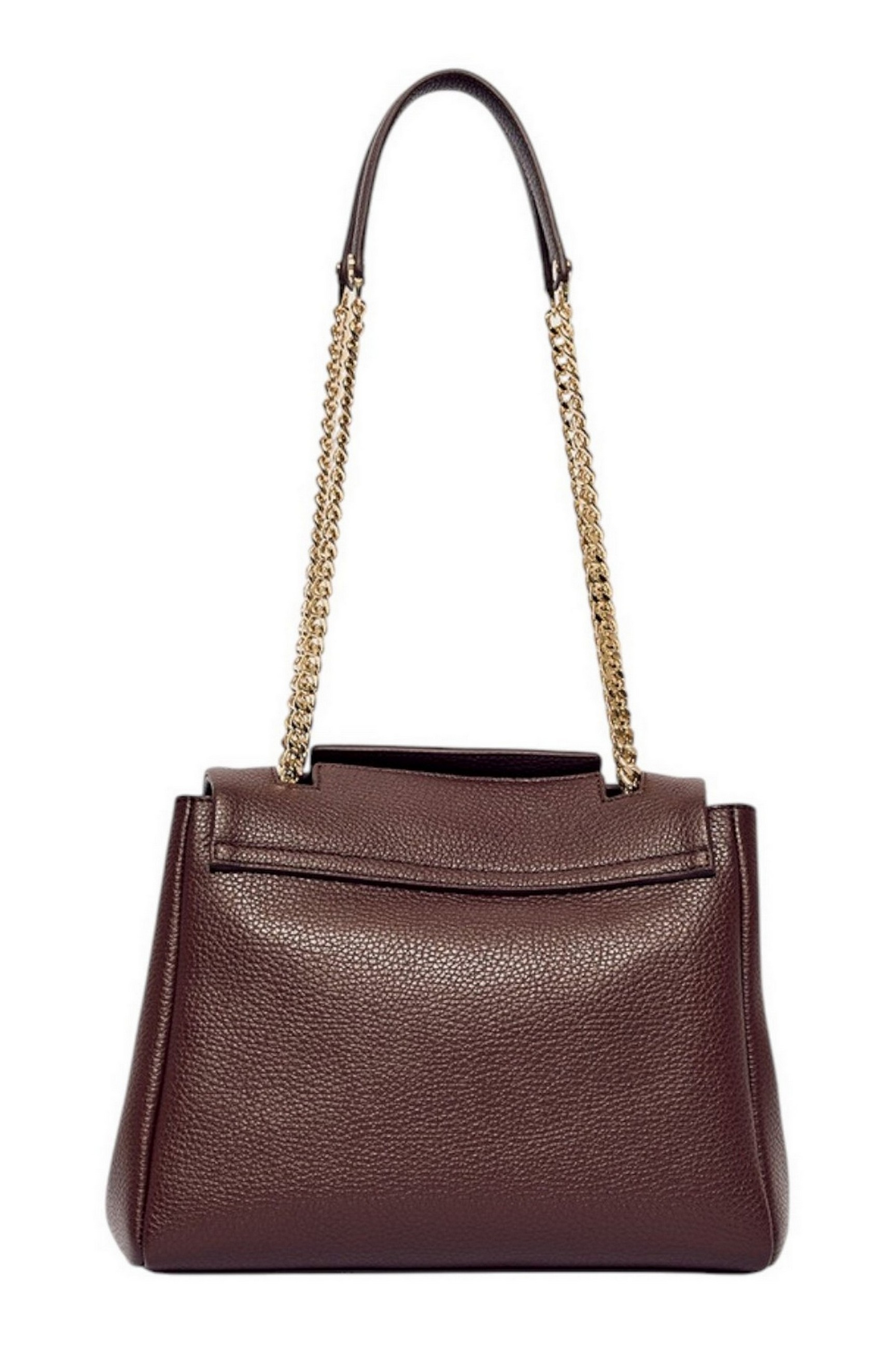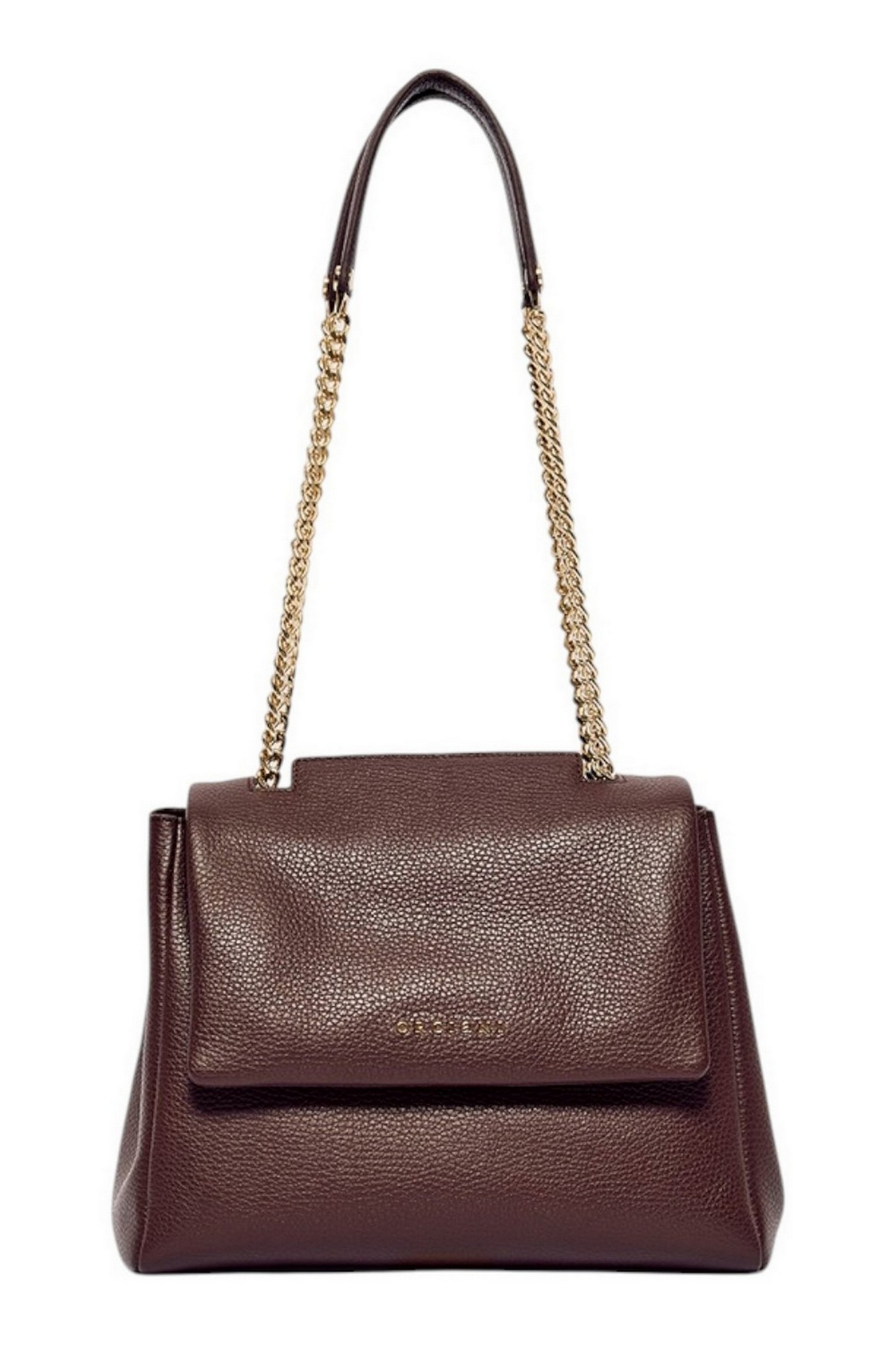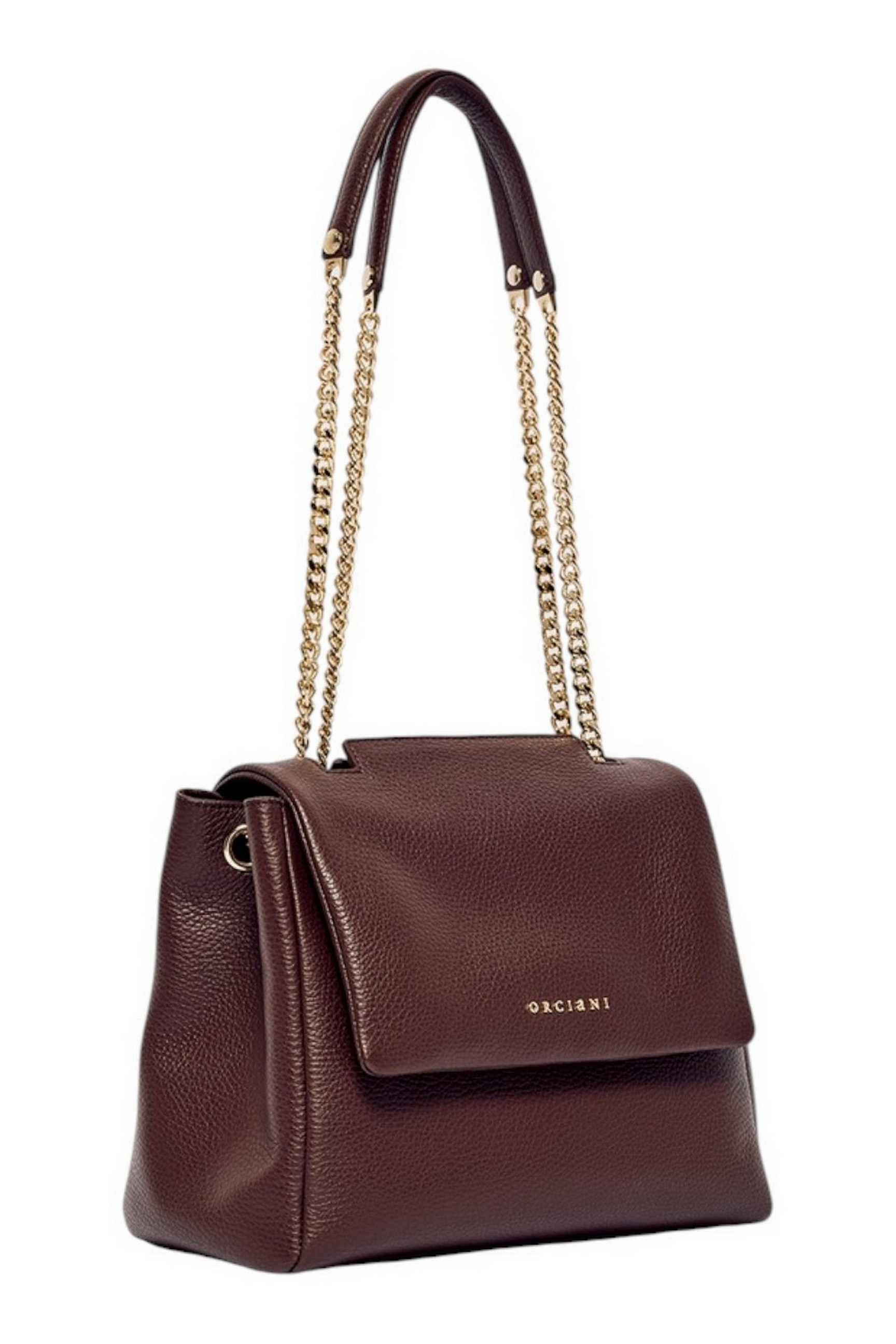 Orciani Sveva medium bag. Gotham material. Chain handles. Flap closure with magnetic button. Internal pockets. Dimensions: width 32 cm, height 24 cm, depth 15 cm. Made in Italy. Ideal for those looking for practicality and style, perfect for travel or everyday use. Can be paired with designer bags or colorful garments. Strictly Made in Italy, manufacturing excellence. This bag represents the synthesis of practicality and fashion sense. Designed to combine practicality and elegance in every detail.