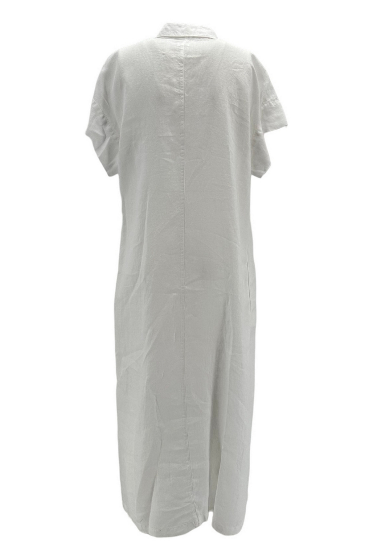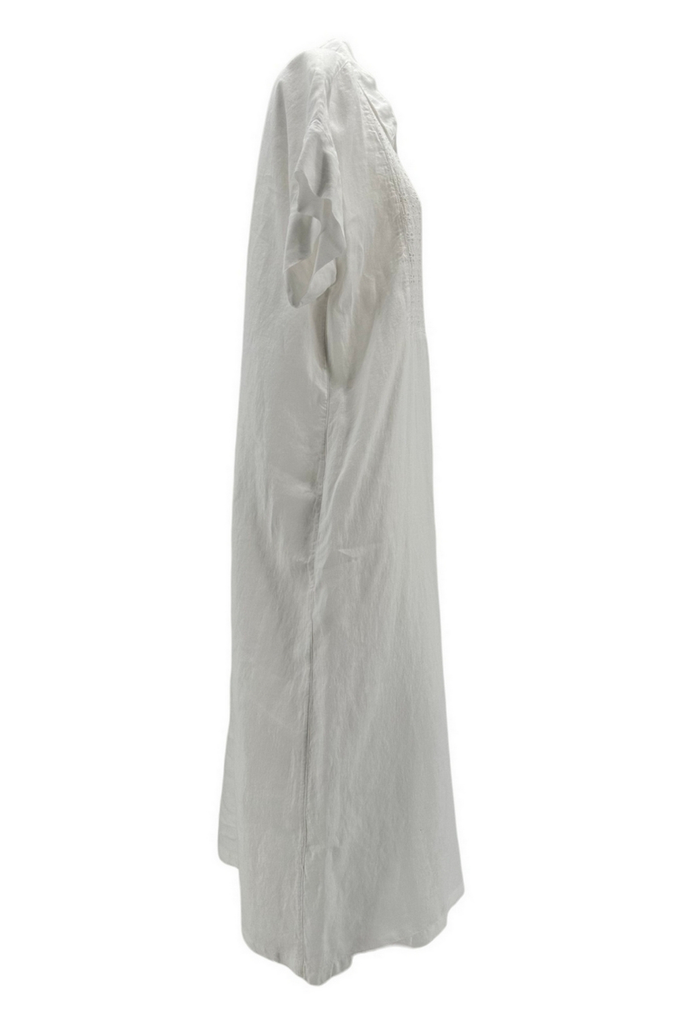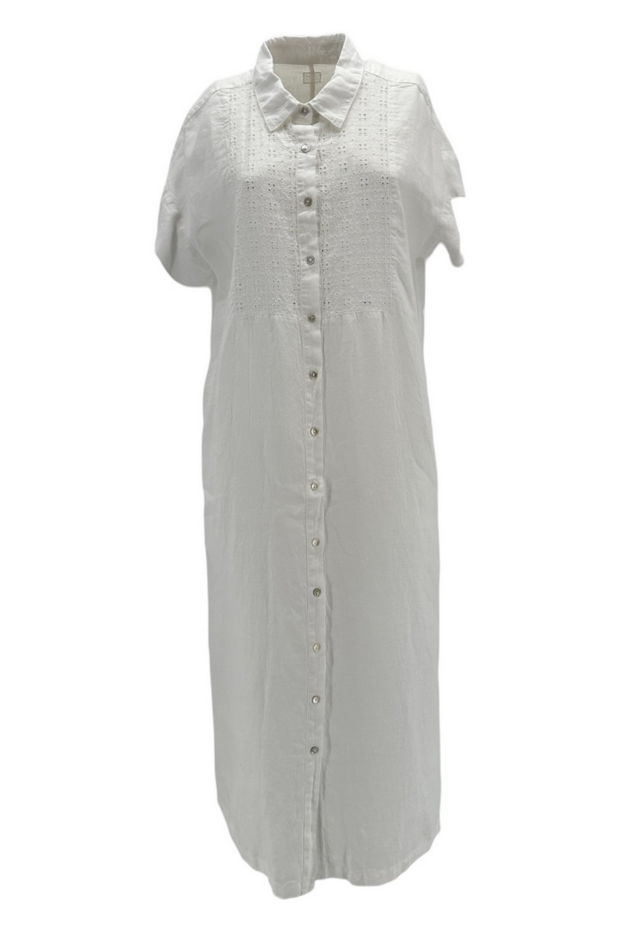 Abito 120% Lino. Modello chemisier, mezza manica, dettagli in sangallo sul davanti, tasche. Vestibilità morbida. Composizione: 100% lino.