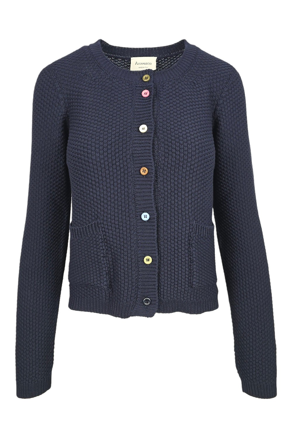 Cardigan di A rovescio. Girocollo. Chiusura con bottoncini multicolor. Lavorazione grana di riso. Vestibilità regolare. Composizione: 100% cotone. Made in Italy.