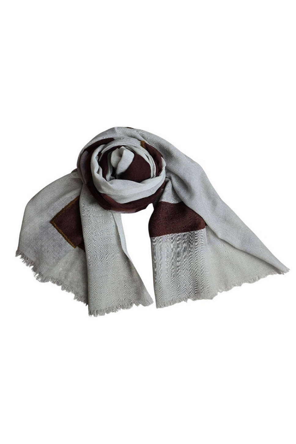 Sciarpa Altea. Fantasia geometrica. Dettagli frangine. Composizione: 100% lana. Dimensioni: 100 x 200 cm. Made in Italy.