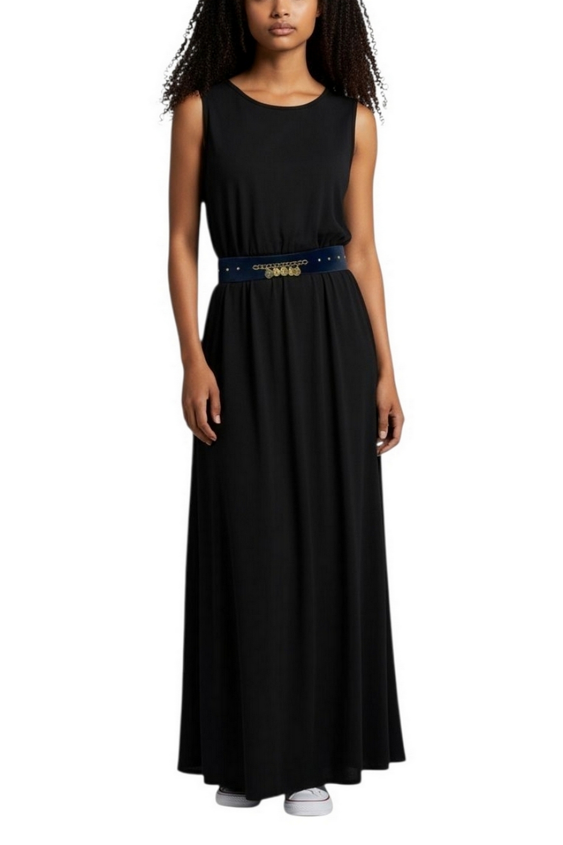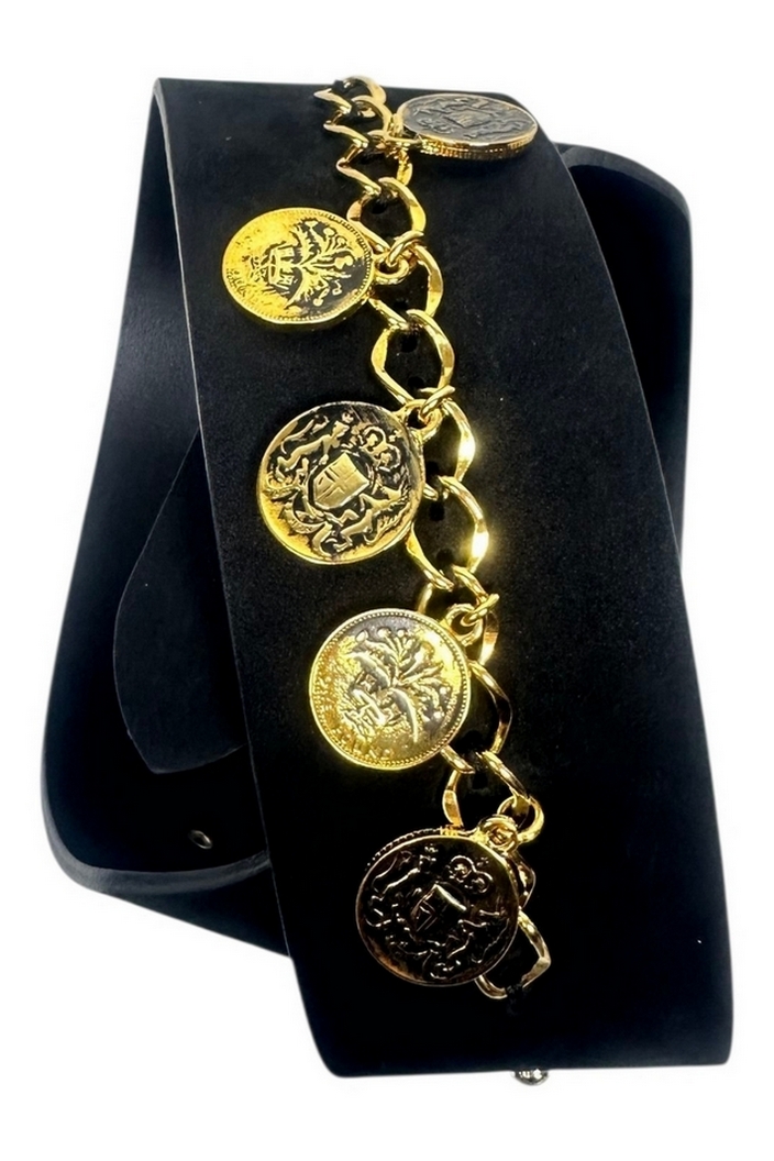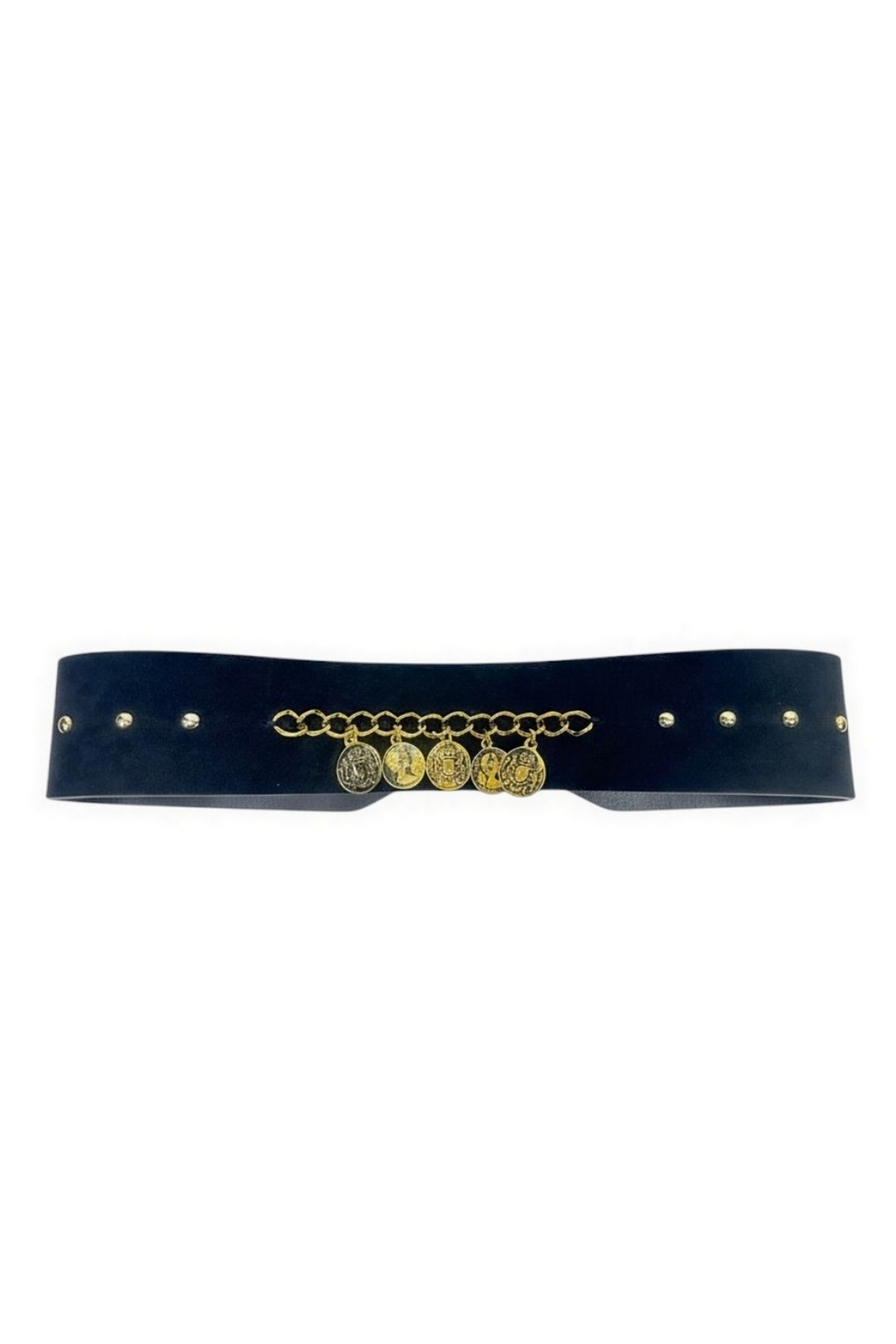 Cintura di BaxLab Milano in pelle scamosciata. Dettagli catena con medagliette e borchie. Altezza 6 cm. Made in Italy. Prodotto rigorosamente Made in Italy, eccellenza manifatturiera.