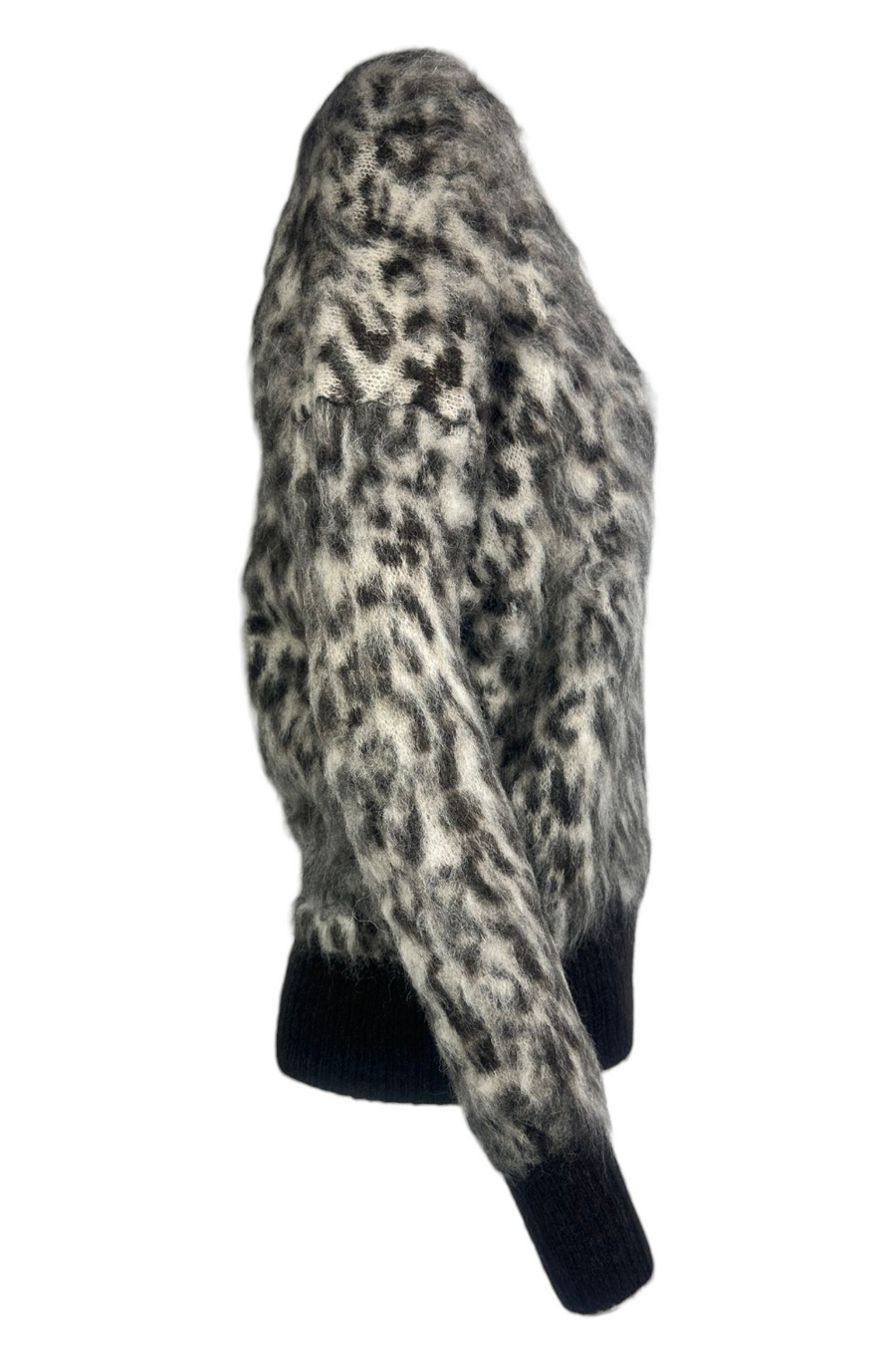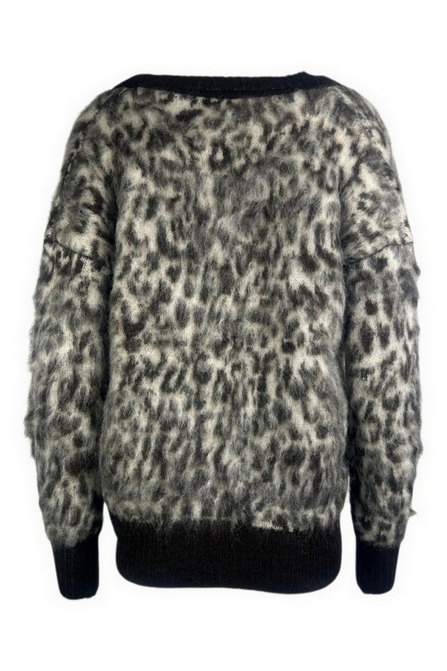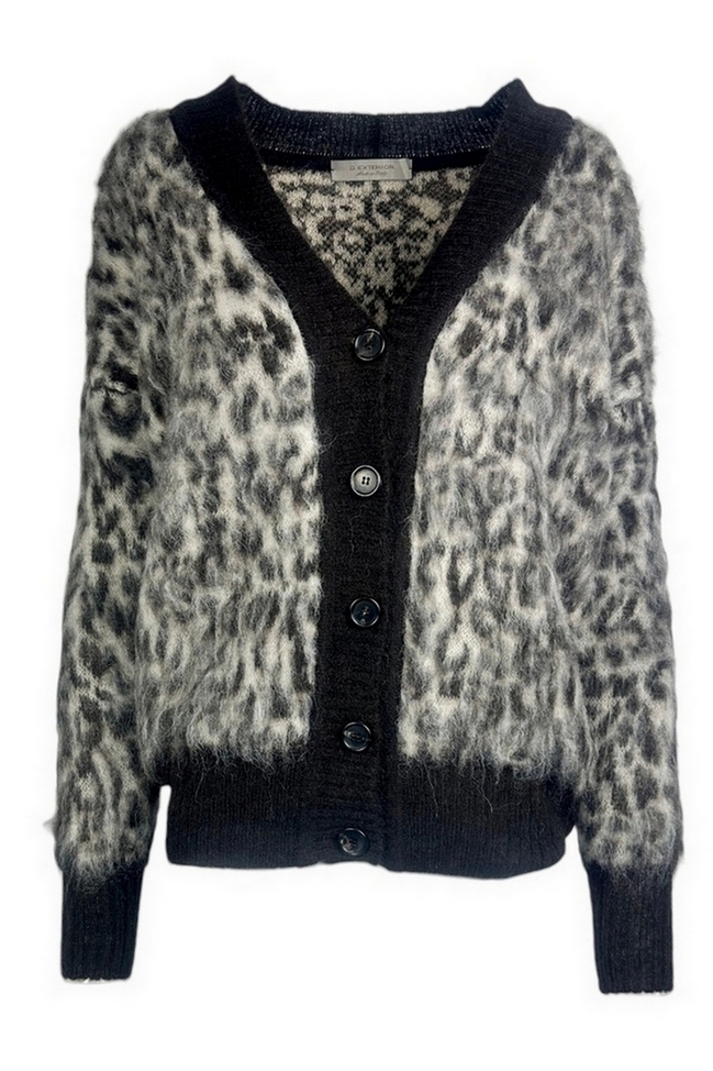 Cardigan D. Exterior. Scollo a v. Fantasia animalier. Profili a contrasto. Maniche lunghe. Chiusura con bottoni sul davanti. Vestibilità over. Composizione: 41% lana, 30% alpaca, 28% poliammide, 1% poliestere. Made in Italy.