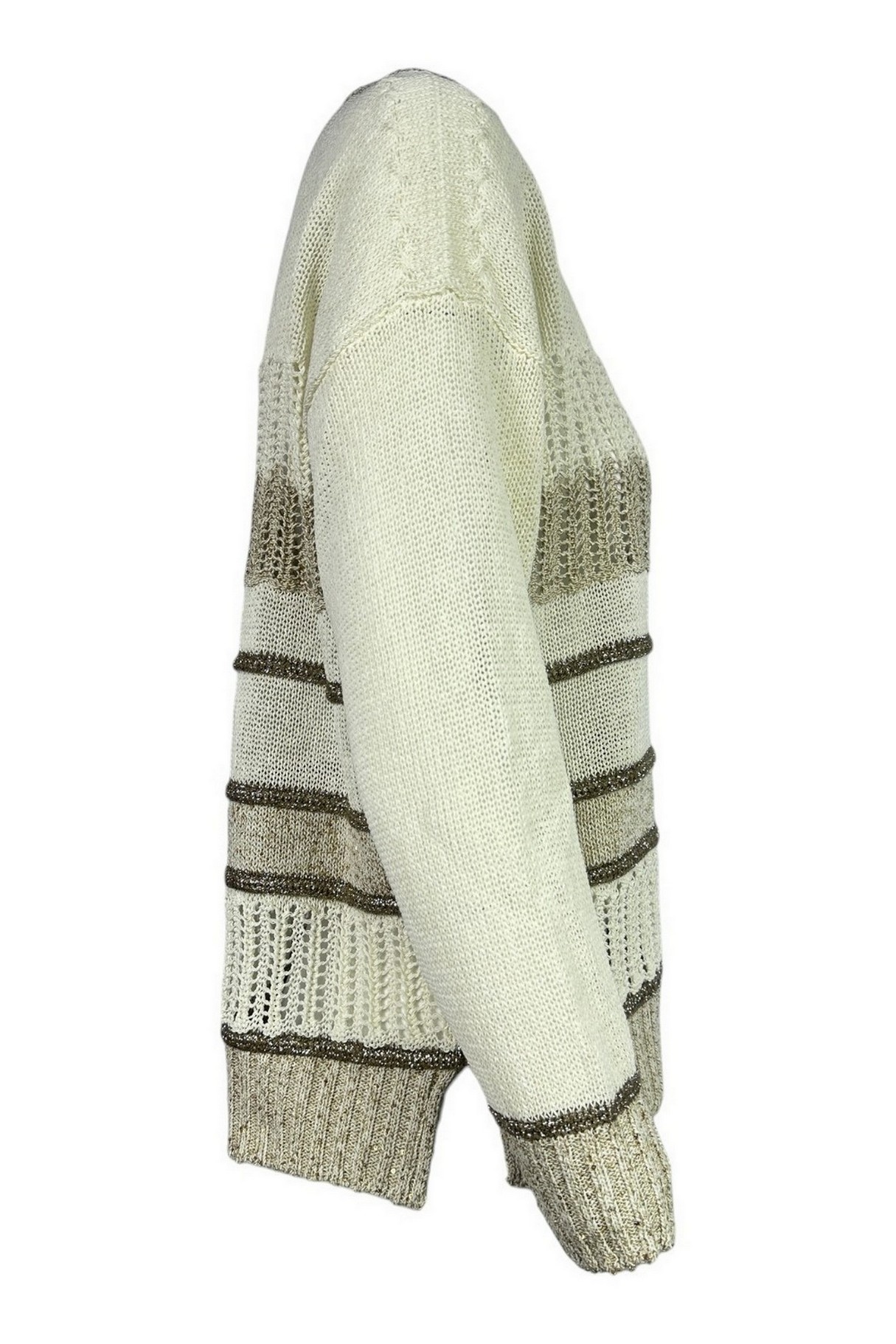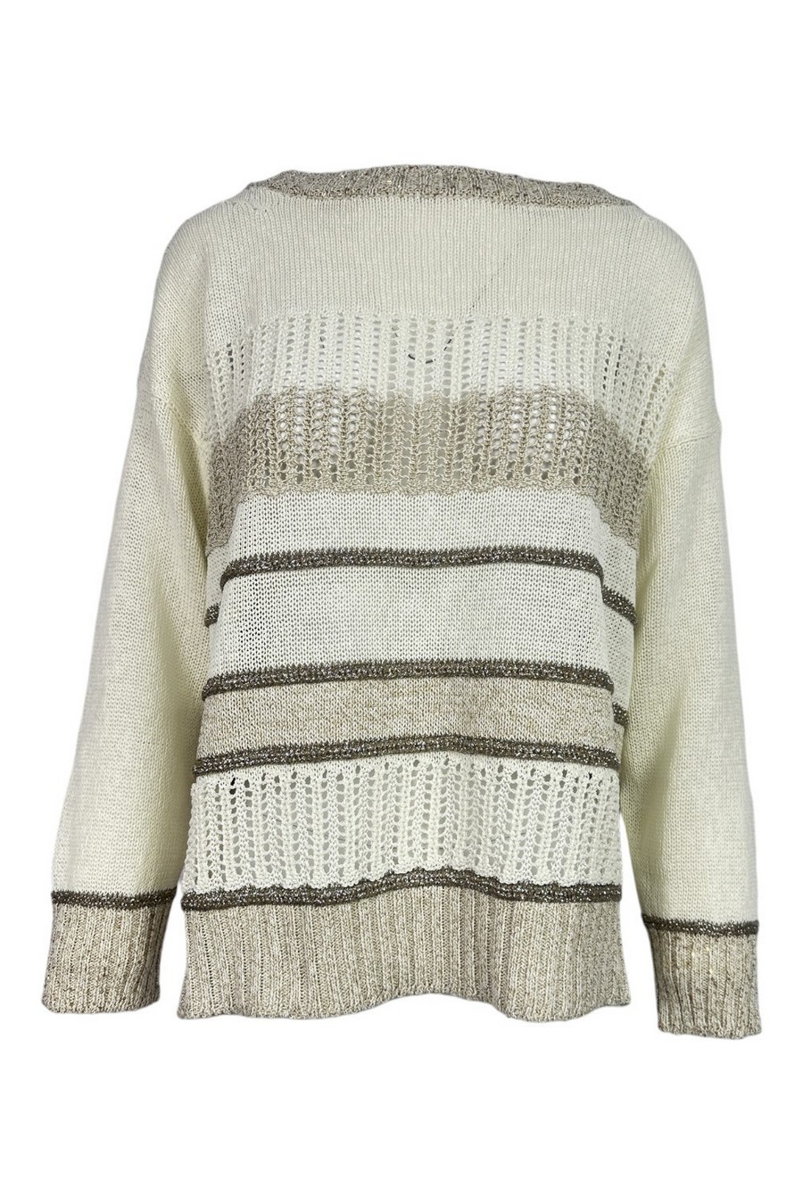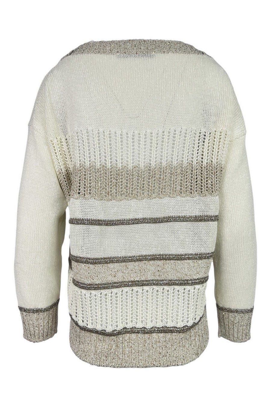 Maglia di D.Exterior. Girocollo. Dettagli lurex e traforati. Spacchi sul fondo. Vestibilità morbida. Composizione: 13% VI, 58% CO, 13% PL, 13% PA, 2% PLM, 1% AF. Made in Italy.
