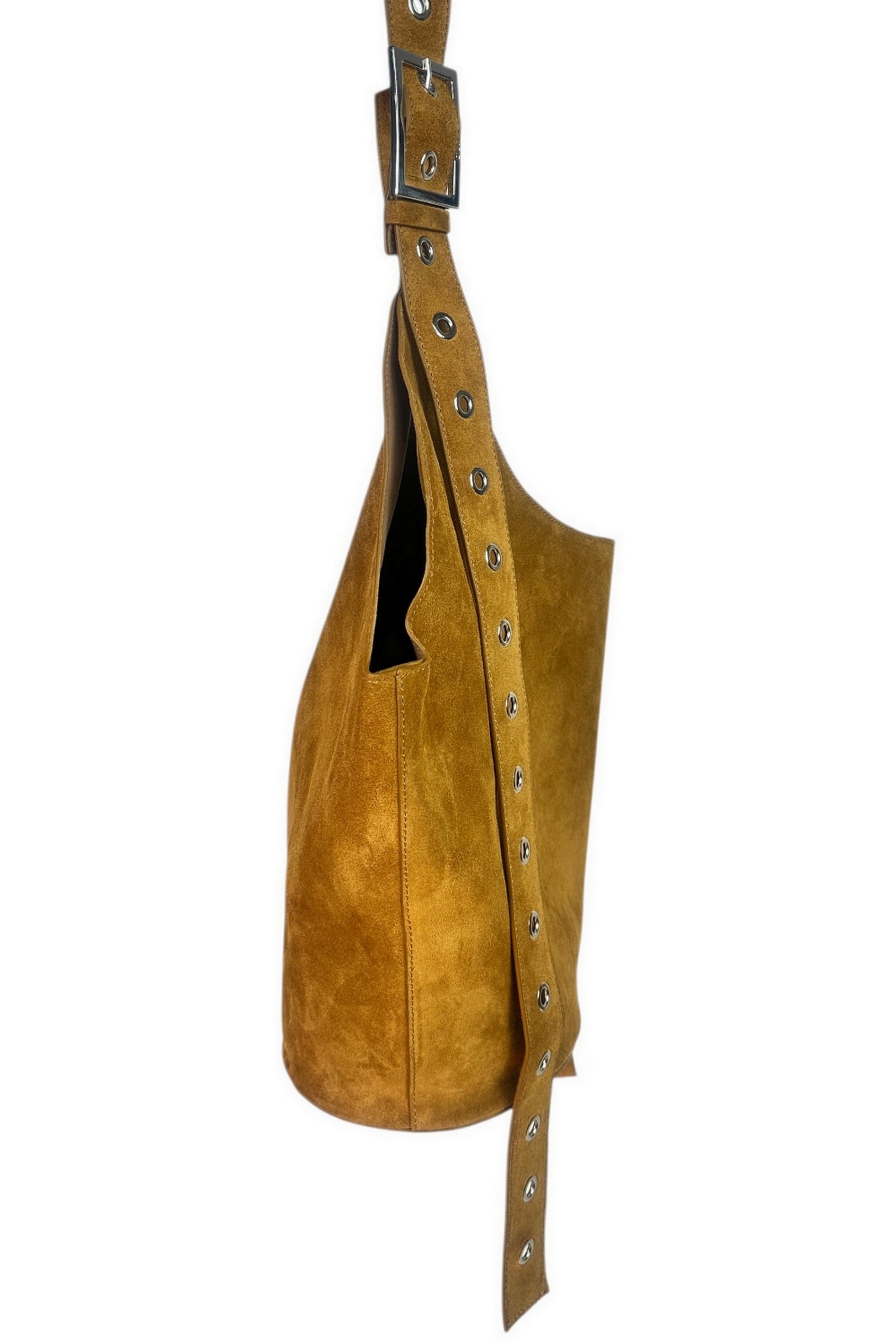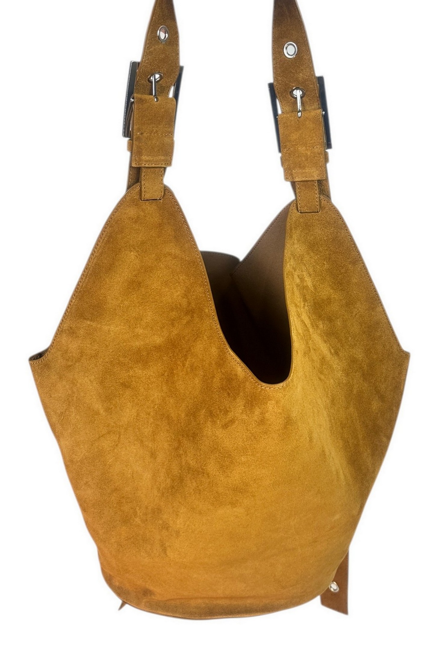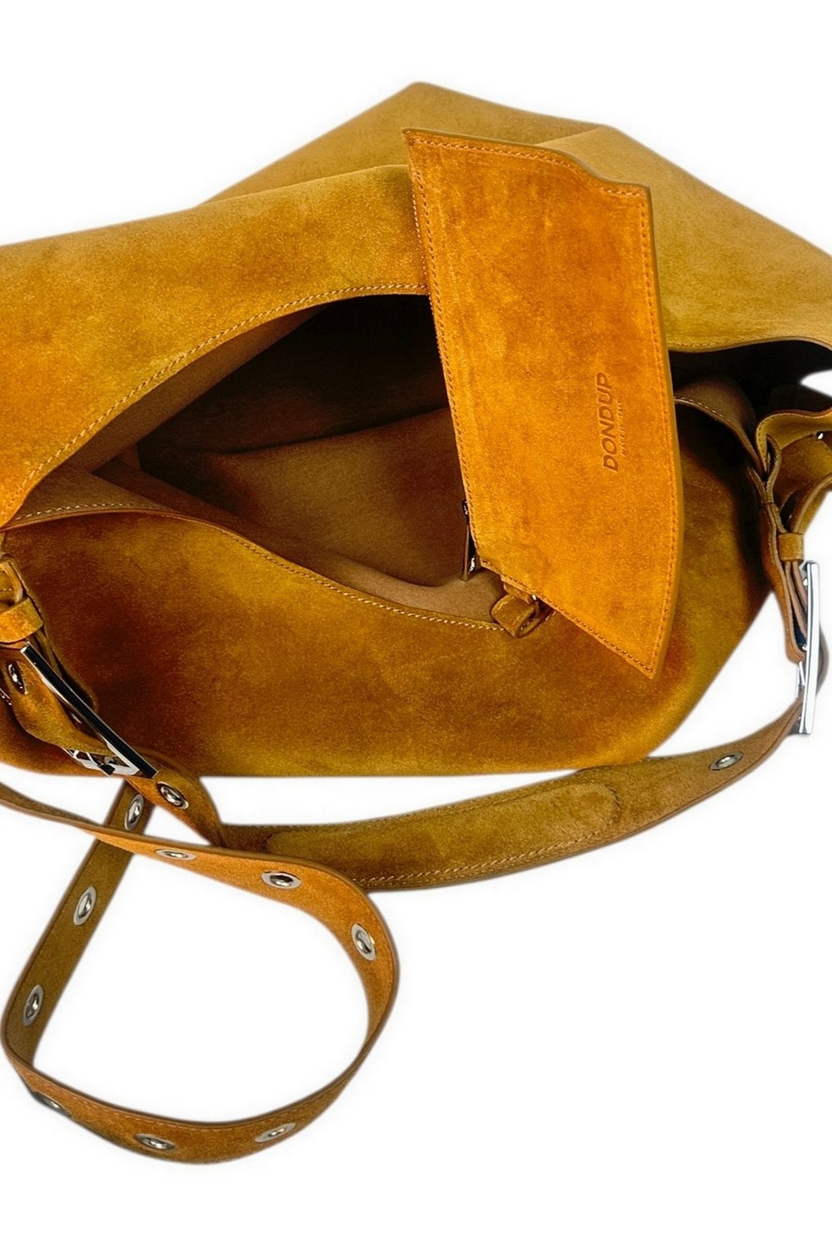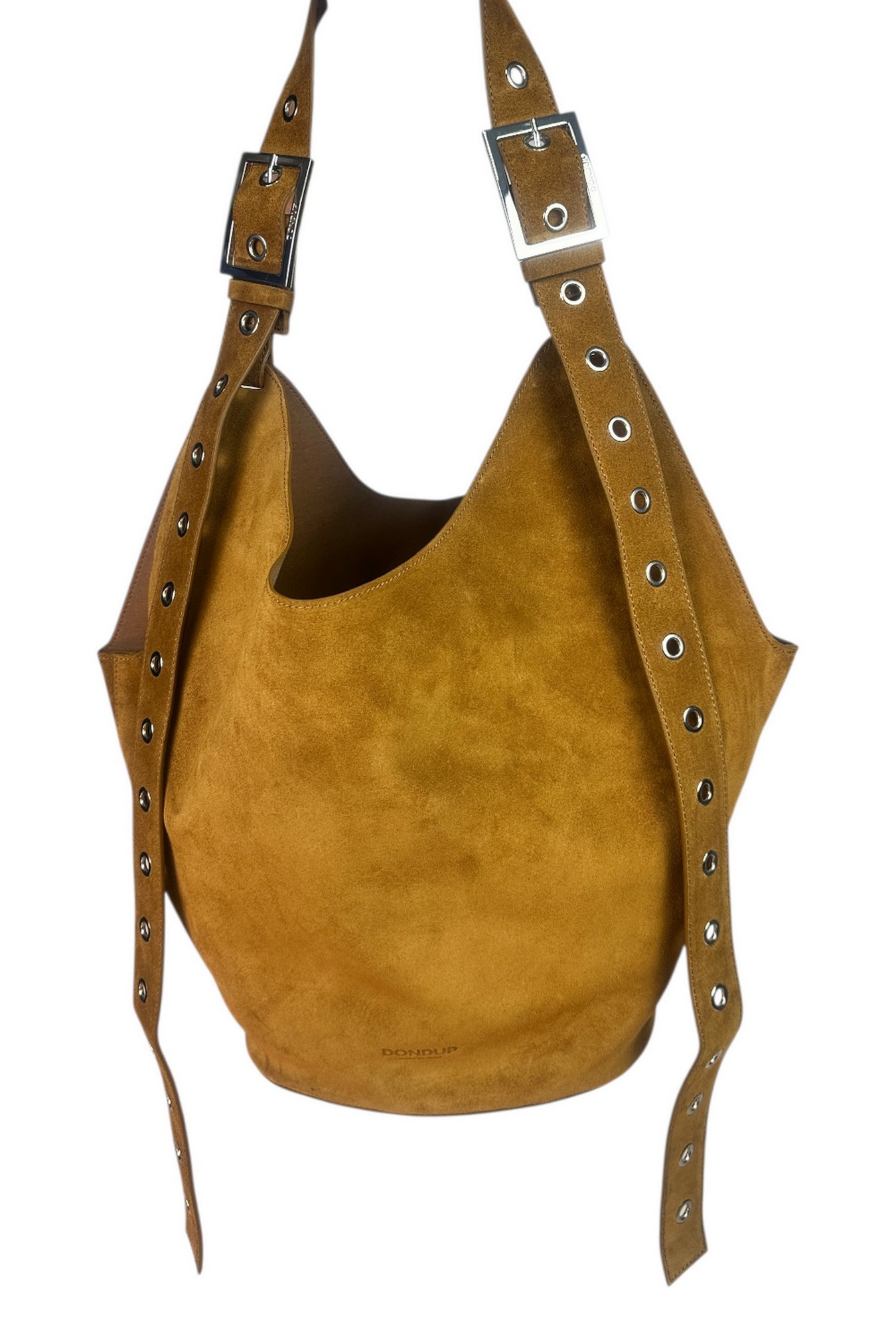 Bisaccia di Dondup. Tracolla con borchie. Pelle scamosciata. Pochette all'interno. Dimensioni: Altezza 31 cm, larghezza 47 cm., profondità 24 cm. Made in Italy.