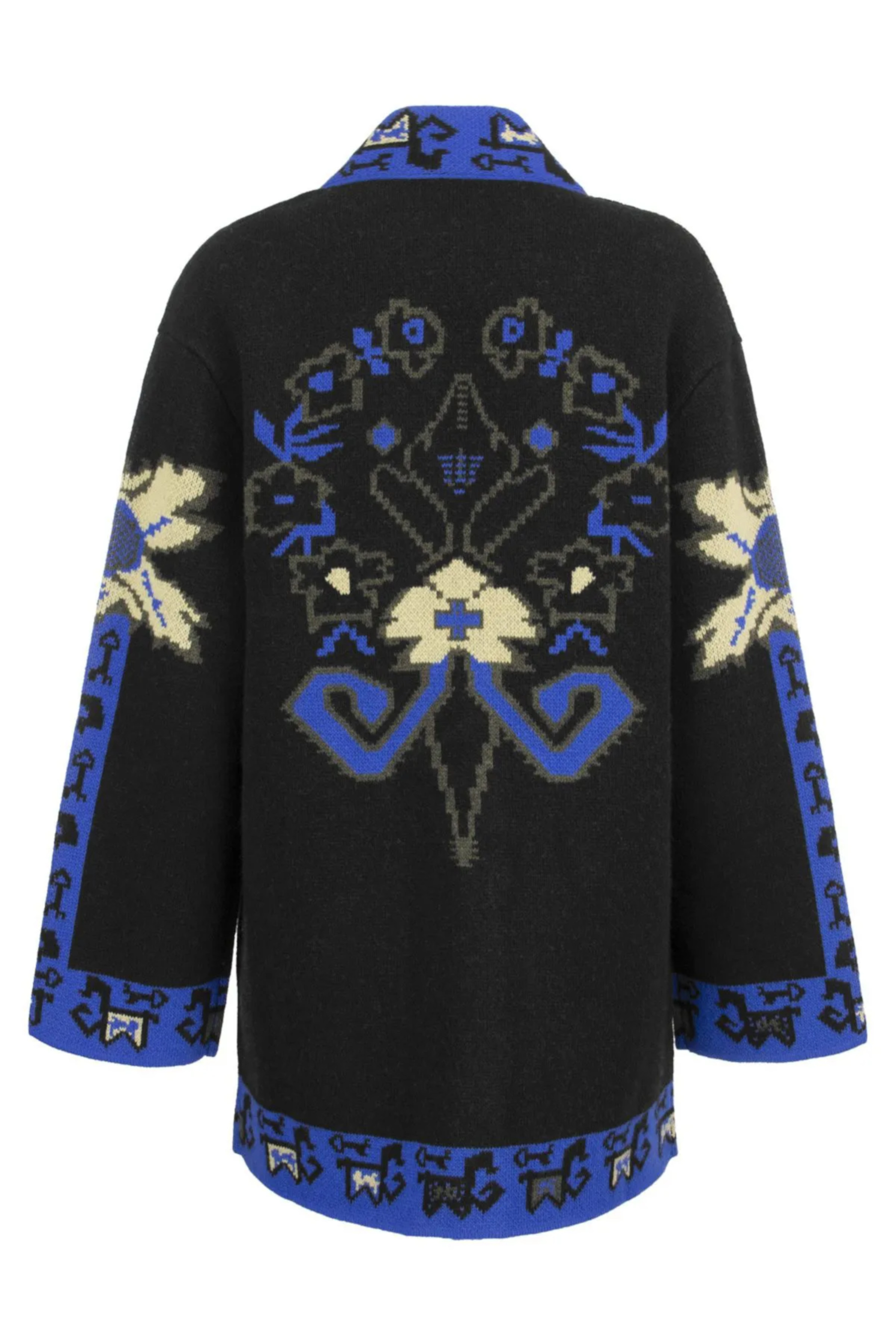 Cappotto in maglia di lana jacquard con motivi geometrici piazzati e impreziosito da bottoni con Pegaso.