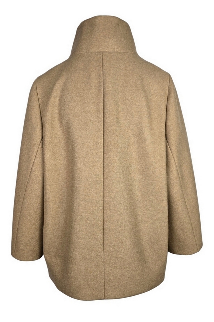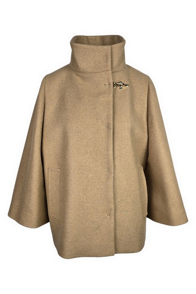 Cappa di Fay con linee geometriche e costruzione essenziale che riprende l'ampio collo avvolgente dell'iconico cappotto Virginia. Caratterizzata da maniche a tre quarti e gancio Fay, è realizzata in panno misto lana tinto in filo, con tasche a filo laterali e chiusura con automatici nascosti. Made in Italy. Fitting: regular. Composizione capo: 70% lana, 30% poliammide, fodera 62% acetato, 38% poliestere