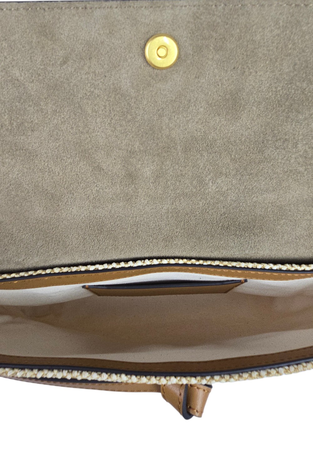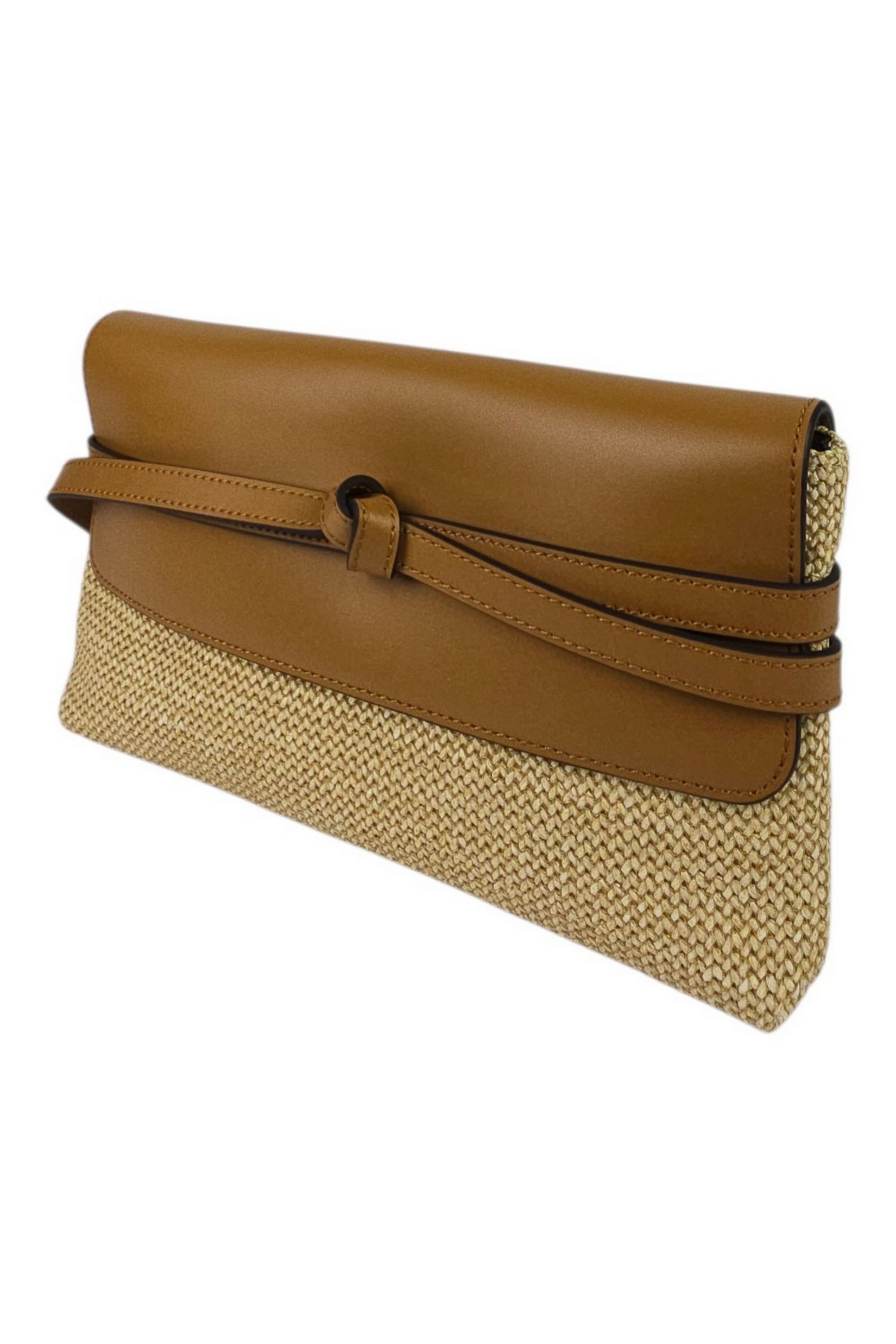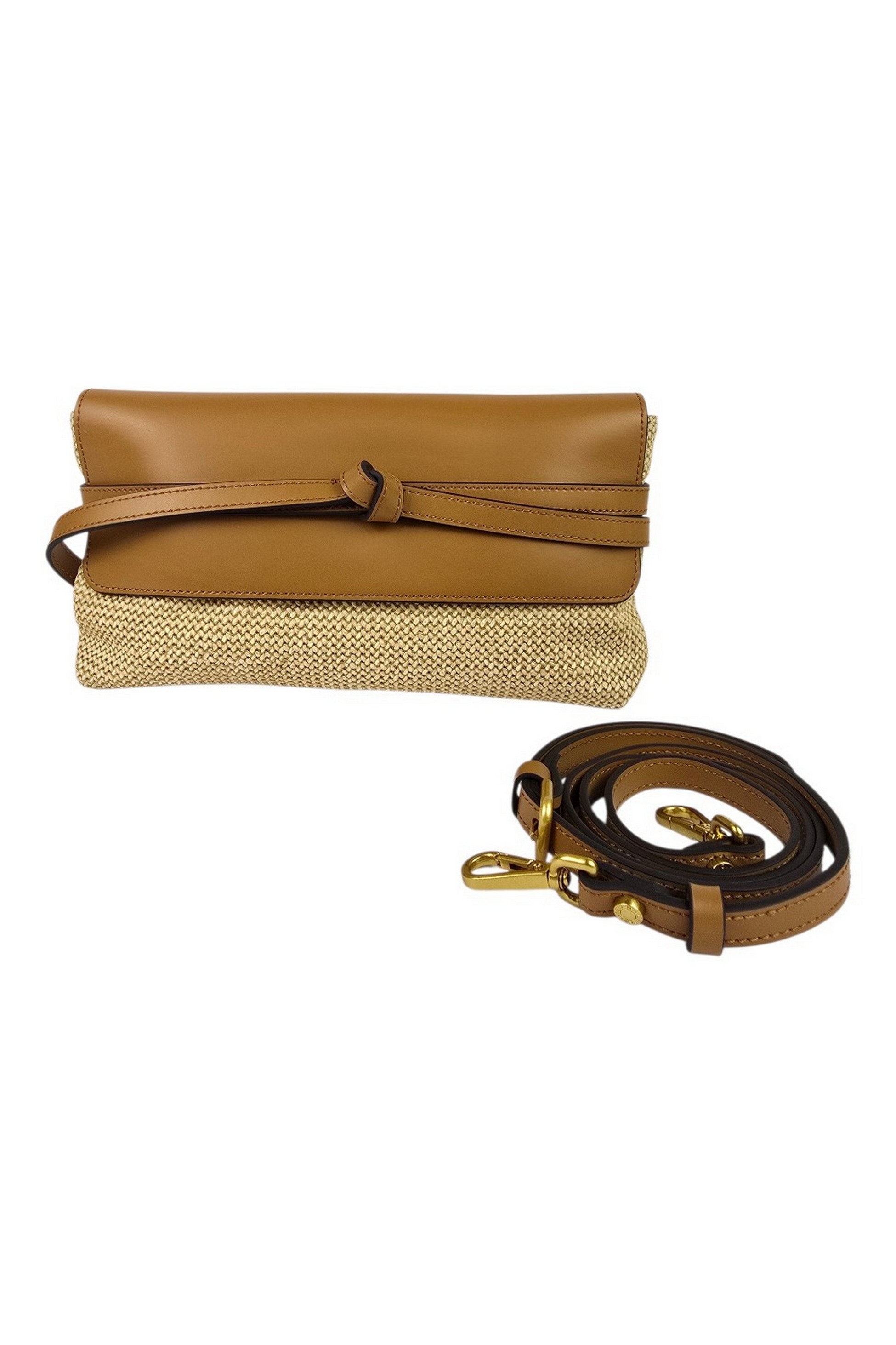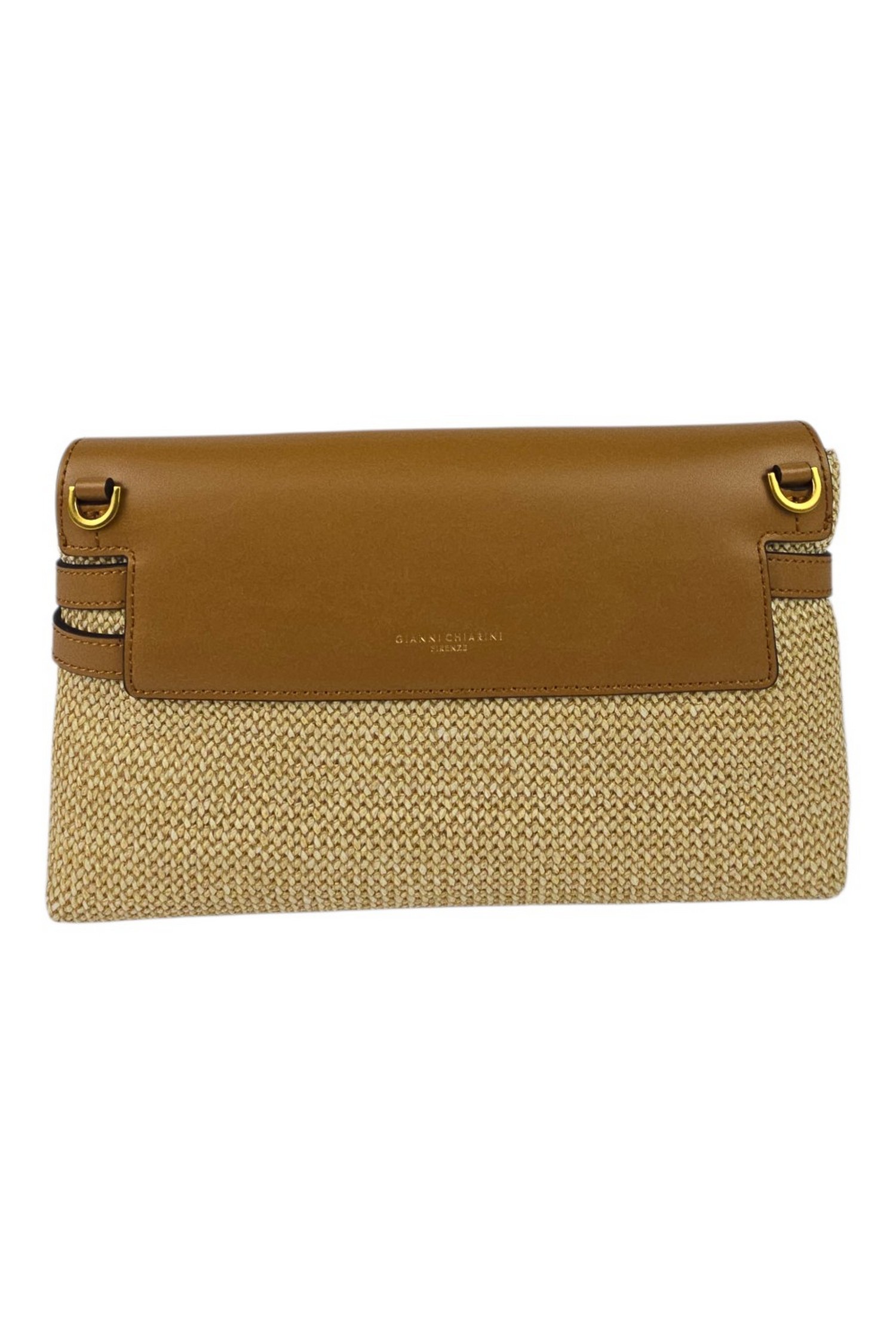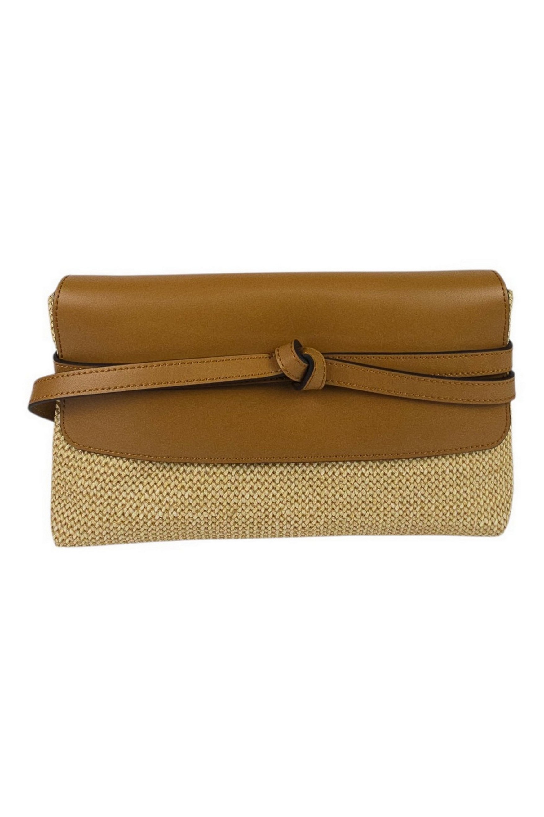 Borsa tracollina Belty di Gianni Chiarini Firenze, realizzata in paglia e arricchita da dettagli in pelle. Il dettaglio distintivo è il laccio che avvolge la borsa come una cintura, creando un elegante nodo decorativo sul davanti.