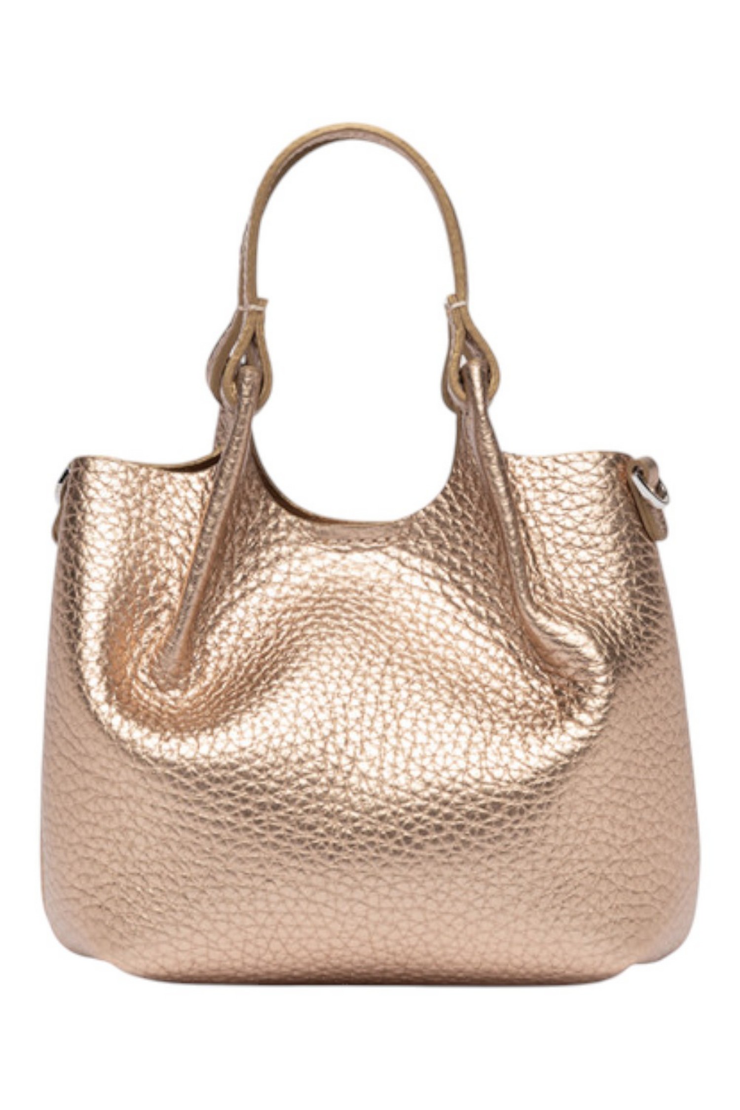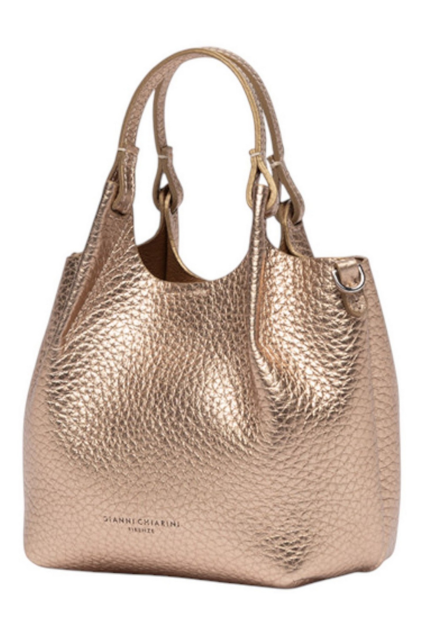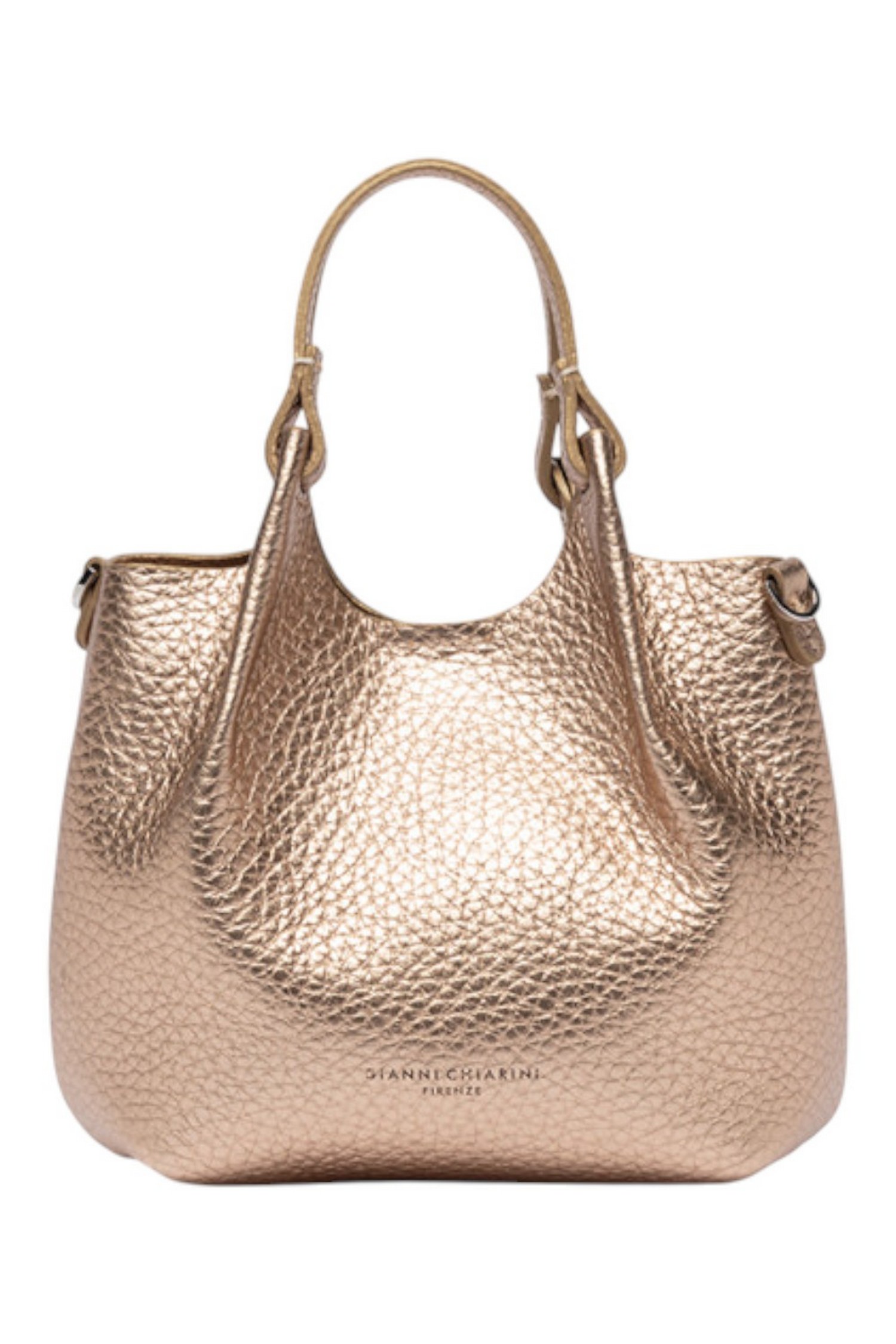 Borsa DUA di Gianni Chiarini realizzata in pelle bubble double, caratterizzata da una texture unica. Dotata di un monoscomparto sfoderato, presenta profili superiori in pelle martellata e doppi manici in tono. Pratica ed essenziale, è perfetta per completare ogni look con stile. Può essere portata a mano o a spalla. Dimensioni: 19x20x8 cm.