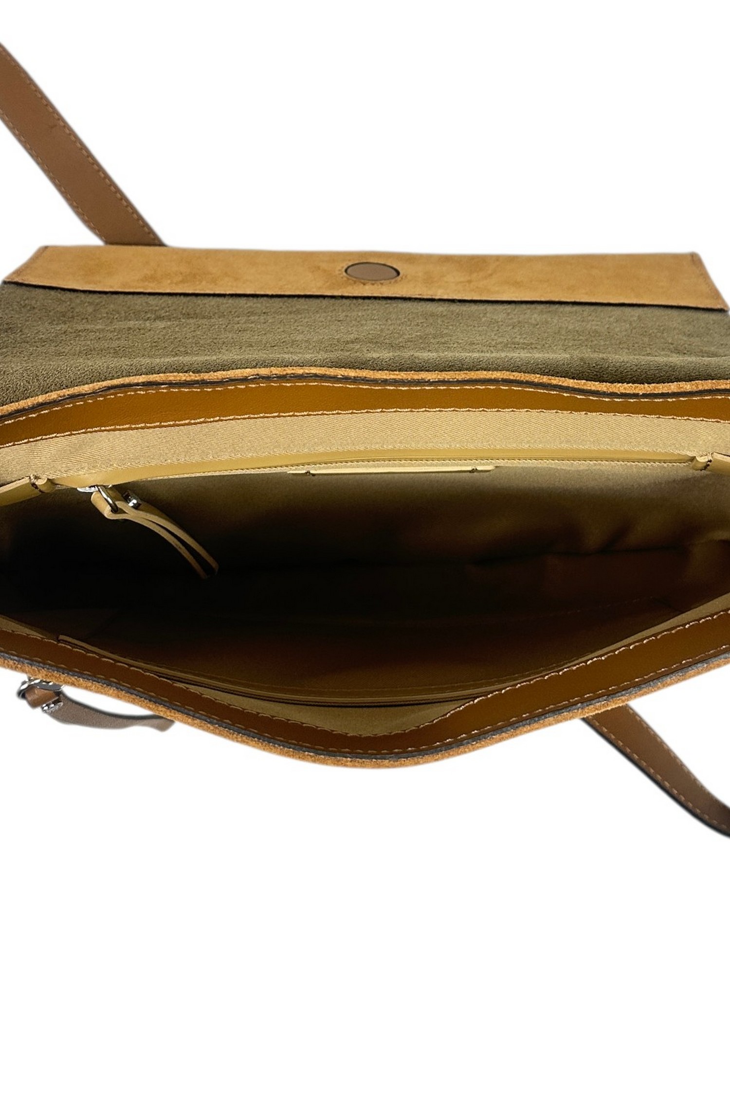 Borsa di Gianni Chiarini modello Elisa in pelle scamosciata. Cuciture a contrasto. Dettagli borchie oro e argento. Chiusura con patta e bottone magnetico. Tasca con zip sotto la patta. Tracolla regolare e removibile. Tasca interna con zip. Dimensioini: larghezza 31 cm, altezza 24 cm, profondità 3 cm. Made in Italy.