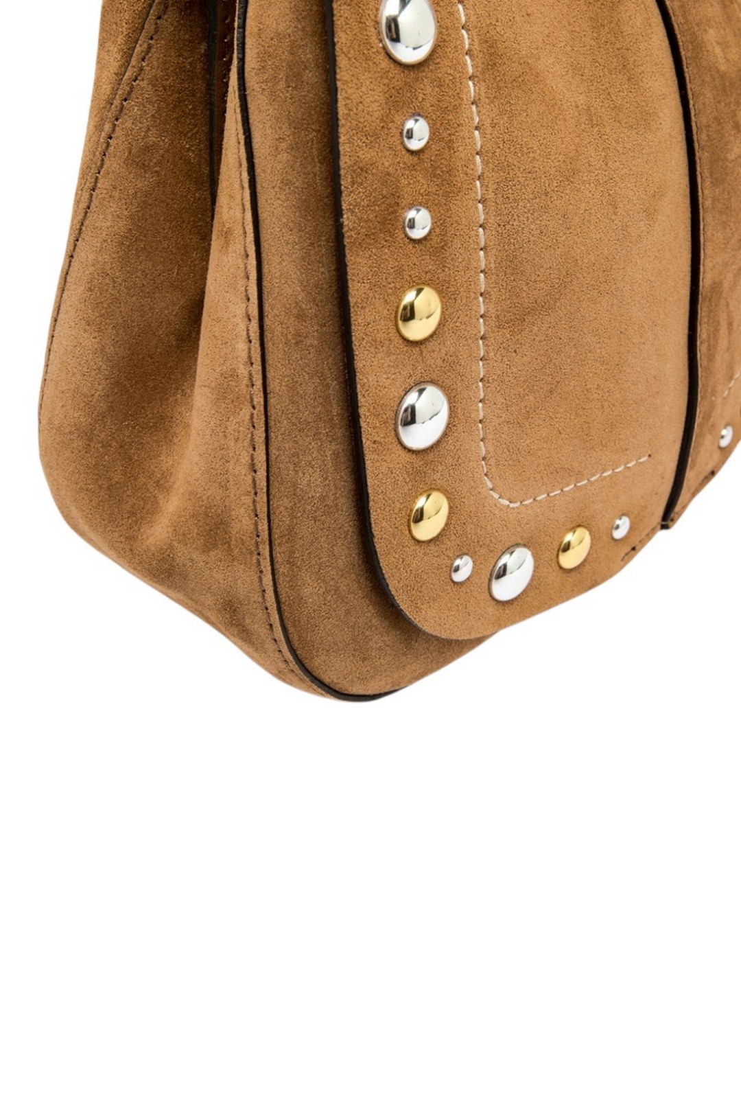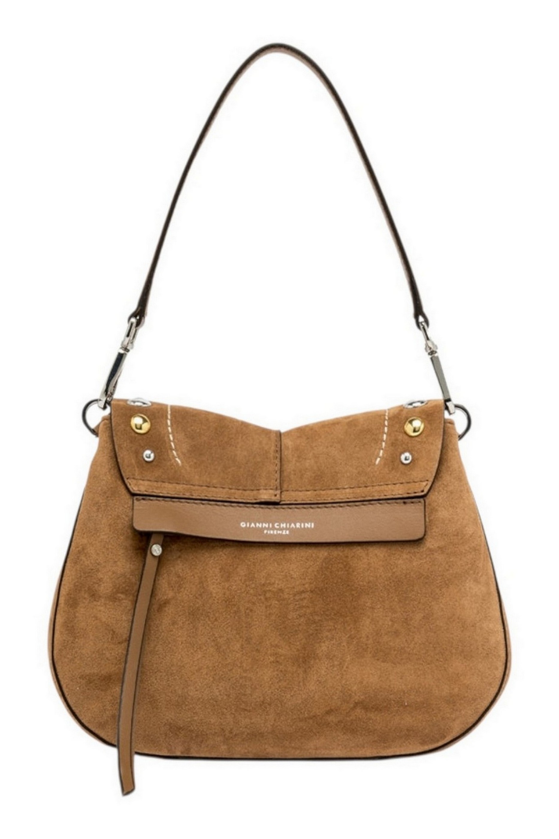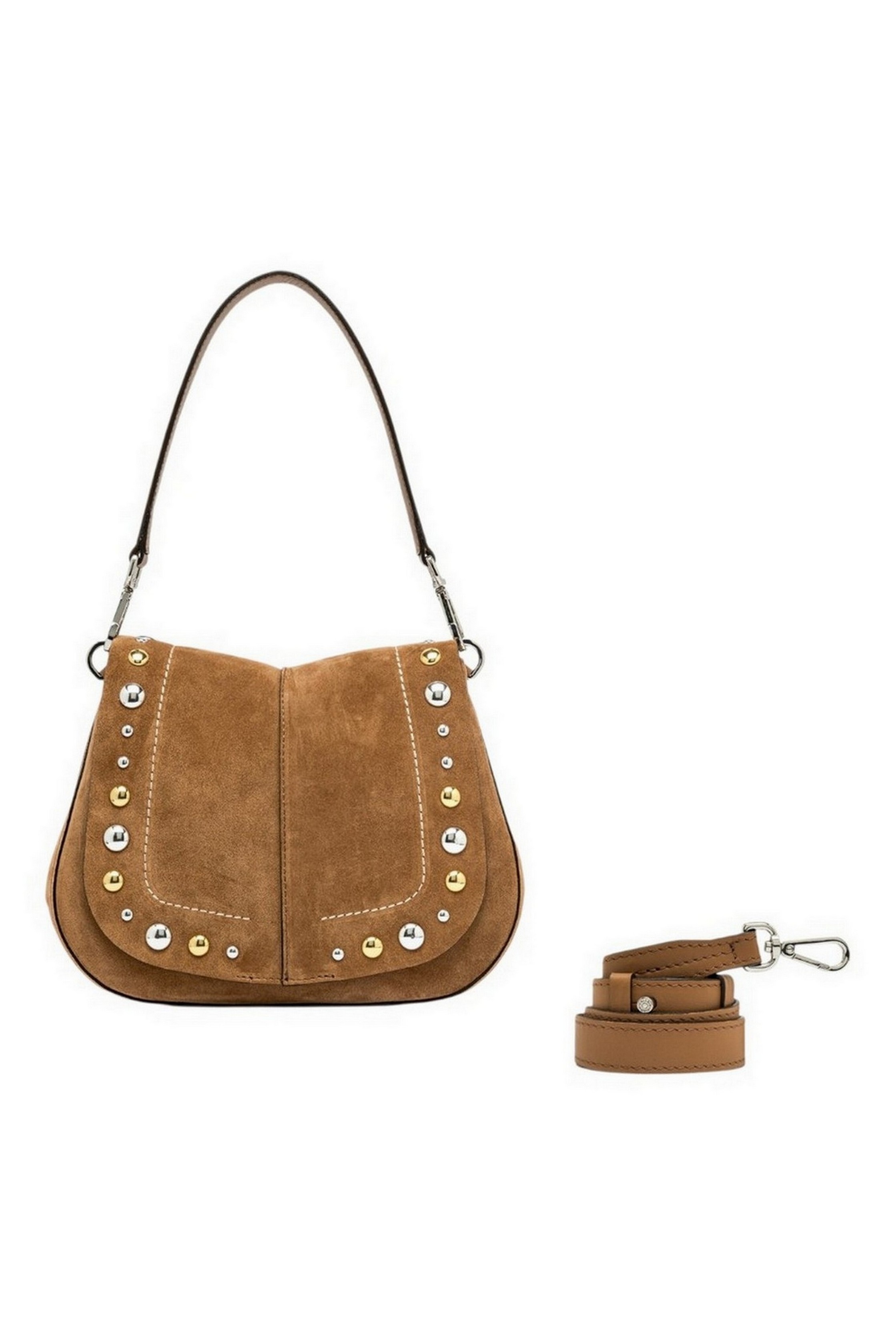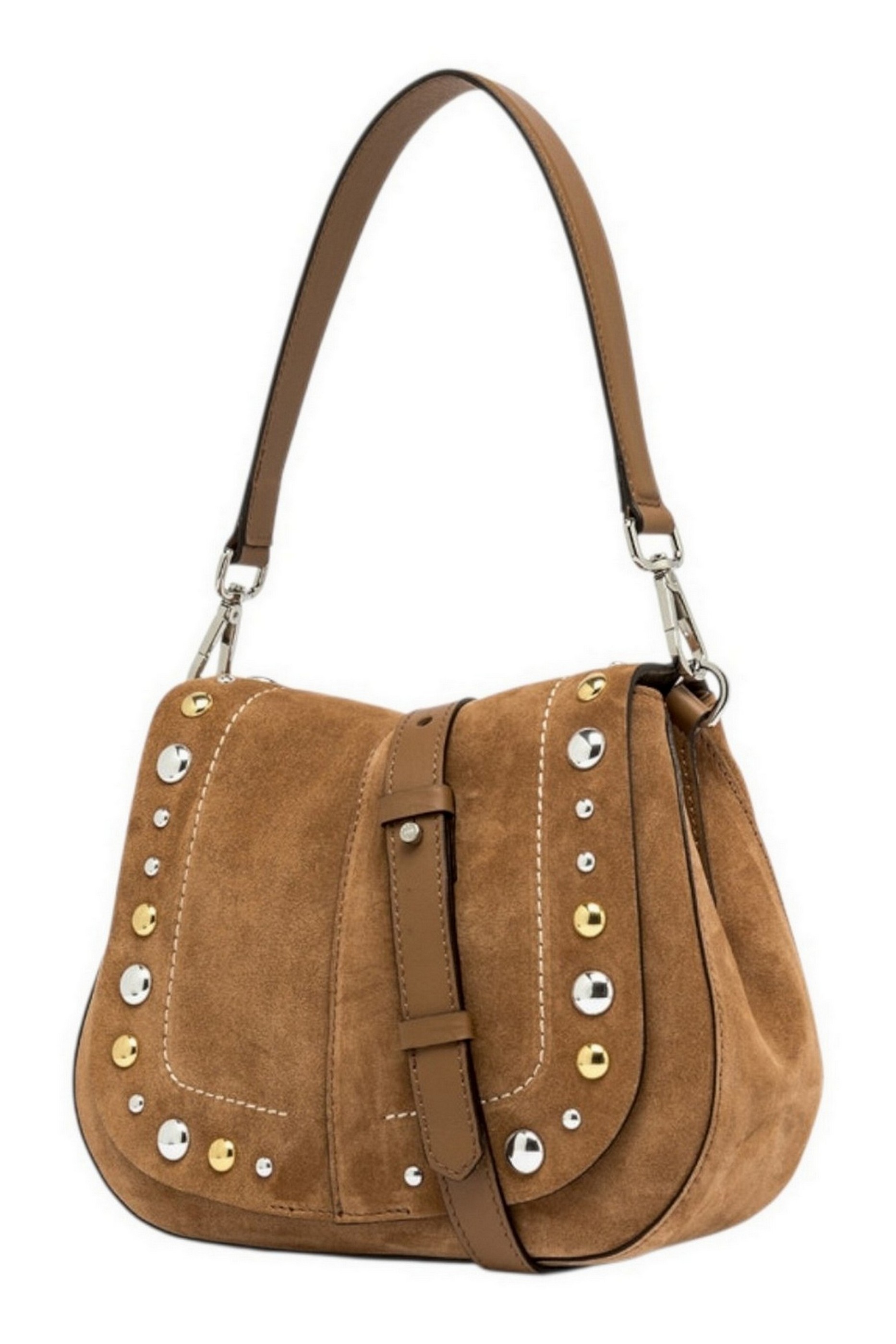 Borsa modello Helena Round by Gianni Chiarini Firenze, realizzata in pelle scamosciata, gioca con piacevoli contrasti grazie all'impuntura e alle borchie che le conferiscono un'anima Western. Dal design strutturato, con un appeal contemporaneo e chic, è dotata di uno spallotto removibile e tracolla per una doppia portabilità, a spalla o crossbody. Pratica e organizzata, presenta un doppio compartimento interno e una tasca a scomparsa sul retro. Dimensioni: 26x21x9 cm.