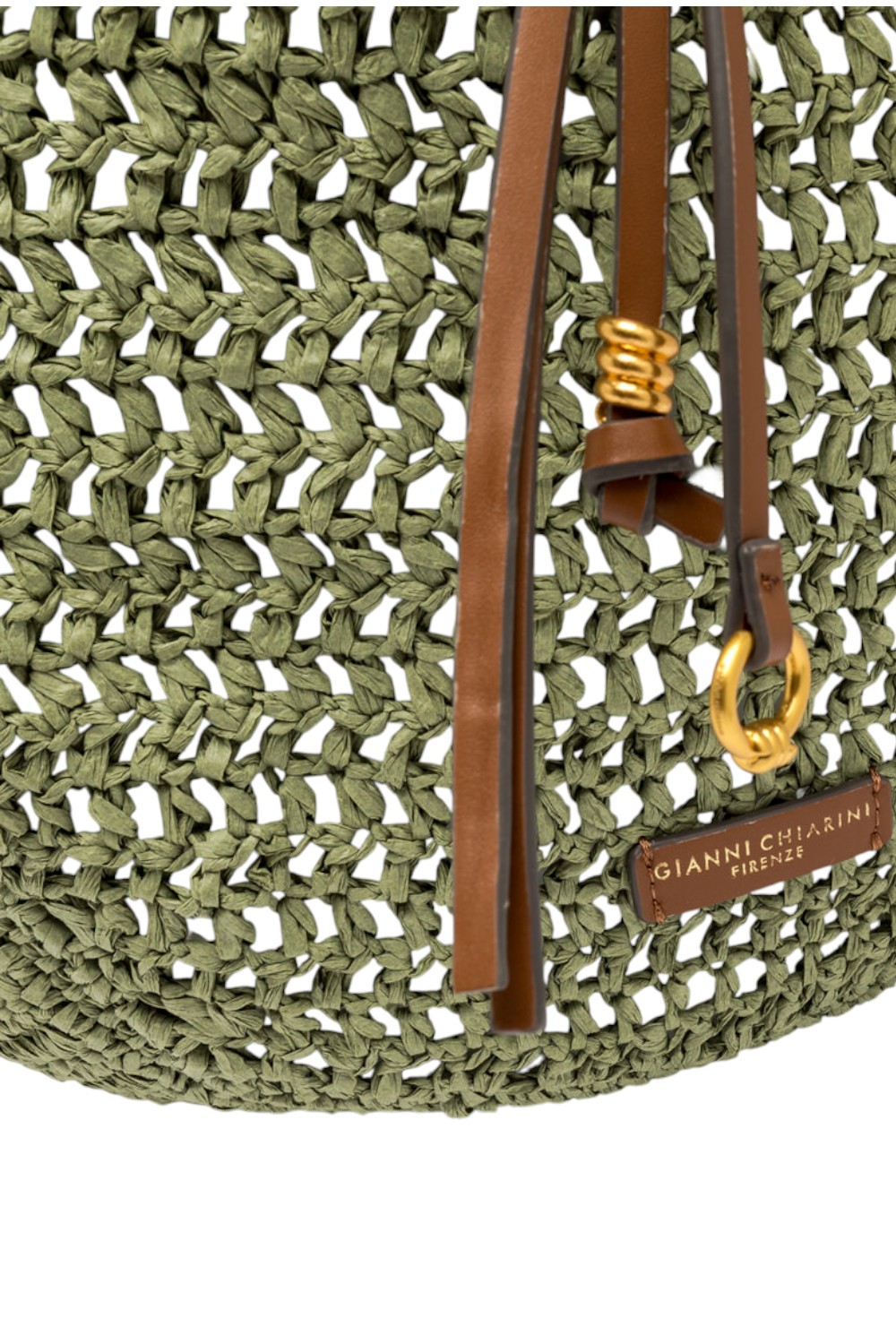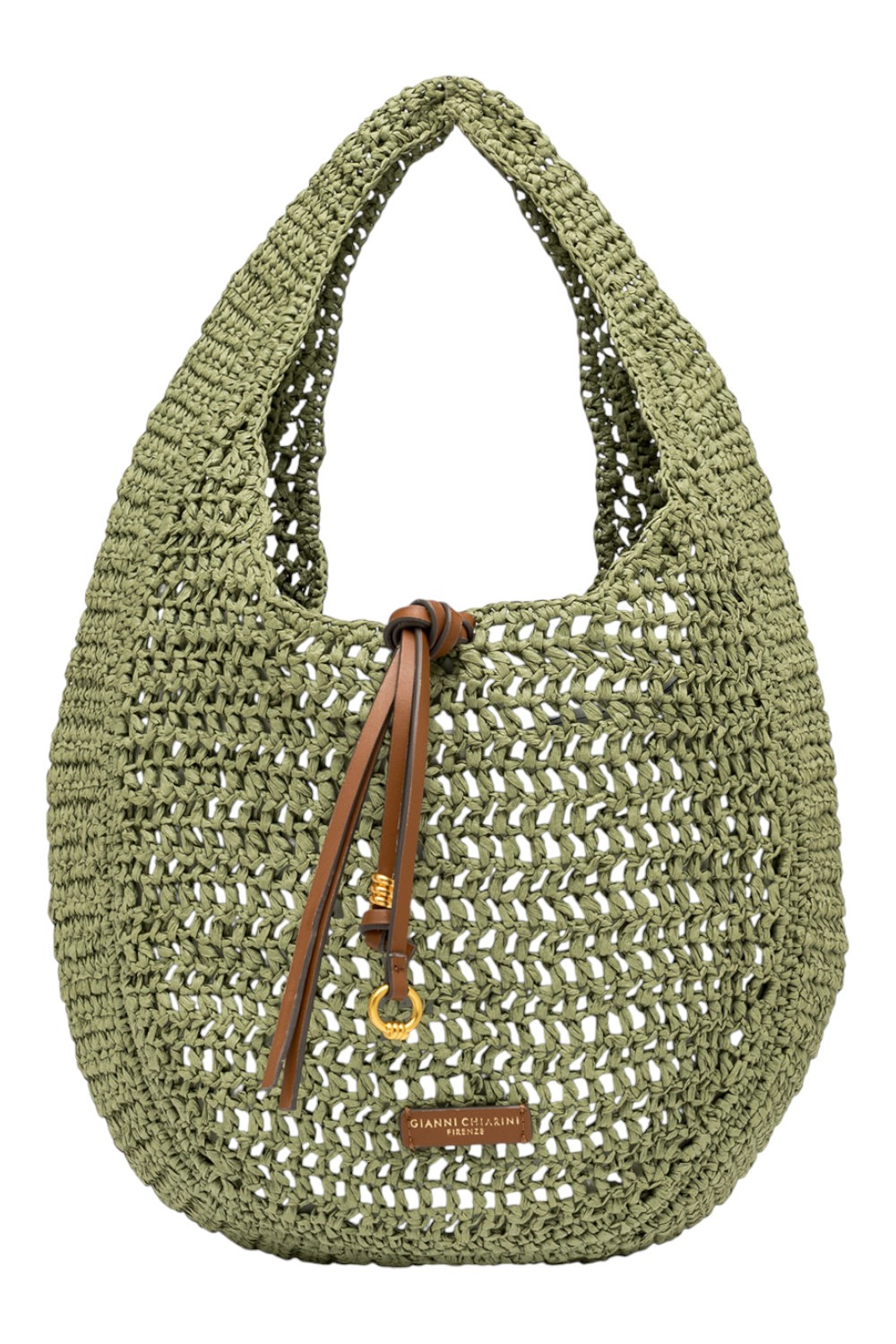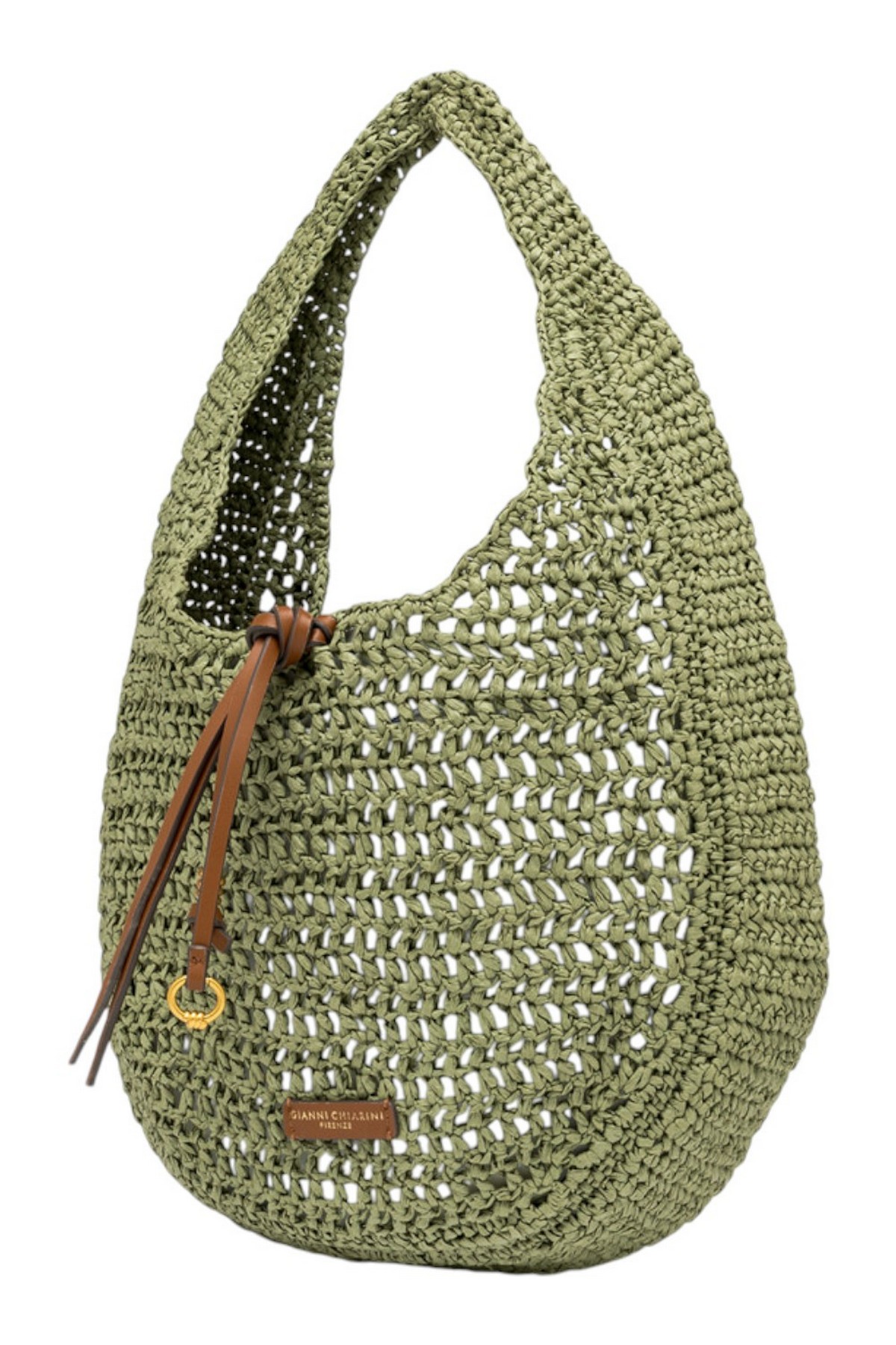 Borsa Nefeli tote bag di Gianni Chiarini Firenze, realizzata in paglia crochet, perfetta per affrontare con leggerezza e stile le giornate estive. Presenta una chiusura con cordoncino e dettagli in metallo che donano un tocco luminoso al design.
