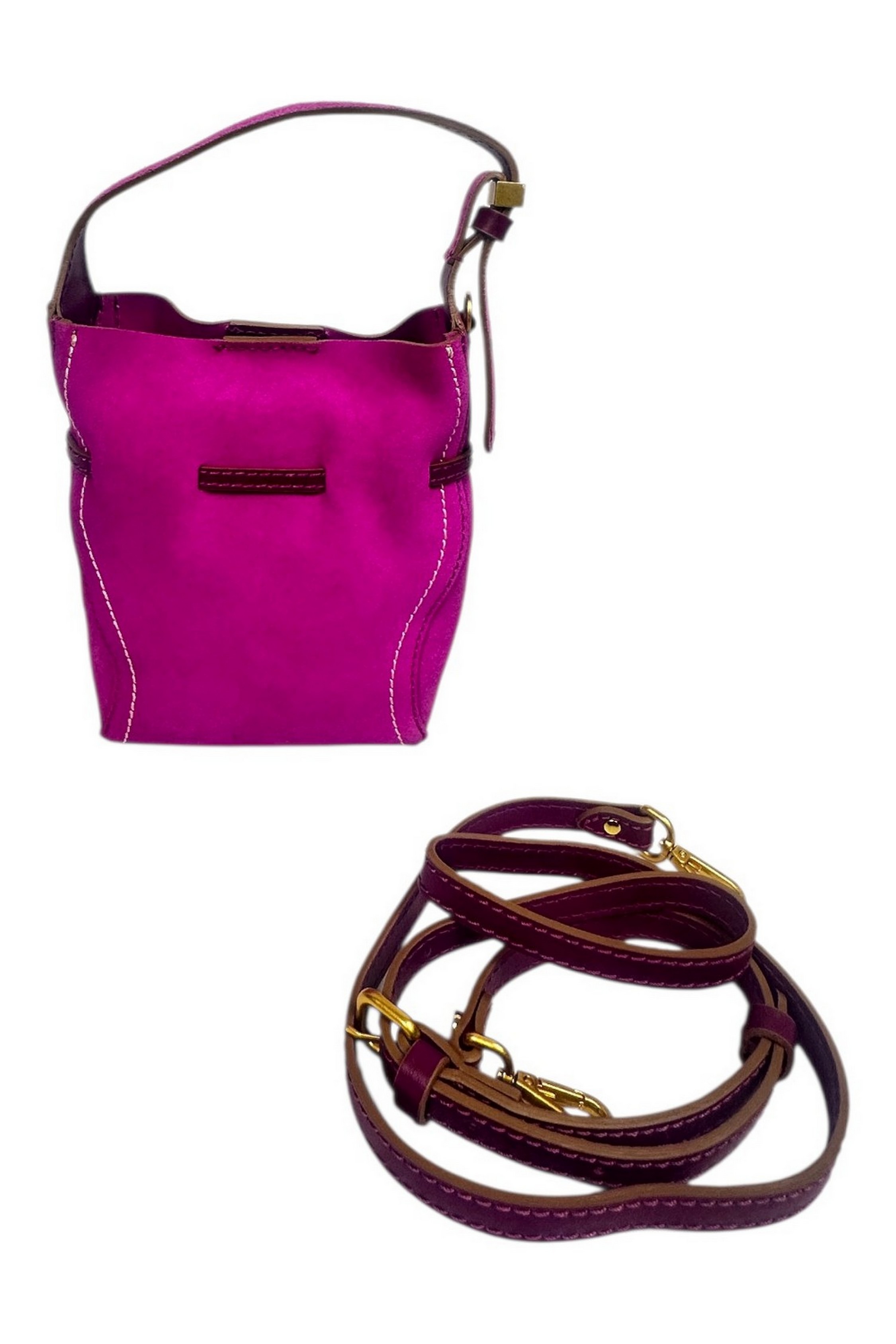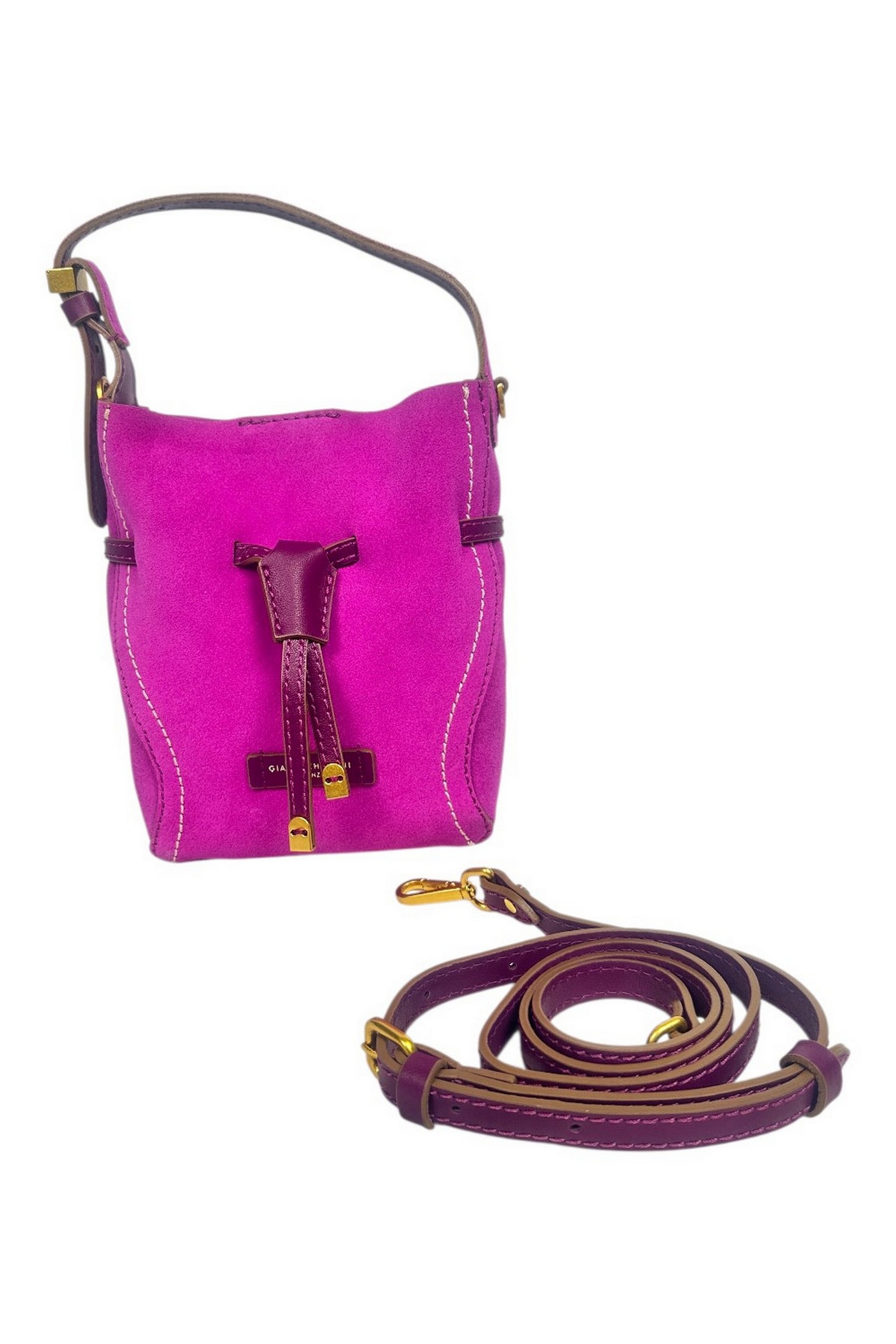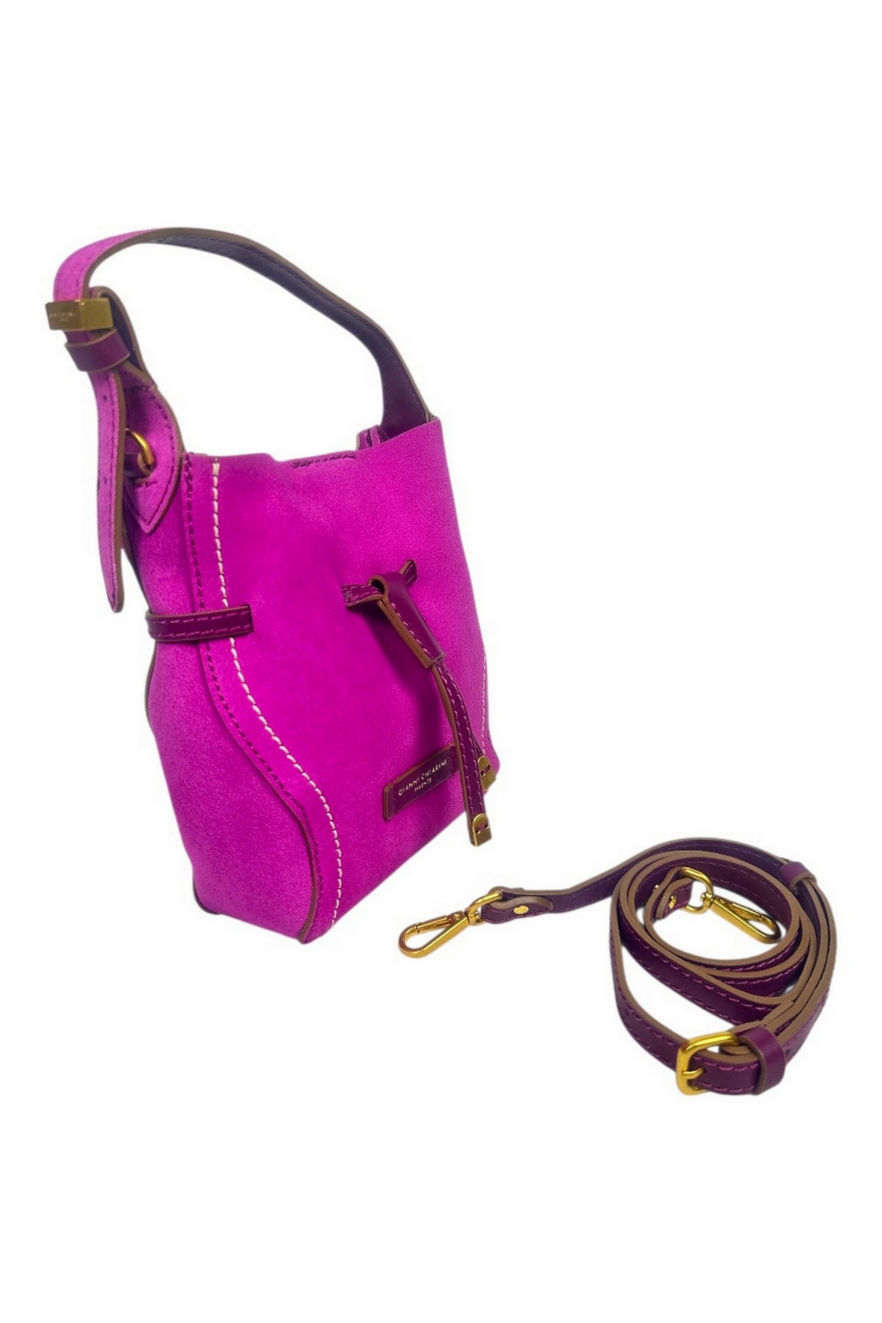 Borsa di Gianni Chiarini. Modello Sienna. Pelle scamosciata. Realizzata in pregiata pelle scamosciata con una forma morbida a secchiello. Dettaglio frontale con lacci in pelle e nappe decorative. Chiusura principale con bottone magnetico. Impunture a contrasto che ne esaltano la silhouette.