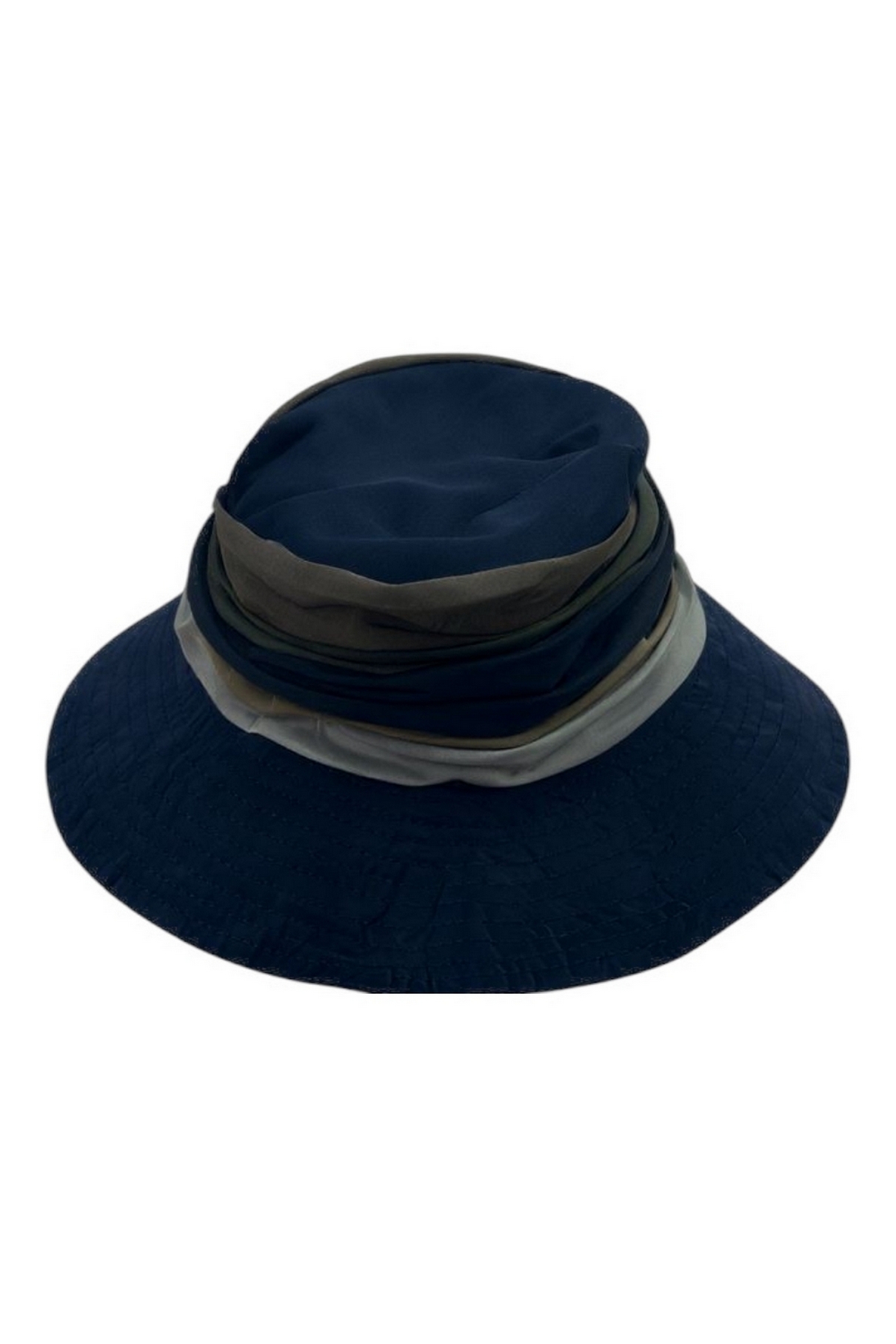 Raffinato cappello cloche in nylon con tesa media e corona morbida e avvolgente. Realizzato in nylon di alta qualità color blu navy, presenta dettagli distintivi con fasce decorative intrecciate in tonalità grigie e verde oliva che impreziosiscono la base della corona. La forma classica a campana, tipica dello stile cloche, dona femminilità e protezione. Tessuto caldo e confortevole, ideale per la stagione autunnale e invernale. La struttura morbida ma definita permette di modellare leggermente la forma per adattarla al proprio stile. Lavorazione artigianale di qualità con cuciture invisibili e finiture curate. Perfetto per look eleganti e sofisticati, si abbina facilmente a cappotti, trench e giacche strutturate. Ideale sia per occasioni formali che per outfit casual-chic da città.