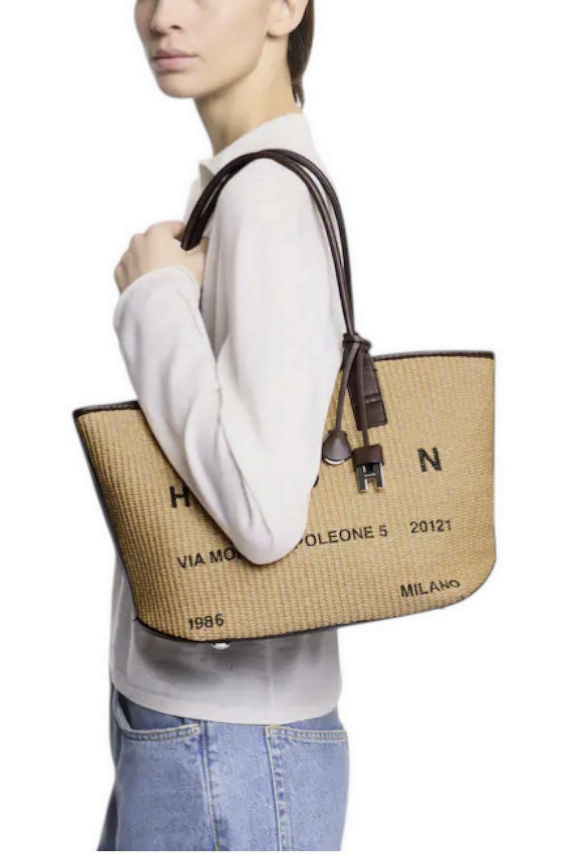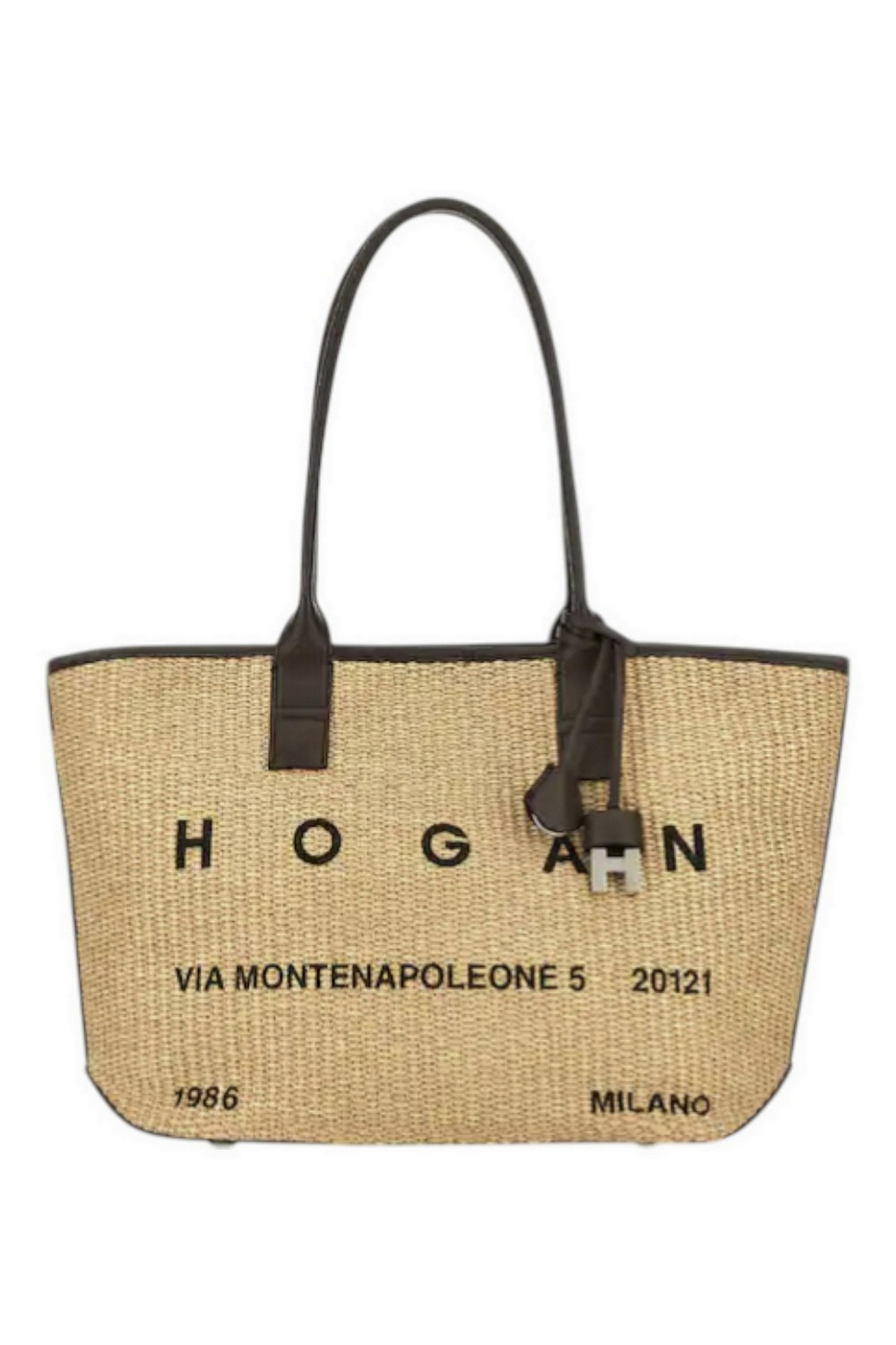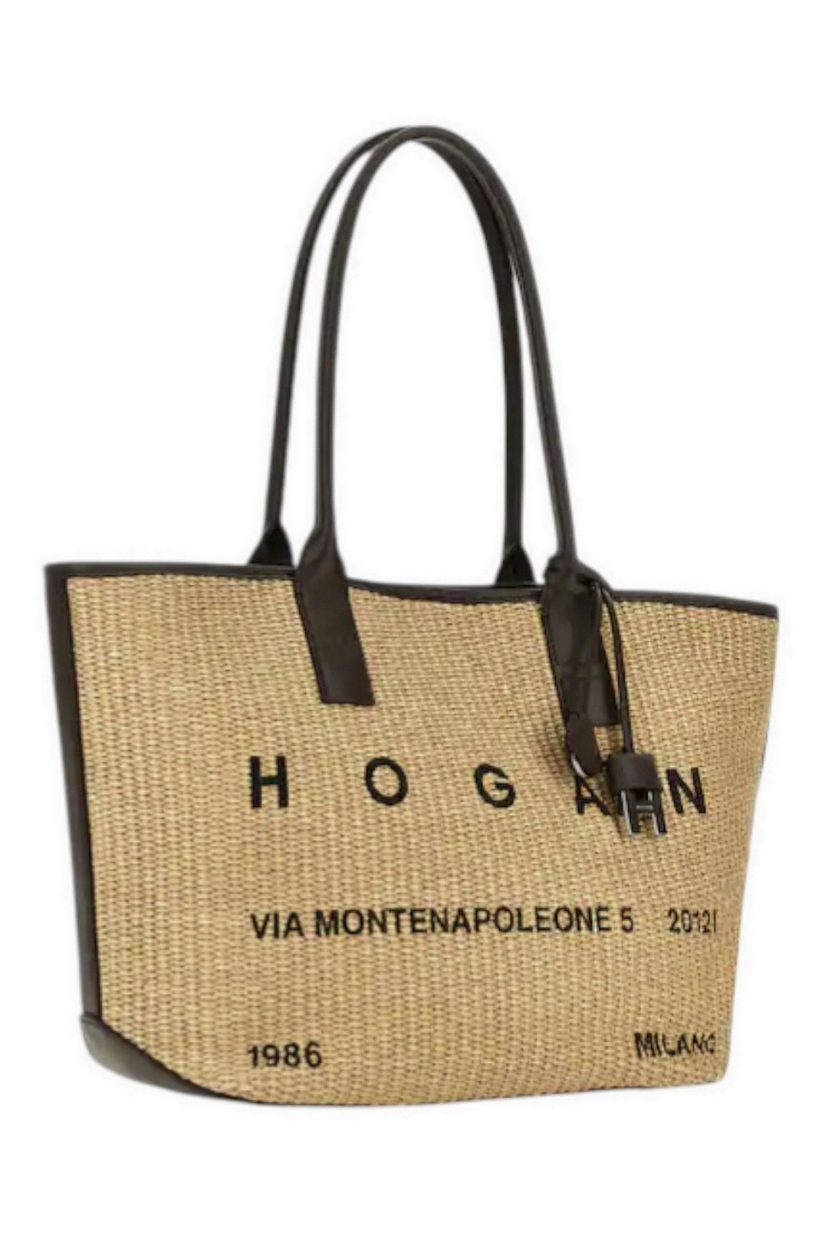 Shopping bag di Hogan con l'indirizzo del brand proposta in una versione leggera, dal mood estivo. Dotata del logo stampato, questa declinazione in rafia presenta due manici fissi in pelle e un ampio vano chiuso con bottone magnetico. Completano il modello un pendente portachiavi e il charm H-Fob in metallo. Shopping bag donna. Articolo realizzato in rafia. Inserti in pelle liscia. Logo indirizzo via Monte Napoleone stampato. Dimensioni: 38 x 26 x 14 cm. Manici fissi. Chiusura con bottone magnetico. Tasca interna con zip. Piedini in metallo. Indicazioni di cura e mantenimento incluse. Custodia in tessuto inclusa