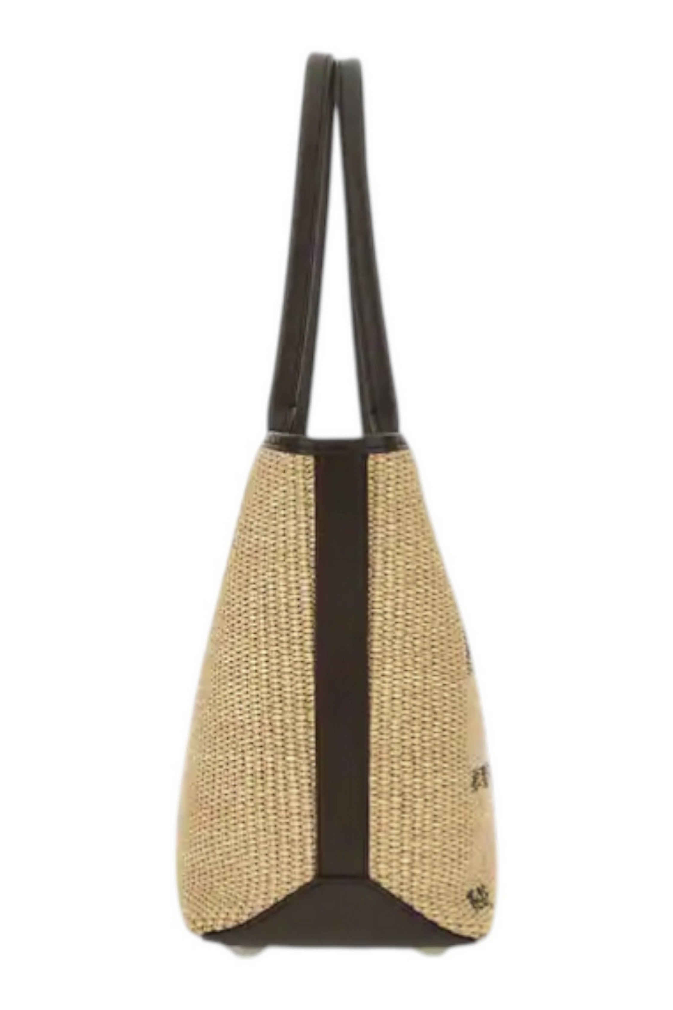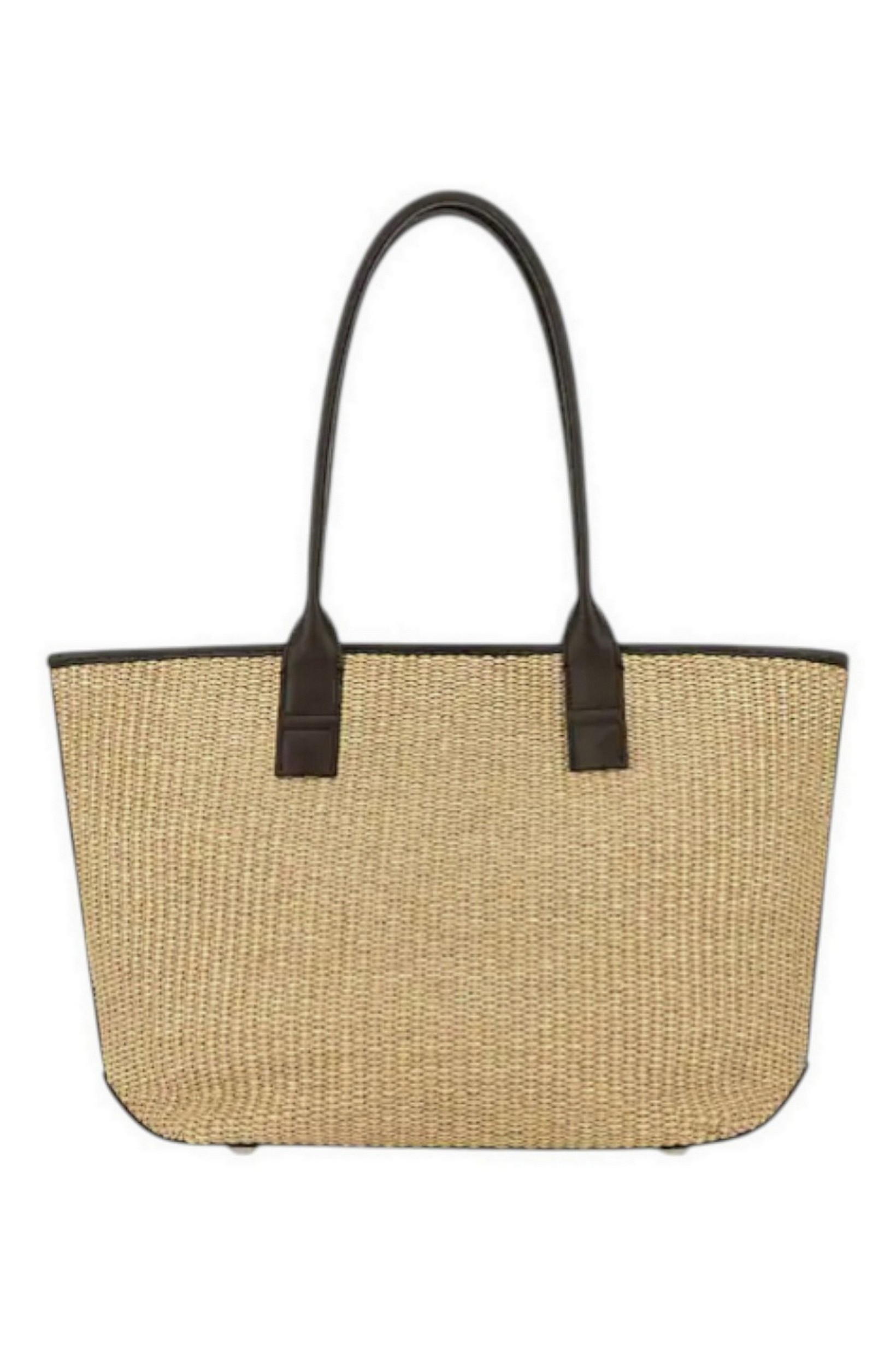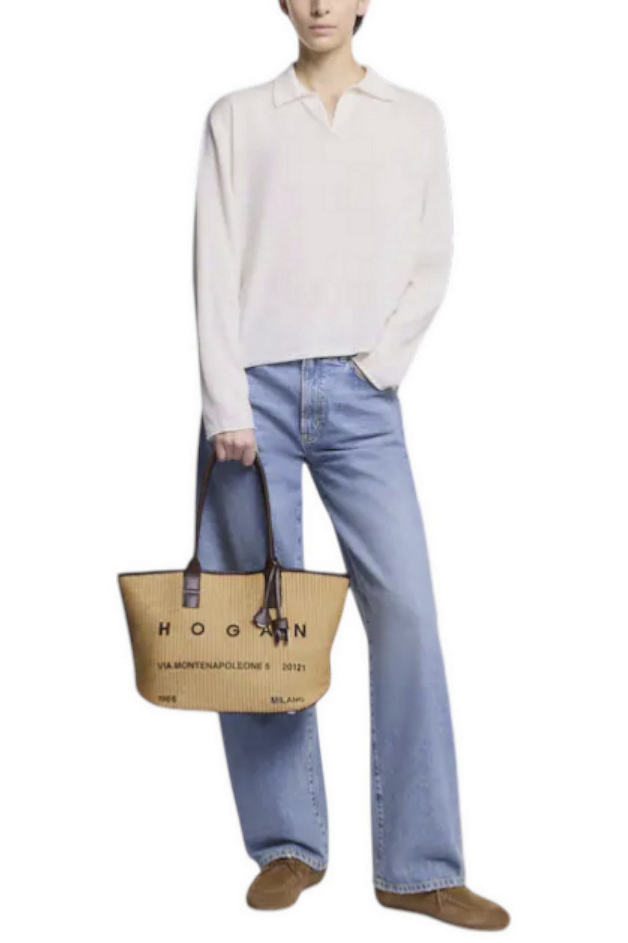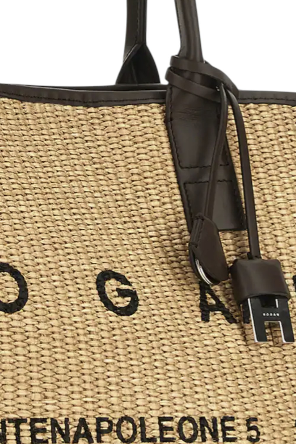 Shopping bag di Hogan con l'indirizzo del brand proposta in una versione leggera, dal mood estivo. Dotata del logo stampato, questa declinazione in rafia presenta due manici fissi in pelle e un ampio vano chiuso con bottone magnetico. Completano il modello un pendente portachiavi e il charm H-Fob in metallo. Shopping bag donna. Articolo realizzato in rafia. Inserti in pelle liscia. Logo indirizzo via Monte Napoleone stampato. Dimensioni: 38 x 26 x 14 cm. Manici fissi. Chiusura con bottone magnetico. Tasca interna con zip. Piedini in metallo. Indicazioni di cura e mantenimento incluse. Custodia in tessuto inclusa