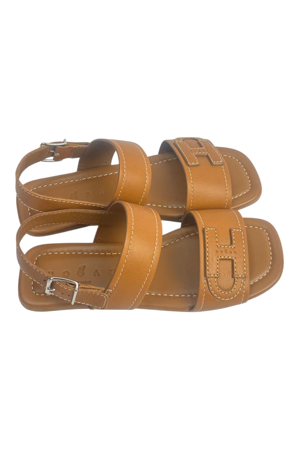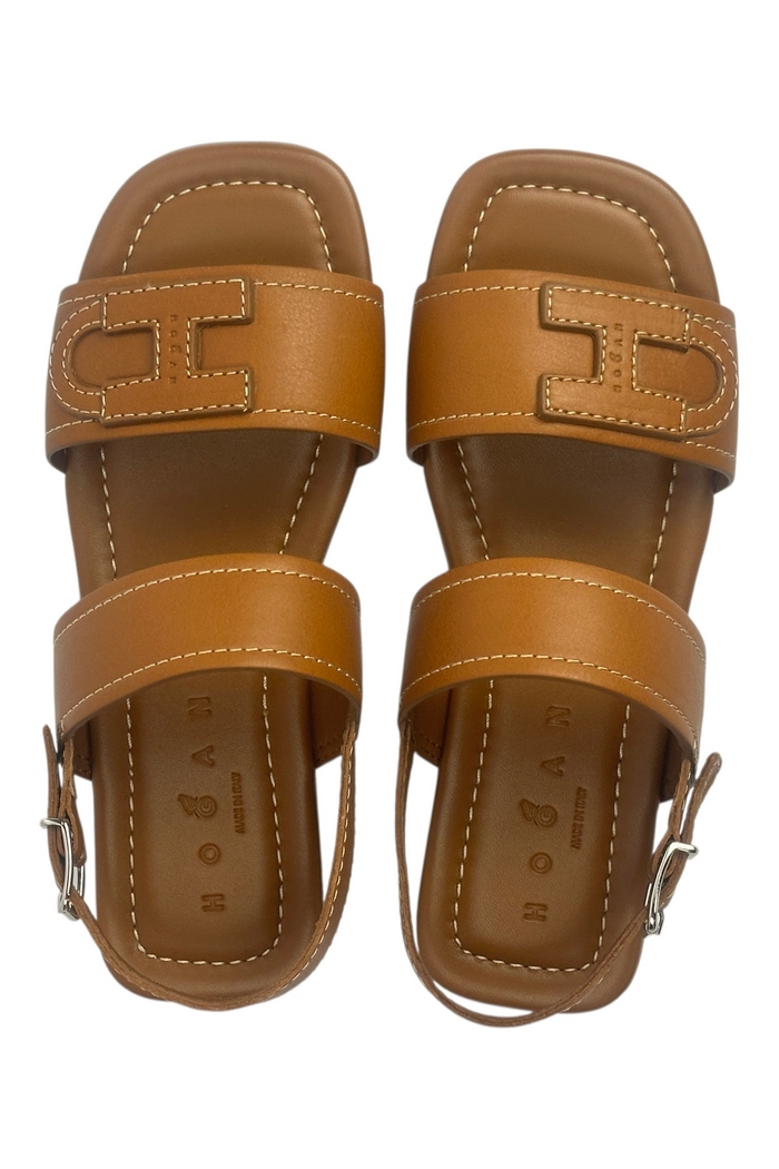Sandalo flat di Hogan. Pelle. H applicata con logo Hogan. Cinturino regolabile al tallone. Soletta imbottita rivestita in pelle. Suola in gomma leggera. Altezza totale 2 cm. Made in Italy.