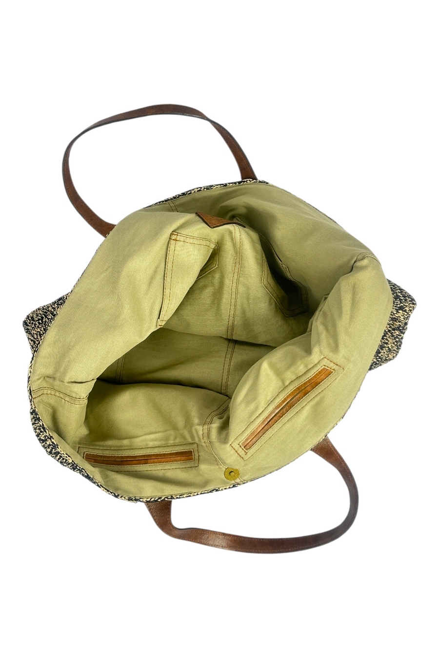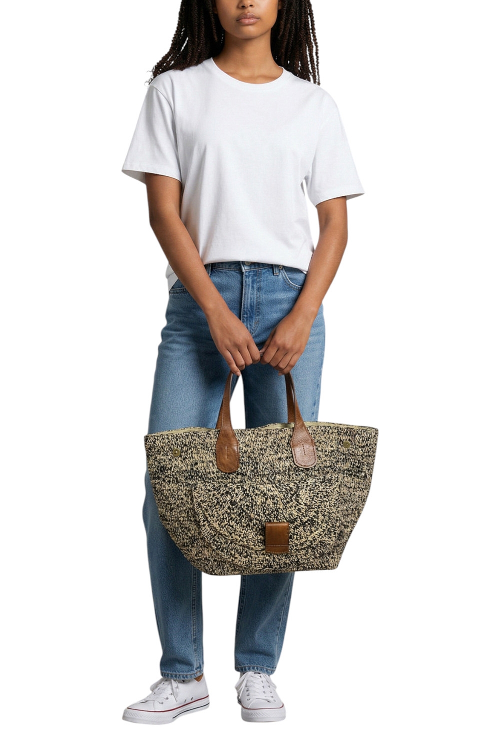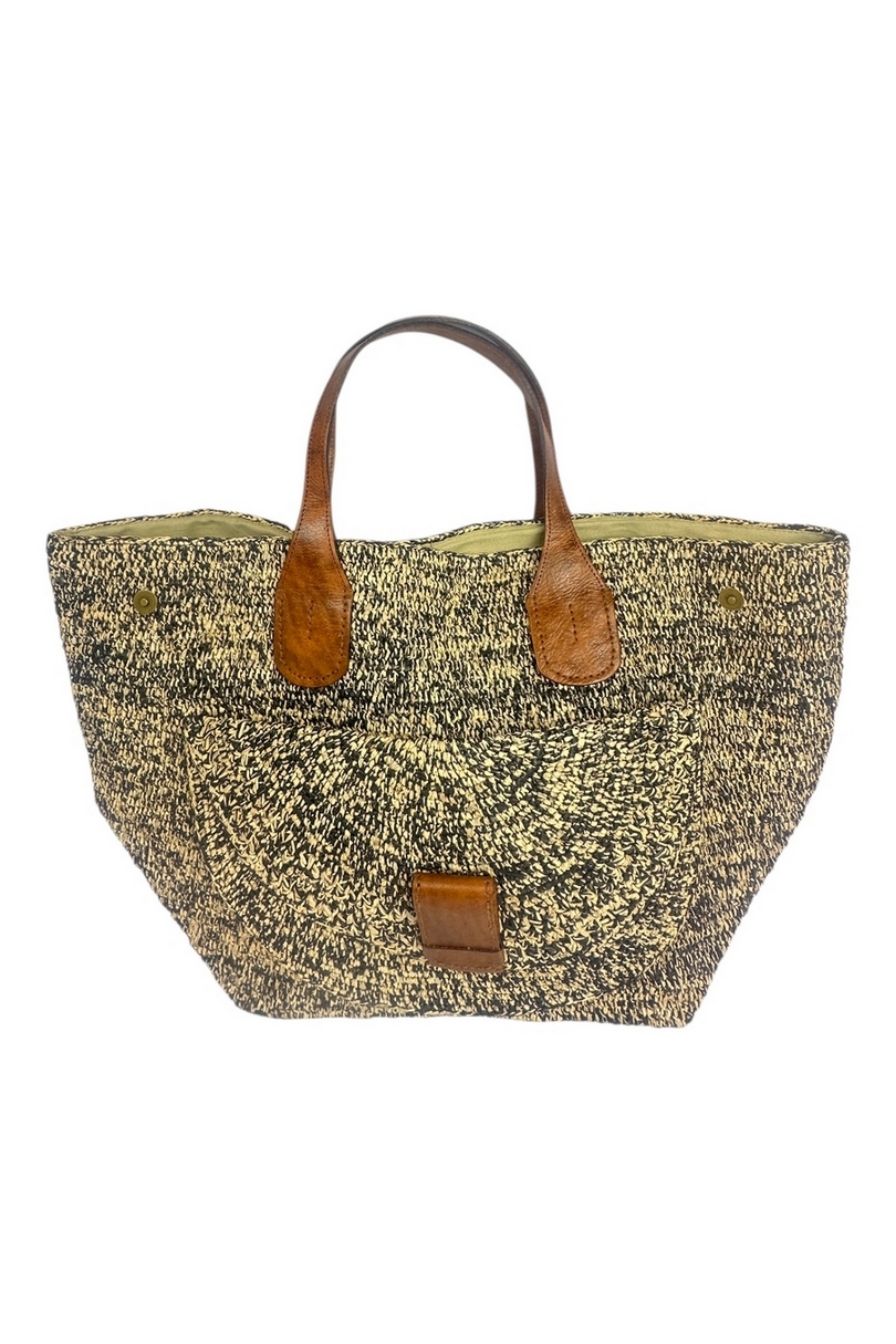 Borsa donna Laza 2 di Ibeliv. Dimensioni: 61 cm di lunghezza (40 cm con i bordi ripiegati), 35 cm di altezza, fondo 32 cm x 32 cm. Manici alti 18 cm in pelle foderata.Sistema di chiusura tramite bottone a pressione magnetico. Grazie alle sue 4 tasche interne, alla grande tasca e al soffietto esterni, la borsa in pelle LAZA offre anche la possibilità di un ingegnoso sistema di organizzazione. Materiali: 100% rafia naturale foderata in cotone biologico, questa borsa unisce la morbidezza e la resistenza di un materiale naturale e sostenibile. I due manici sono in pelle di zebù conciata con un processo vegetale. Produzione: 100% fatto a mano, ogni pezzo IBELIV presenta sottili variazioni, che riflettono la sensibilità unica dell'artigiana che lo ha realizzato. La tua LAZA è interamente lavorata all'uncinetto per un risultato di cui garantiamo la solidità. Cura: Senza tempo, pulite facilmente la vostra borsa LAZA con una spugna leggermente umida per conservarla anno dopo anno. Aggiungete un po' di sapone di colore neutro se necessario.