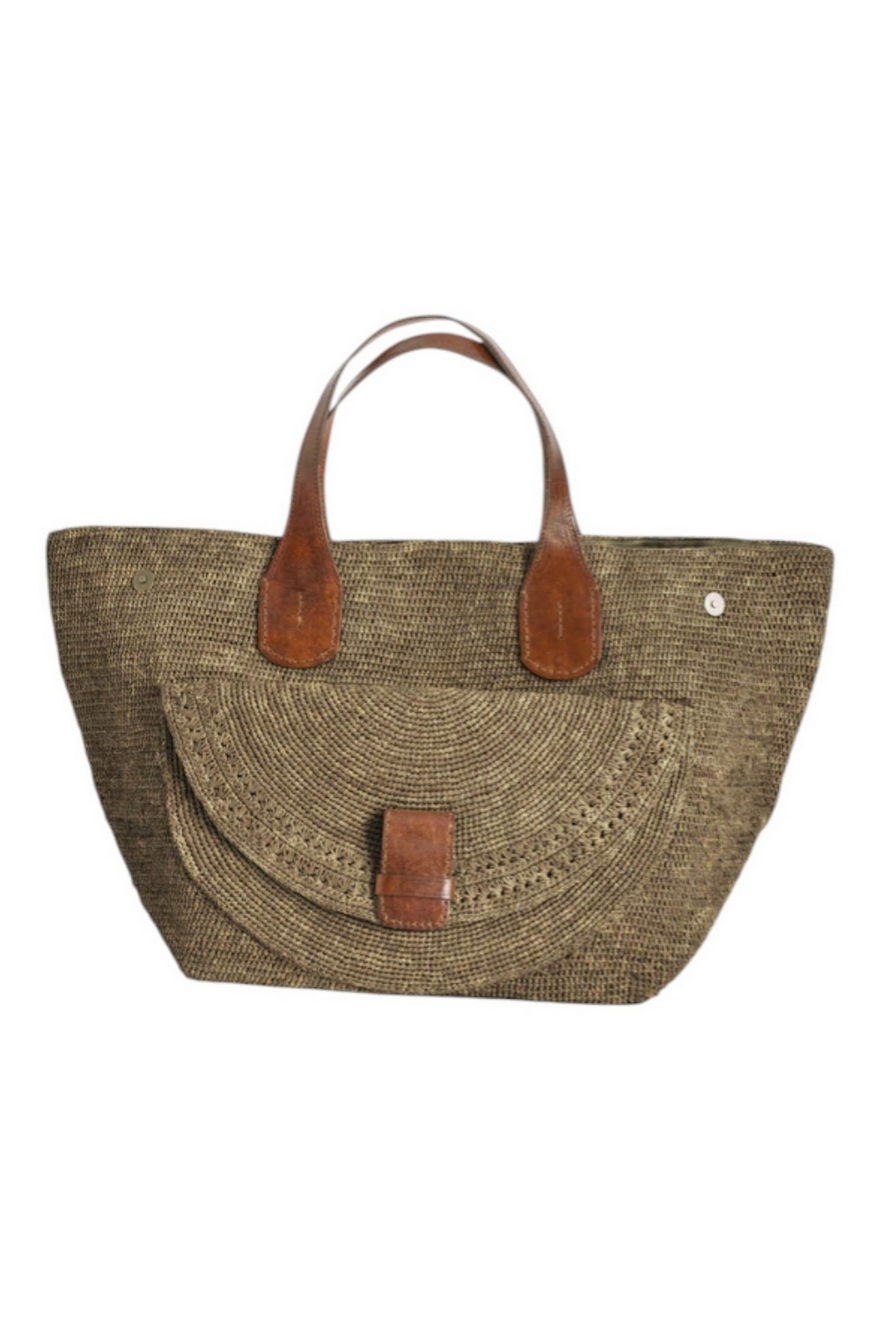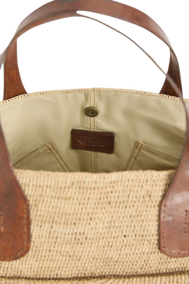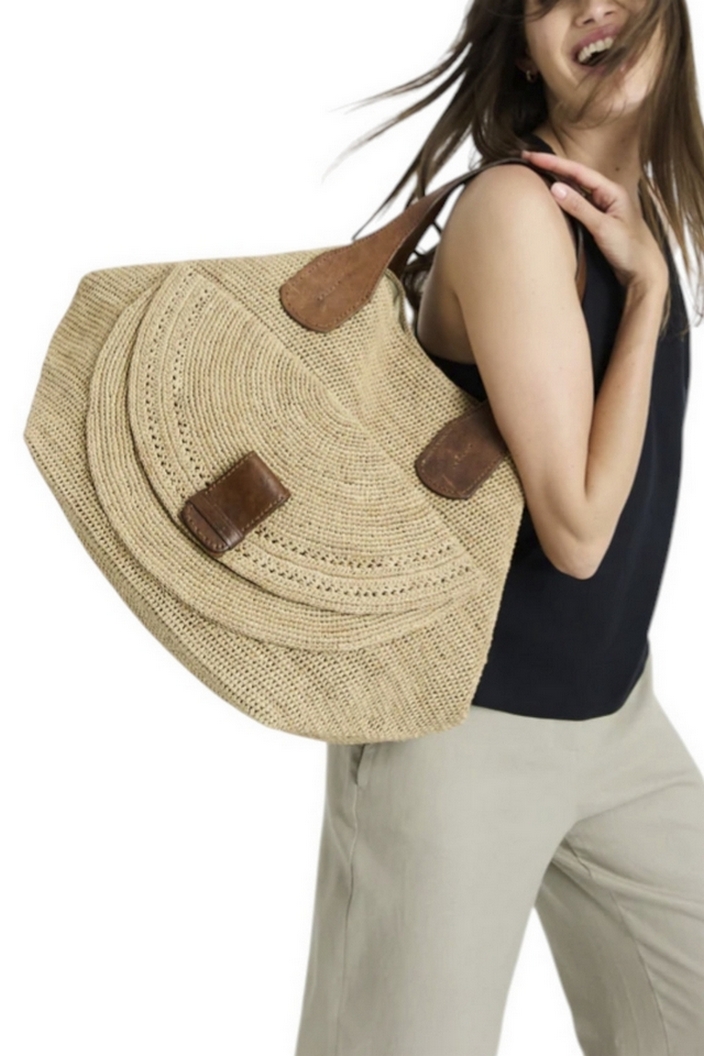 Borsa donna Laza 2 di Ibeliv. Dimensioni: 61 cm di lunghezza (40 cm con i bordi ripiegati), 35 cm di altezza, fondo 32 cm x 32 cm. Manici alti 18 cm in pelle foderata.Sistema di chiusura tramite bottone a pressione magnetico. Grazie alle sue 4 tasche interne, alla grande tasca e al soffietto esterni, la borsa in pelle LAZA offre anche la possibilità di un ingegnoso sistema di organizzazione. Materiali: 100% rafia naturale foderata in cotone biologico, questa borsa unisce la morbidezza e la resistenza di un materiale naturale e sostenibile. I due manici sono in pelle di zebù conciata con un processo vegetale. Produzione: 100% fatto a mano, ogni pezzo IBELIV presenta sottili variazioni, che riflettono la sensibilità unica dell'artigiana che lo ha realizzato. La tua LAZA è interamente lavorata all'uncinetto per un risultato di cui garantiamo la solidità. Cura: Senza tempo, pulite facilmente la vostra borsa LAZA con una spugna leggermente umida per conservarla anno dopo anno. Aggiungete un po' di sapone di colore neutro se necessario.