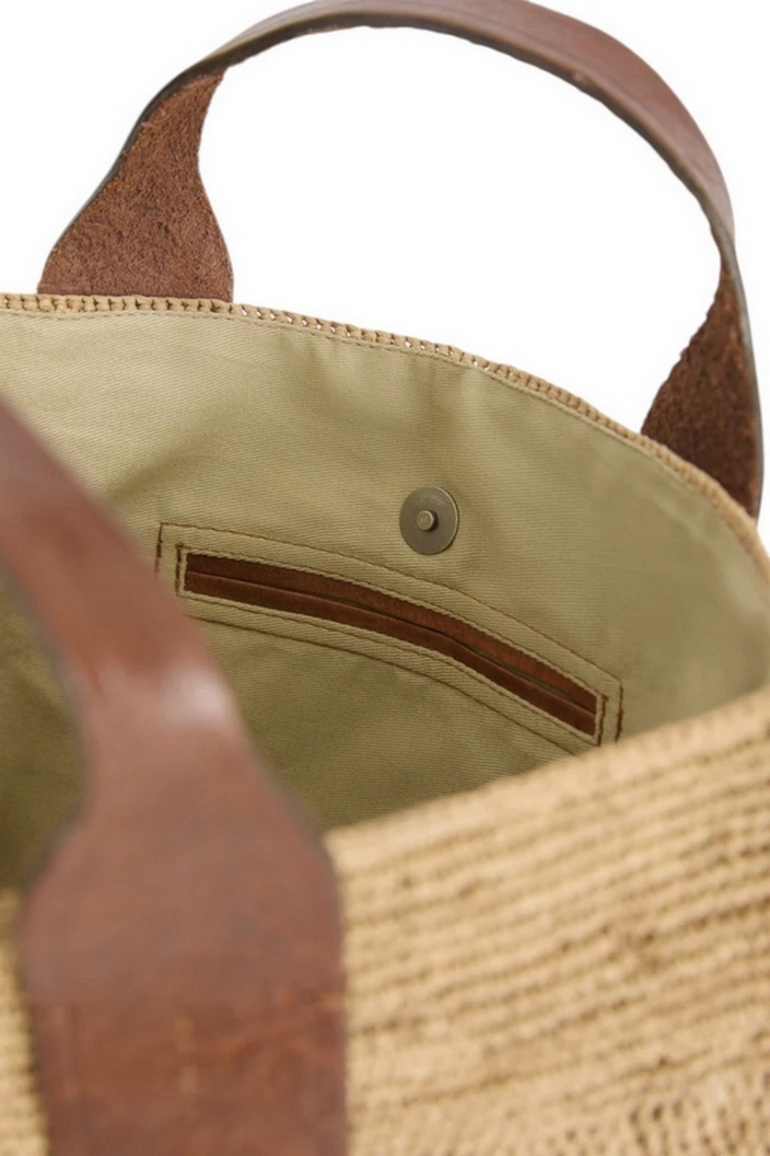Borsa METY di Ibeliv, borsa da passeggio unisex destinata a diventare la fedele compagna sia delle donne che degli uomini. Da portare a mano, a spalla o a tracolla. Borsa in rafia naturale. Fodera in cotone biologico. Tasca interna in cotone biologico con bordi in pelle. Chiusura con bottone a pressione magnetico.