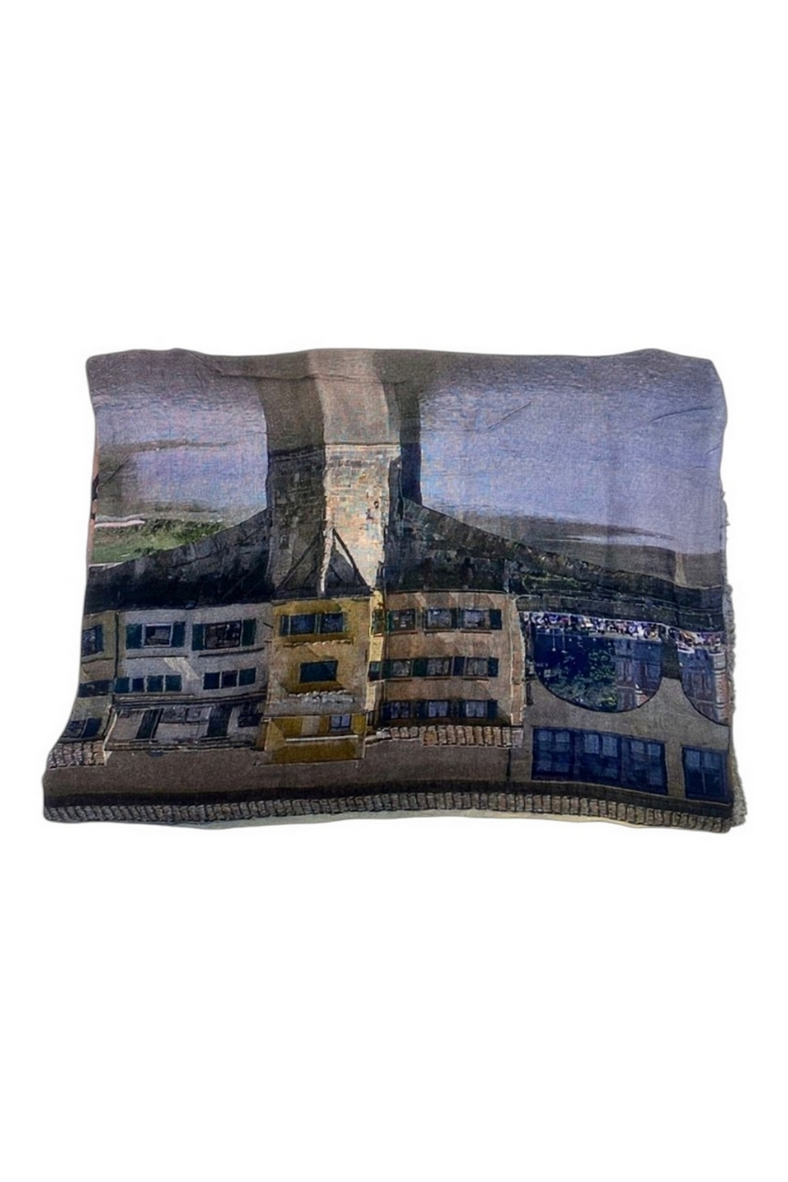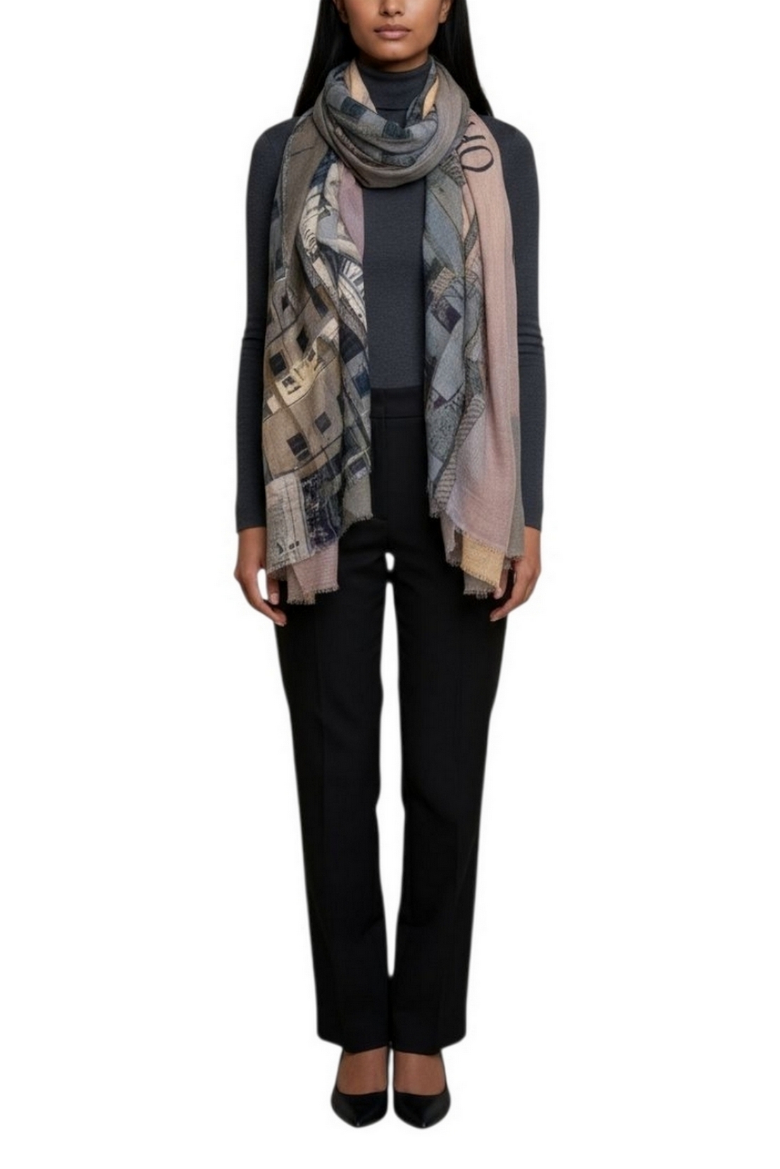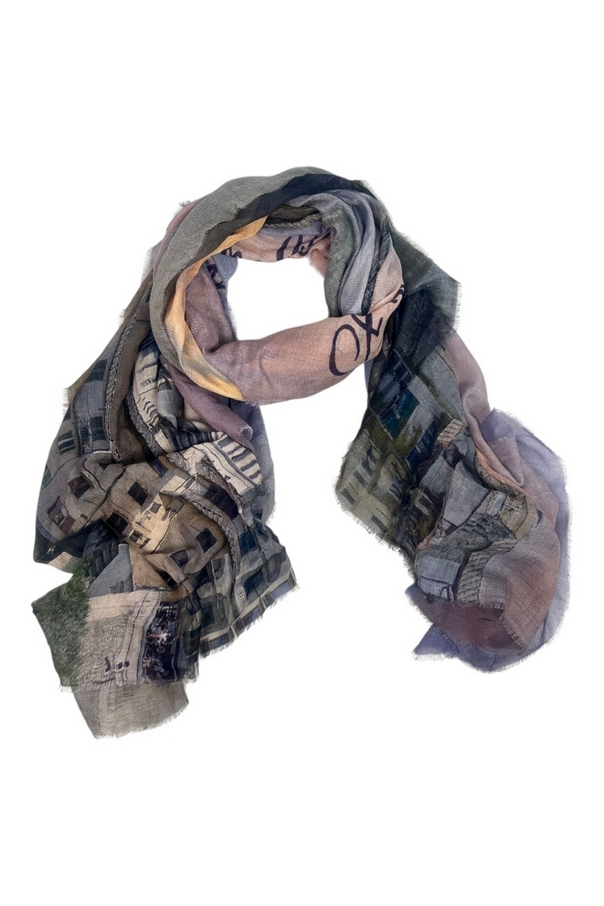 Sciarpa con stampa Pontevecchio di Jaytush. Laccessorio presenta una suggestiva stampa effetto acquerello con case e dettagli urbani in una gamma di toni polverosi, lilla, sabbia e verde, per un risultato sofisticato e originale. Il tessuto è leggero, morbido e arioso, ideale dalla primavera allautunno.