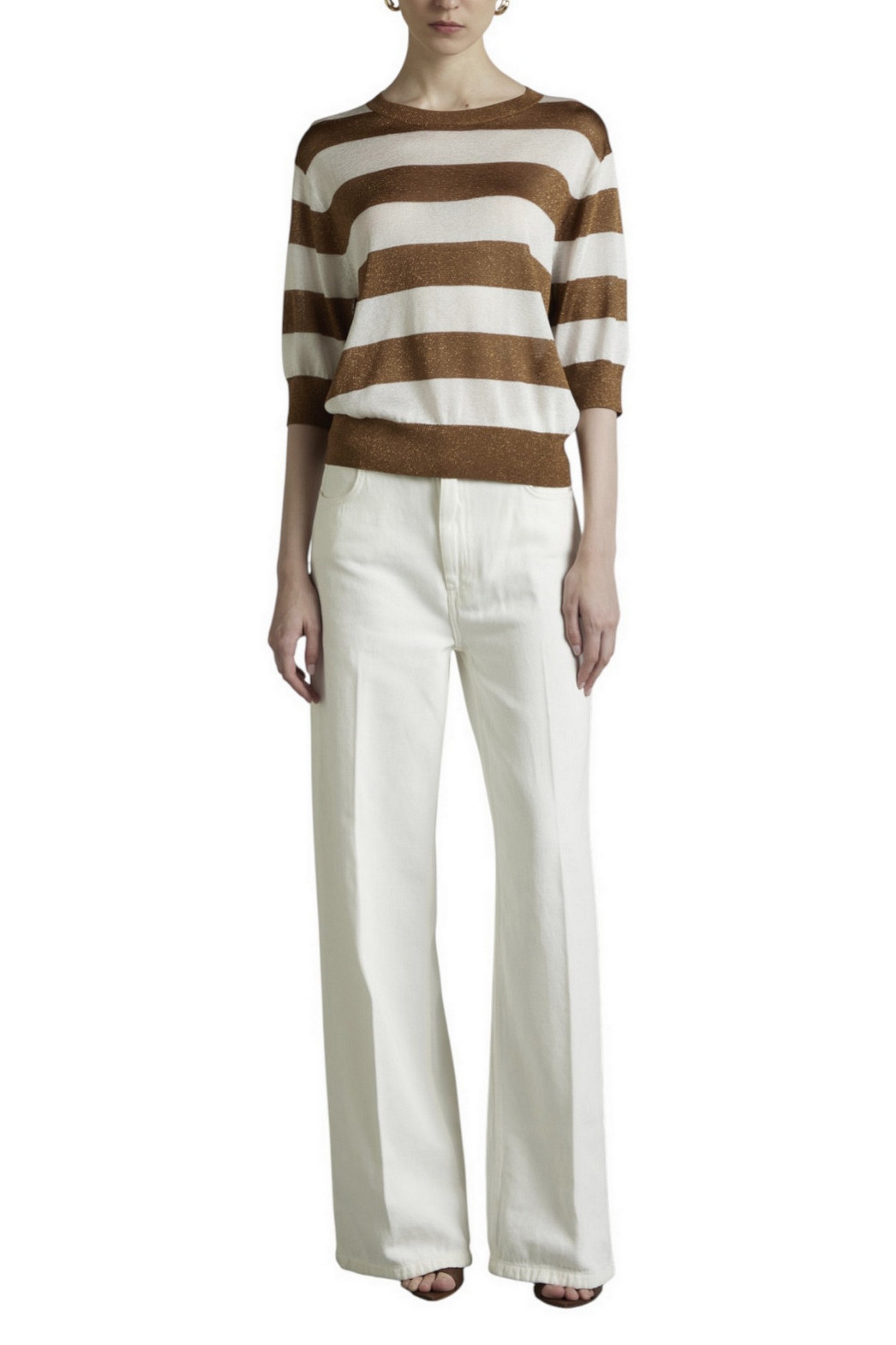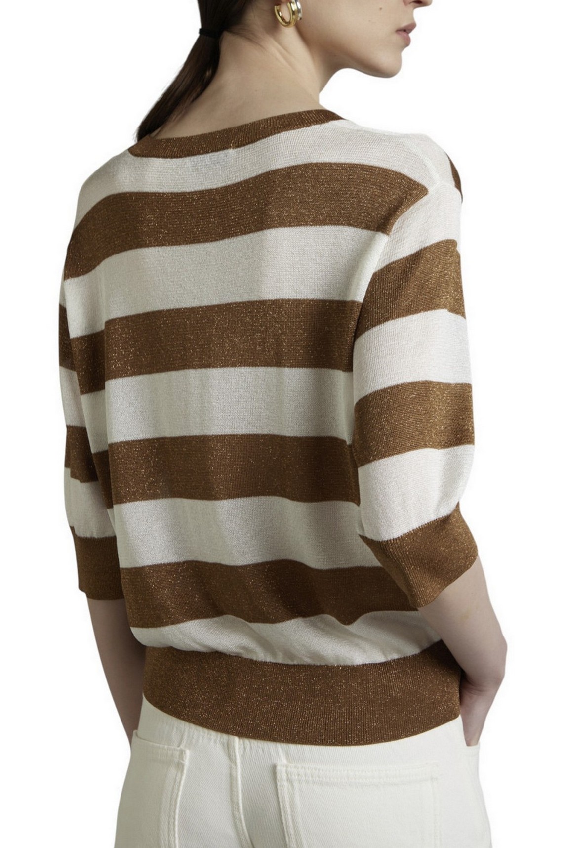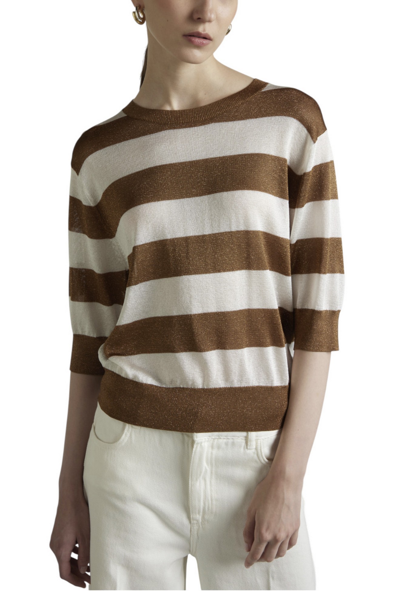 Maglia di Kangra in filo. Girocollo. Maniche al gomito. Fantasia righe. Dettagli lurex. Vestibilità regolare. Composizione: 87% viscosa, 13% fibra metallica.
