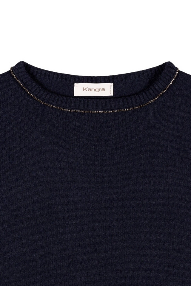 Maglia rasata di Kangra finezza 12, con spacchi, caratterizzata da una linea essenziale. Lo scollo a barchetta è impreziosito da una raffinata passamaneria con castoni: dettaglio luminoso che dona al capo un tocco ricercato e femminile, ideale per valorizzare anche gli outfit più minimal. Composizione: Lana Cotone e Cashmere