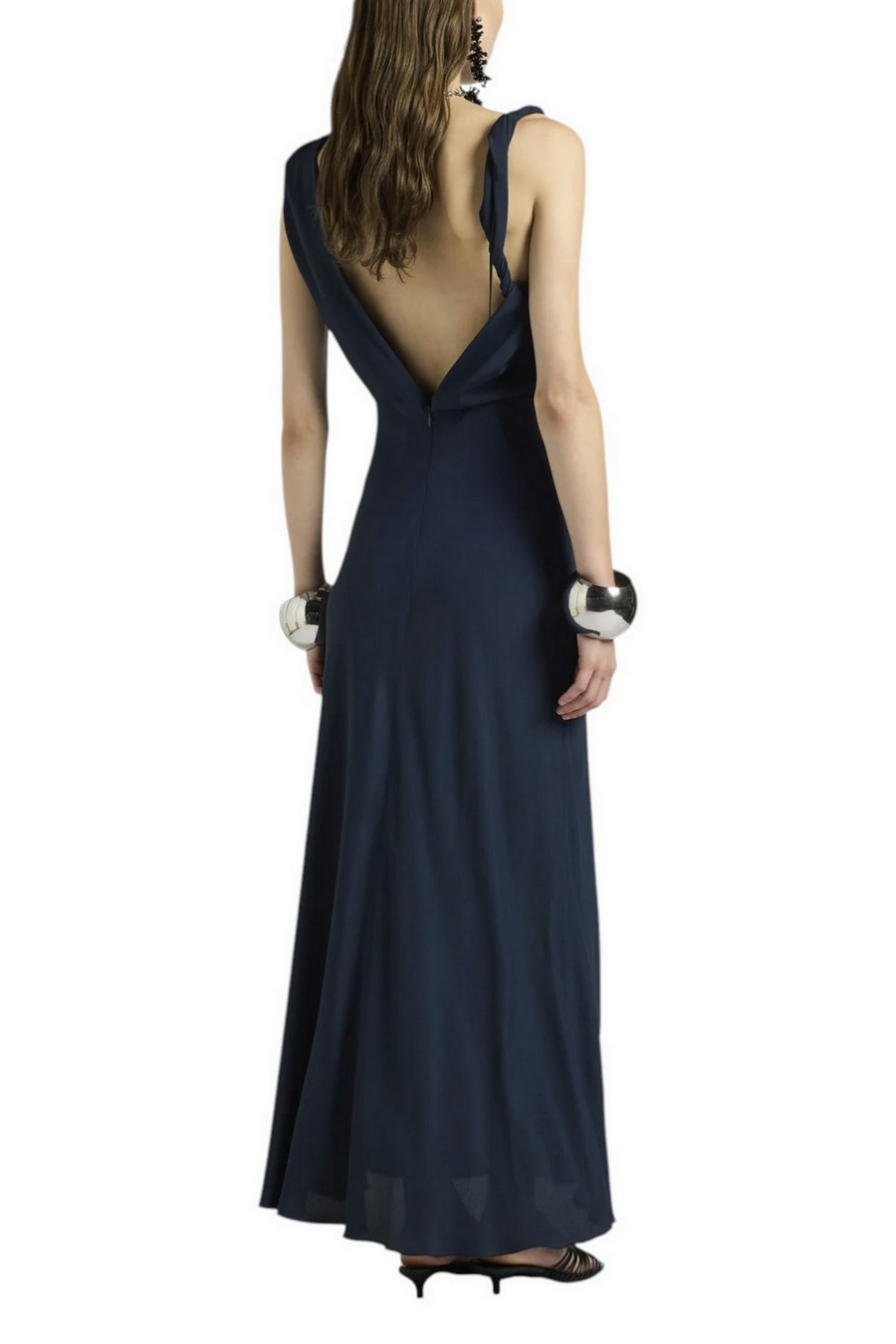 Abito di Liviana Conti in seta. Scollatura a v con drappeggio. Senza maniche. Chiusura con zip sul retro. Composizione: 65% acetato, 36% seta. Made in Italy.