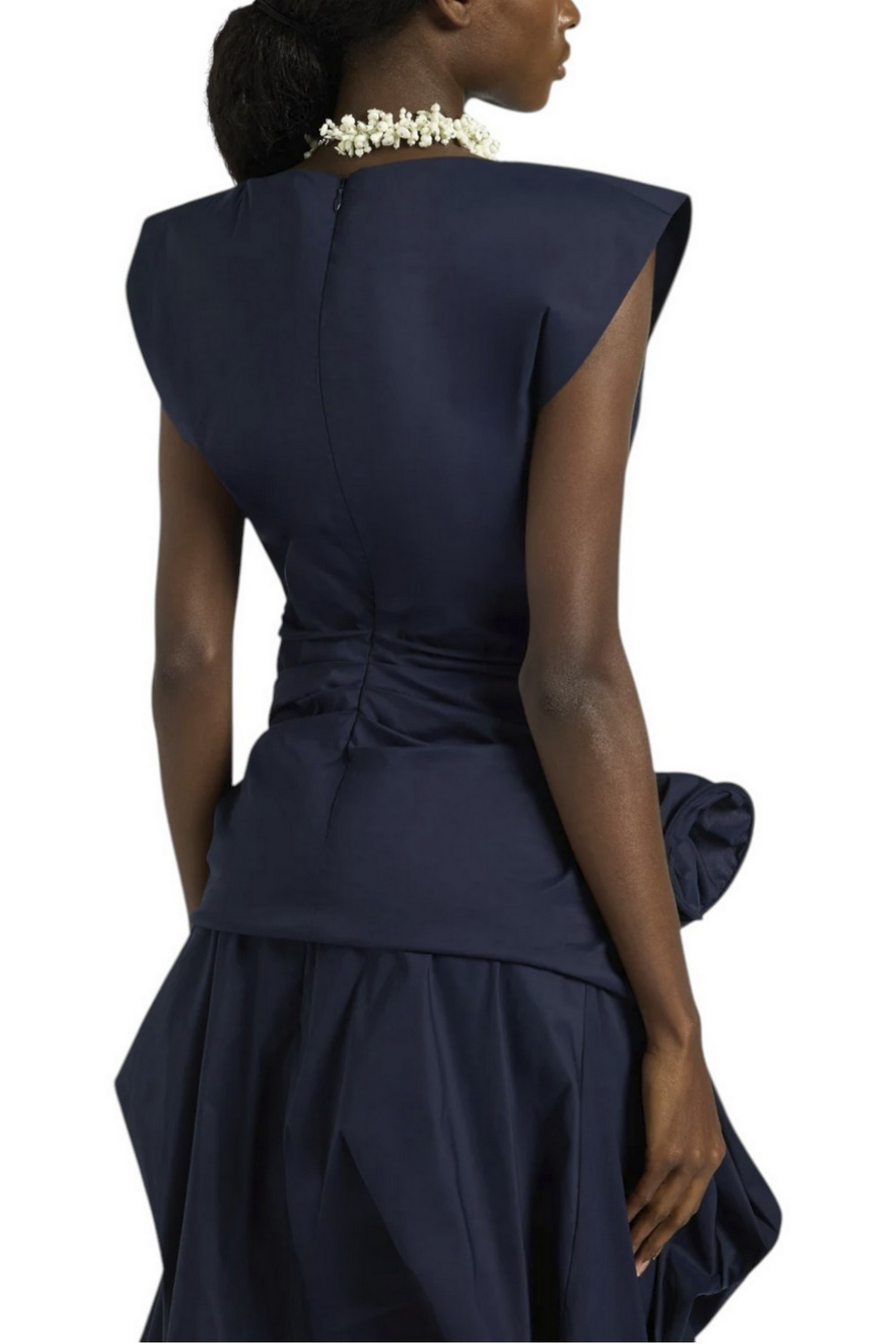 Top con rouche piazzata di Liviana Conti in popeline stretch. Scollo a barchetta con accenno di manica ad aletta, fascione con applicazione. Linea aderente, lunghezza ai fianchi. Composizione: 68% cotone, 28% poliammide, 4% elastan. Made in Italy.