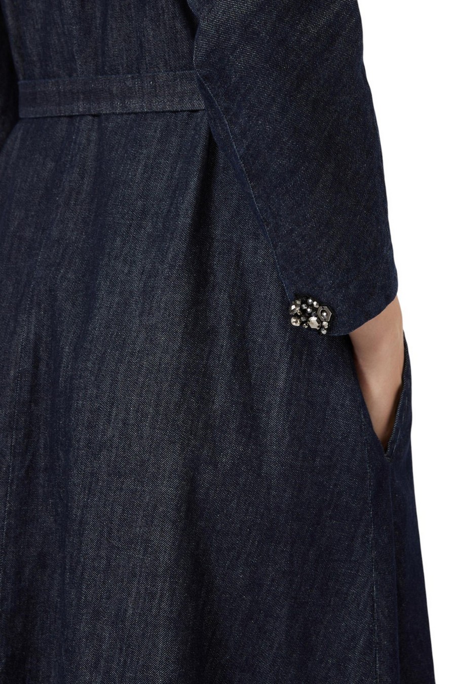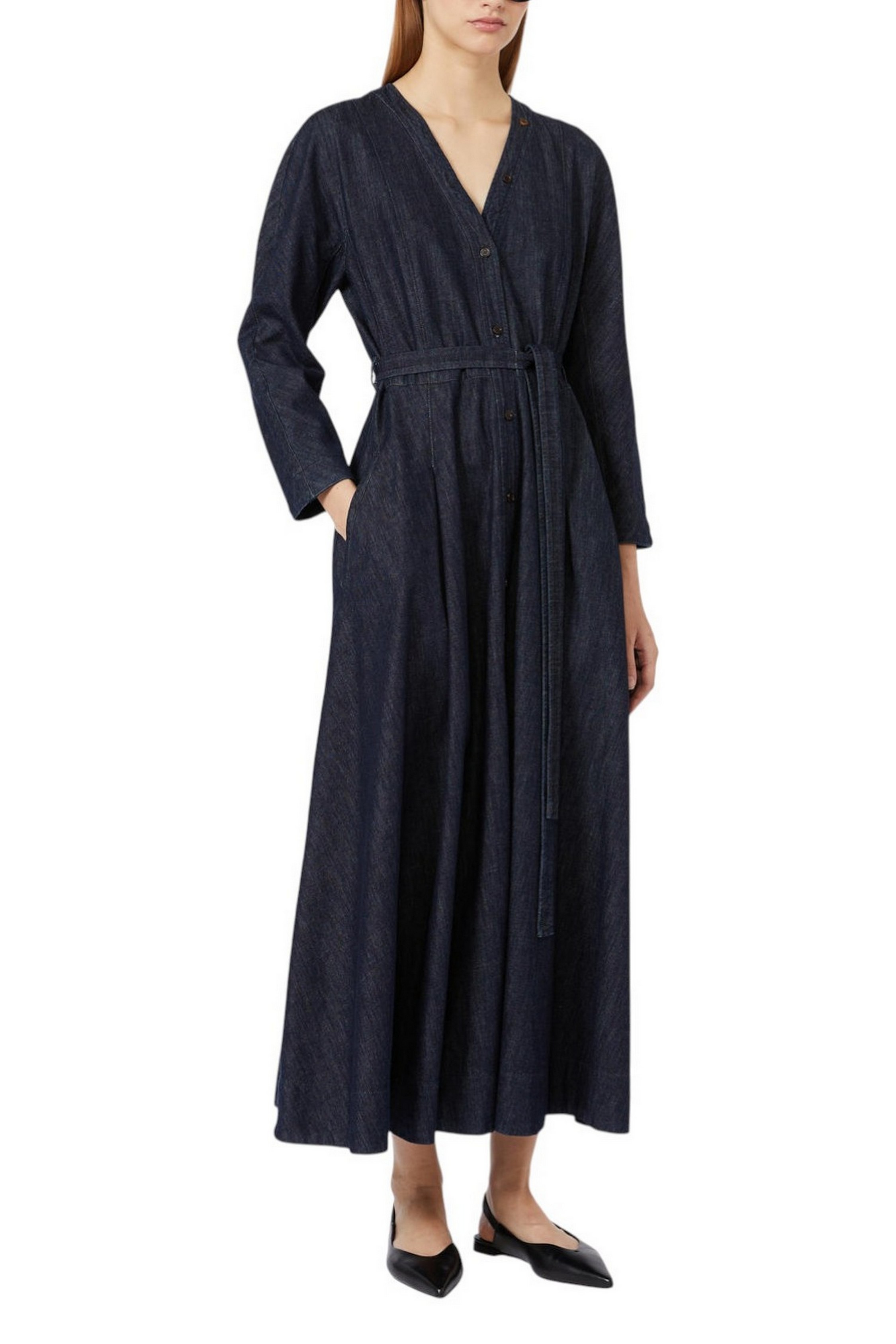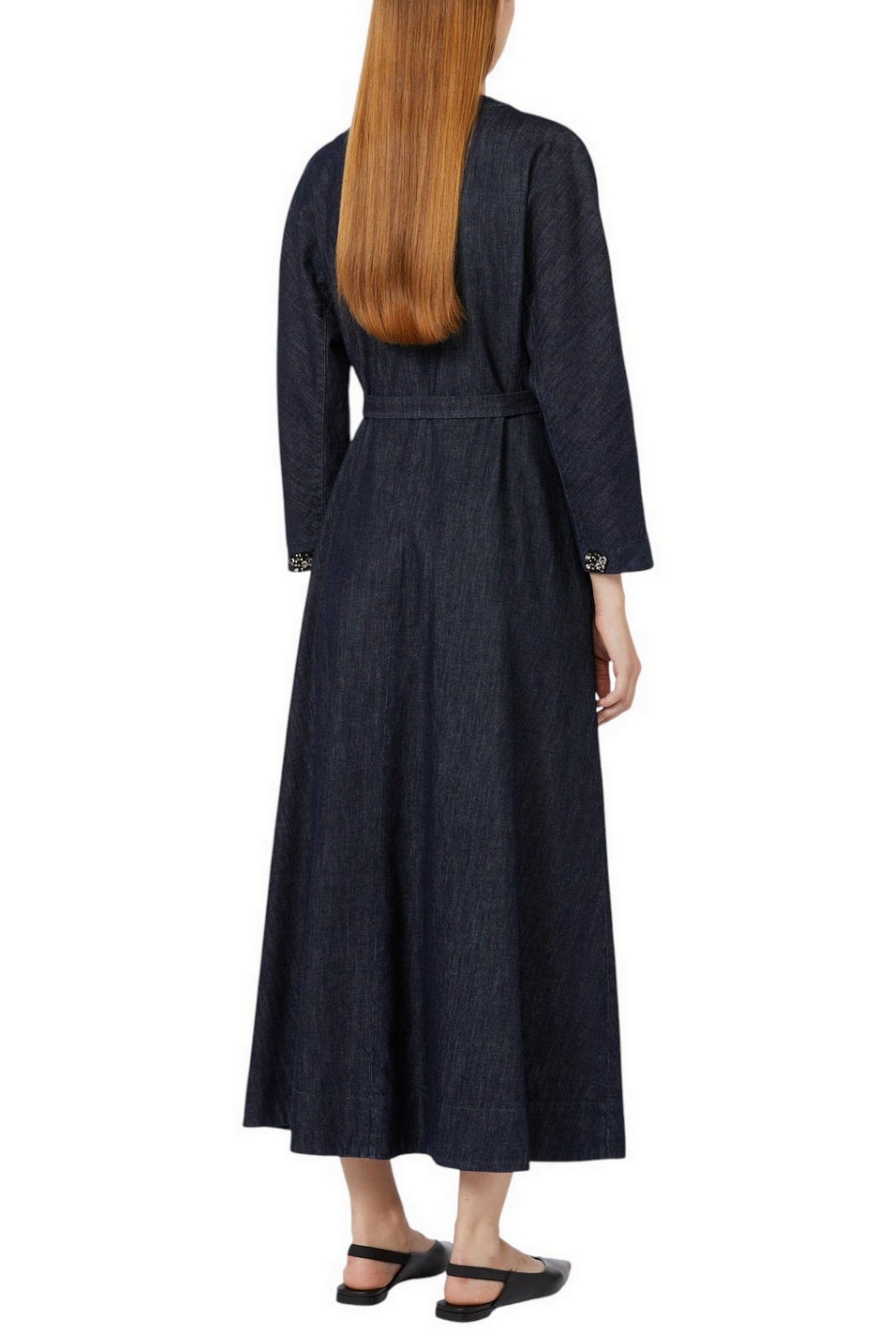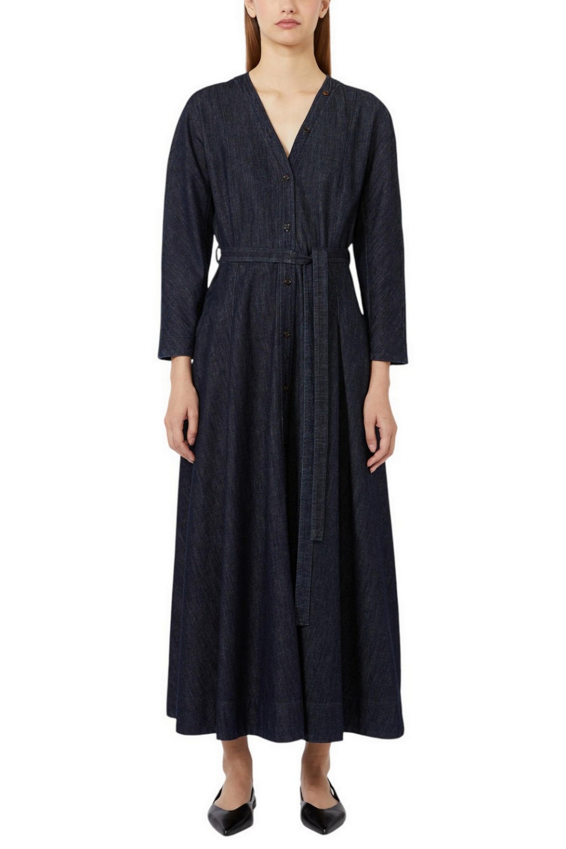 Abito lungo con scollo a V di MaxMara S, completo di cintura abbinata per evidenziare il punto vita. Abito in denim indaco di puro cotone lavato in capo. Linea svasata con taglio in vita. Maniche 3/4 a kimono con bottoni gioiello. Chiusura frontale con bottoni in corno su tutta la lunghezza. Tasche a filetto sui fianchi. Tessuto 93% Cotone, 7% Kapok- Decorazioni escluse. Fodera: 100% Cotone
