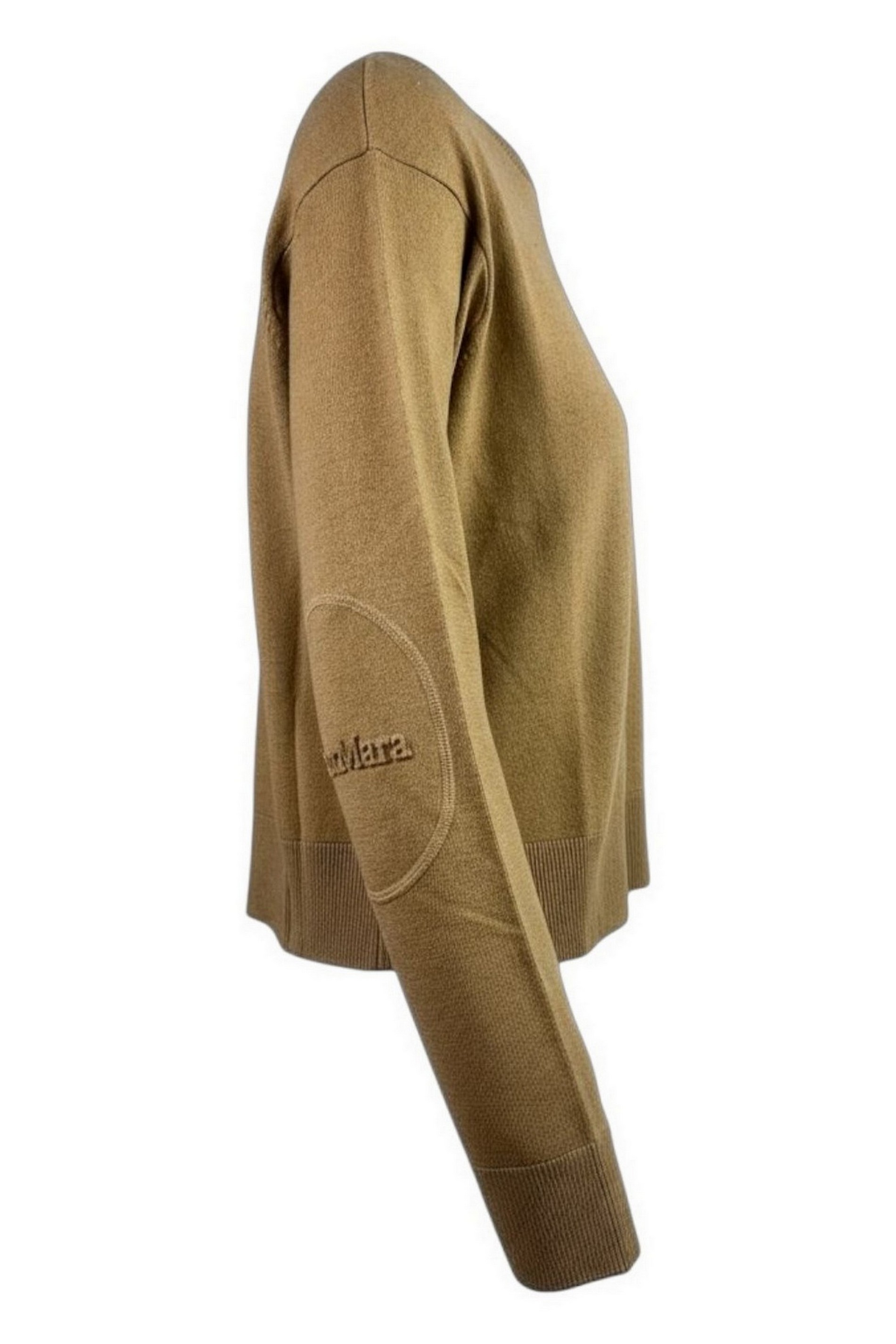 Maglia Eco di MaxMara S con toppe e logo Max Mara in rilievo sui gomiti. Maglia in filato di pura lana. Vestibilità rilassata. Girocollo. Maniche lunghe a giro basso. Bordi rifiniti a costine. Filato in maglia: 100% Lana