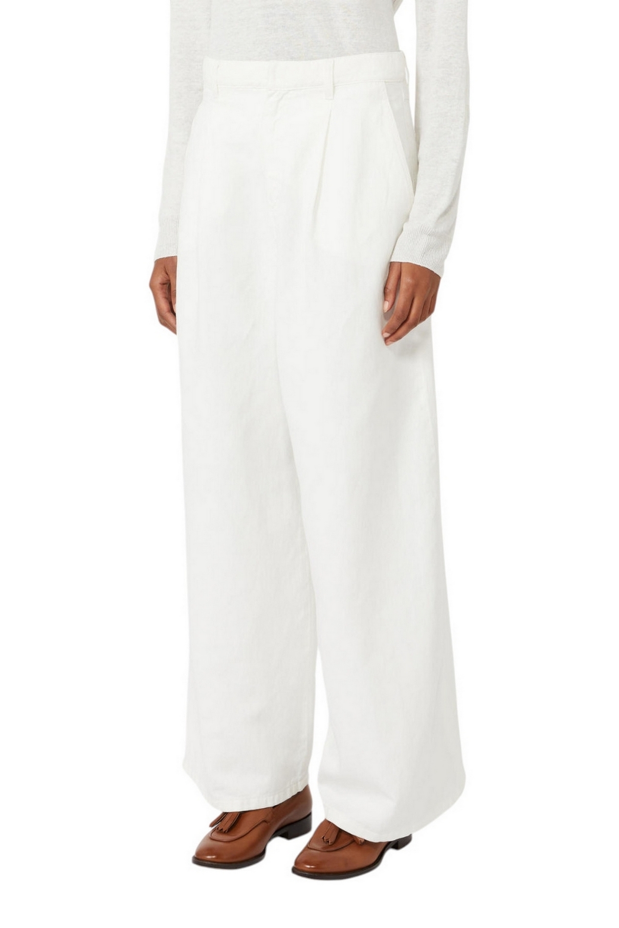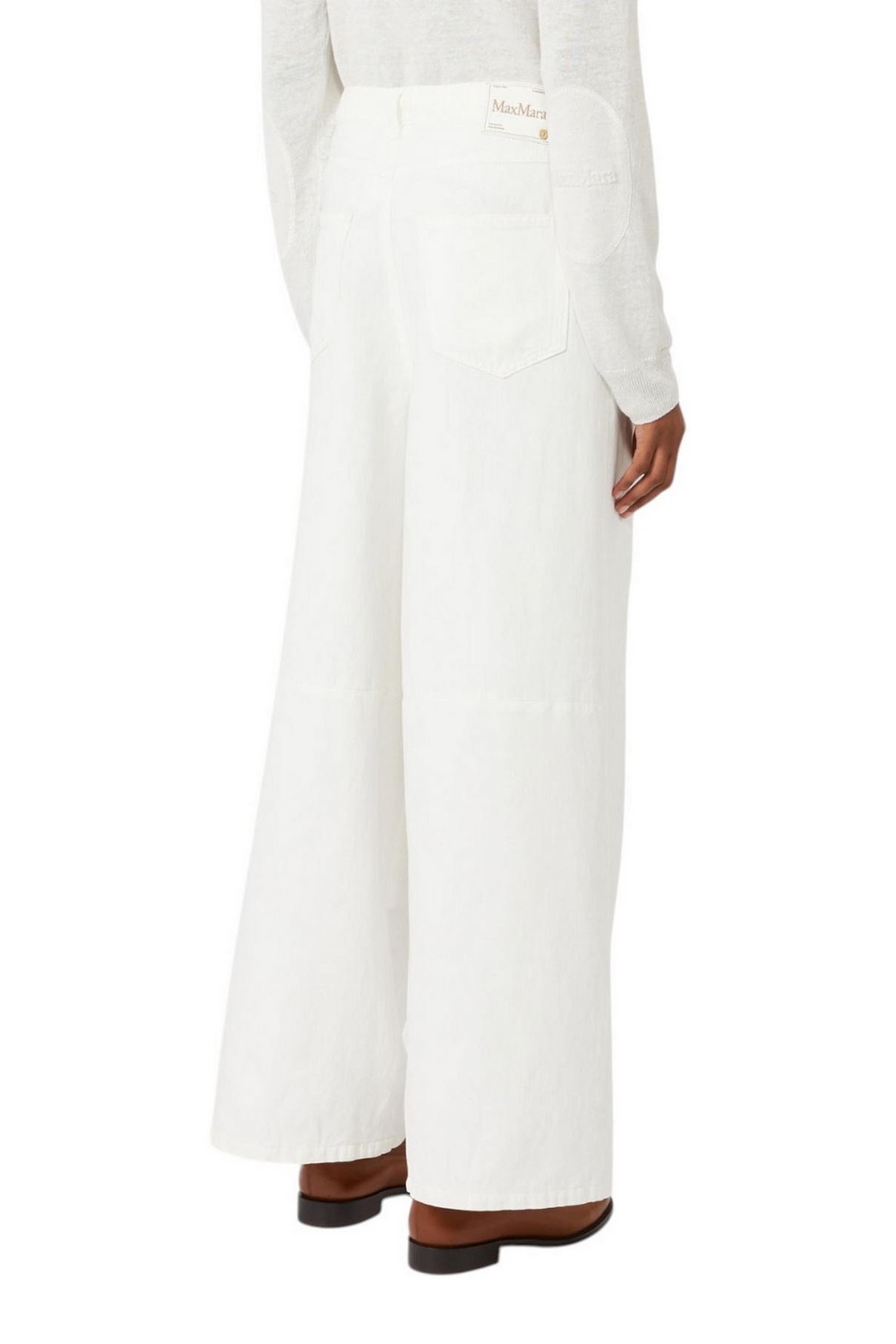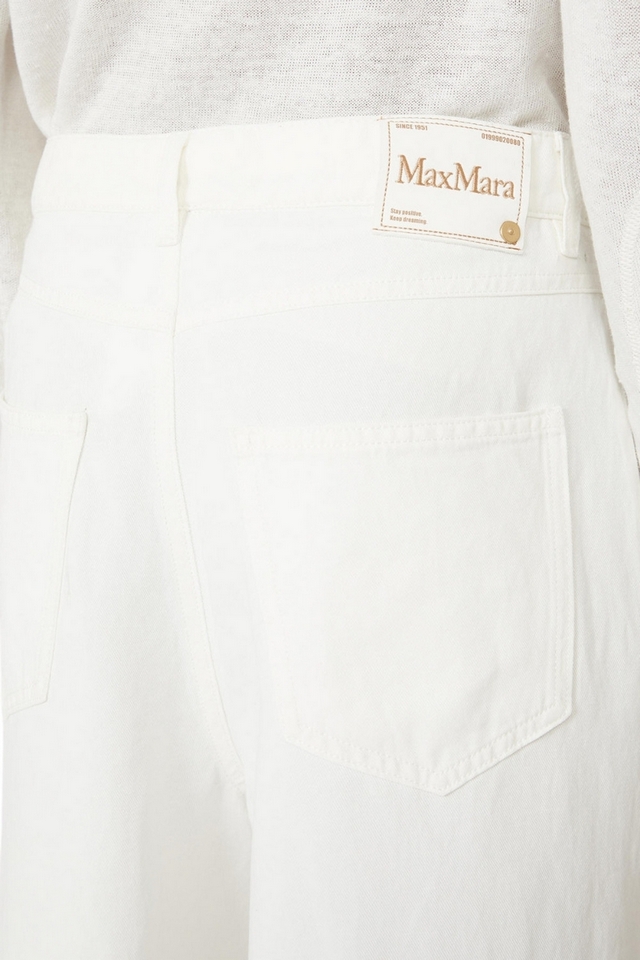 Pantalone ampio di MaxMara S caratterizzato da tagli orizzontali sul retro, all'altezza del ginocchio. Pantalone in drill di cotone e lino trattato in capo. Gamba larga con pinces sul davanti. Chiusura con listino alto in vita, zip con patta e gancetto. Tasche alla francese sui fianchi. Tasche a toppa sul retro. Passanti per cintura in vita. Label personalizzata in vita sul retro. Tessuto: 59% Cotone, 41% Lino