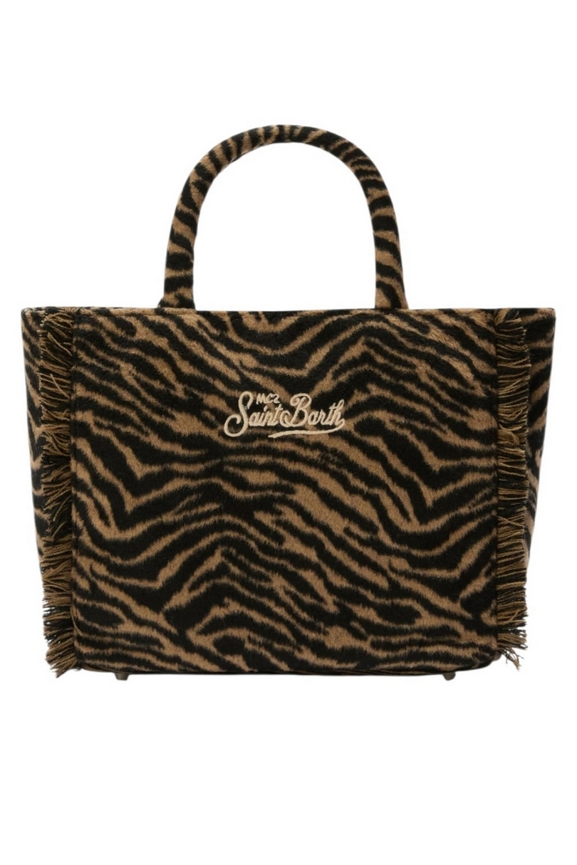 Borsa a mano in misto lana. Tracolla regolabile e removibile. Stampa zebrata. Tasca interna. Logo ricamato. Dimensioni: 27 x 25 x 14 cm. Composizione 75% poliestere 25% lana