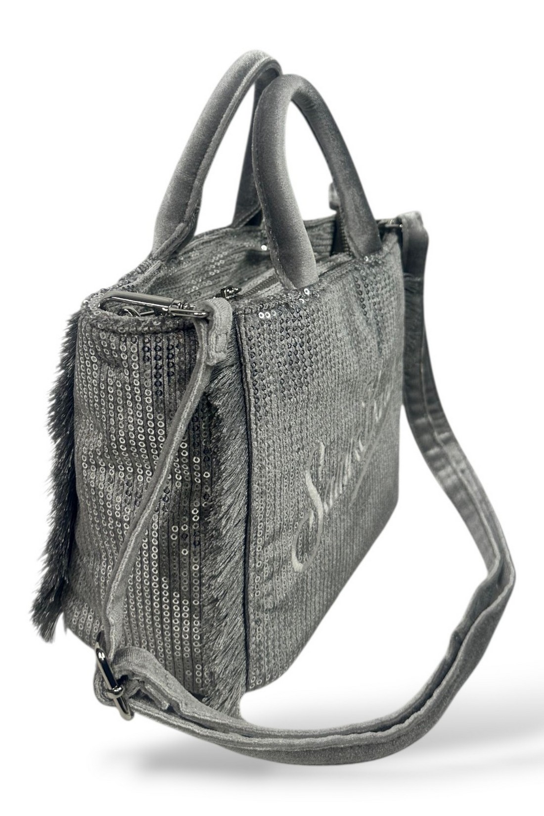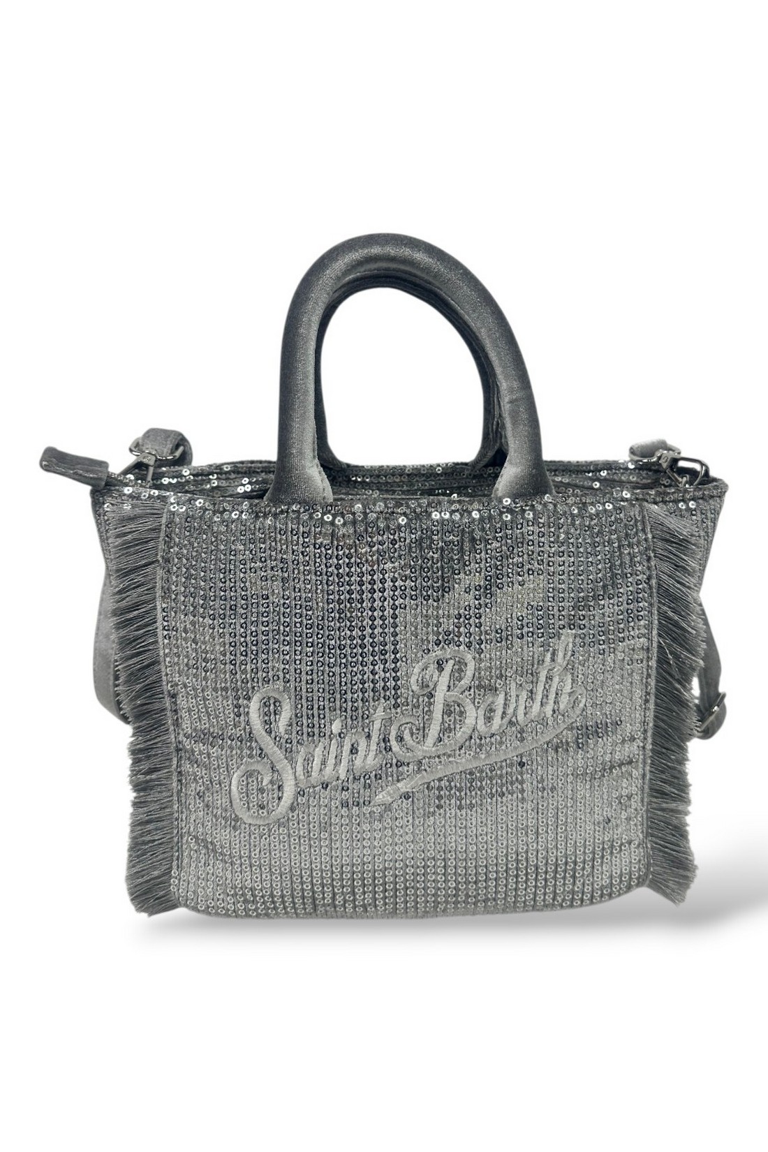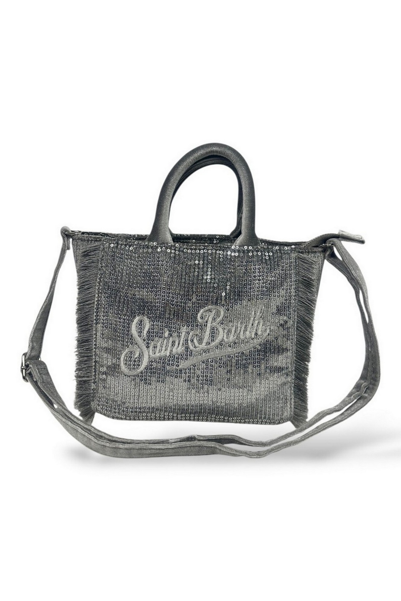 Borsa Vanity Mini Velvet di Mc2 Saint Barth con paillettes. Illumina ogni outfit. Borsa a mano. Velluto e paillettes. Manici in tessuto. Tracolla removibile e regolabile. Tasca interna. Logo ricamato, dettaglio frange. Dimensioni: 20 x 19 x 10 cm. Composizione: 100%Poliestere.