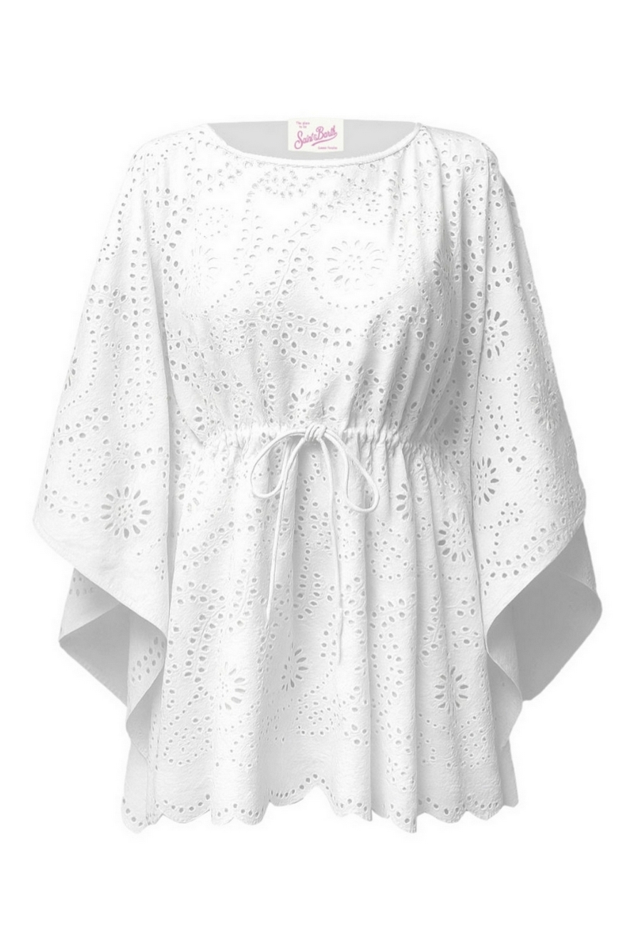Kaftano di Mc2 Saint Barth modello Iria. Realizzato in tessuto di cotone con motivo floreale cut-out. Scollo a barca. Coulisse regolabile in vita. Maniche lunghe a poncho. Vestibilità morbida. Composizione 100% cotone