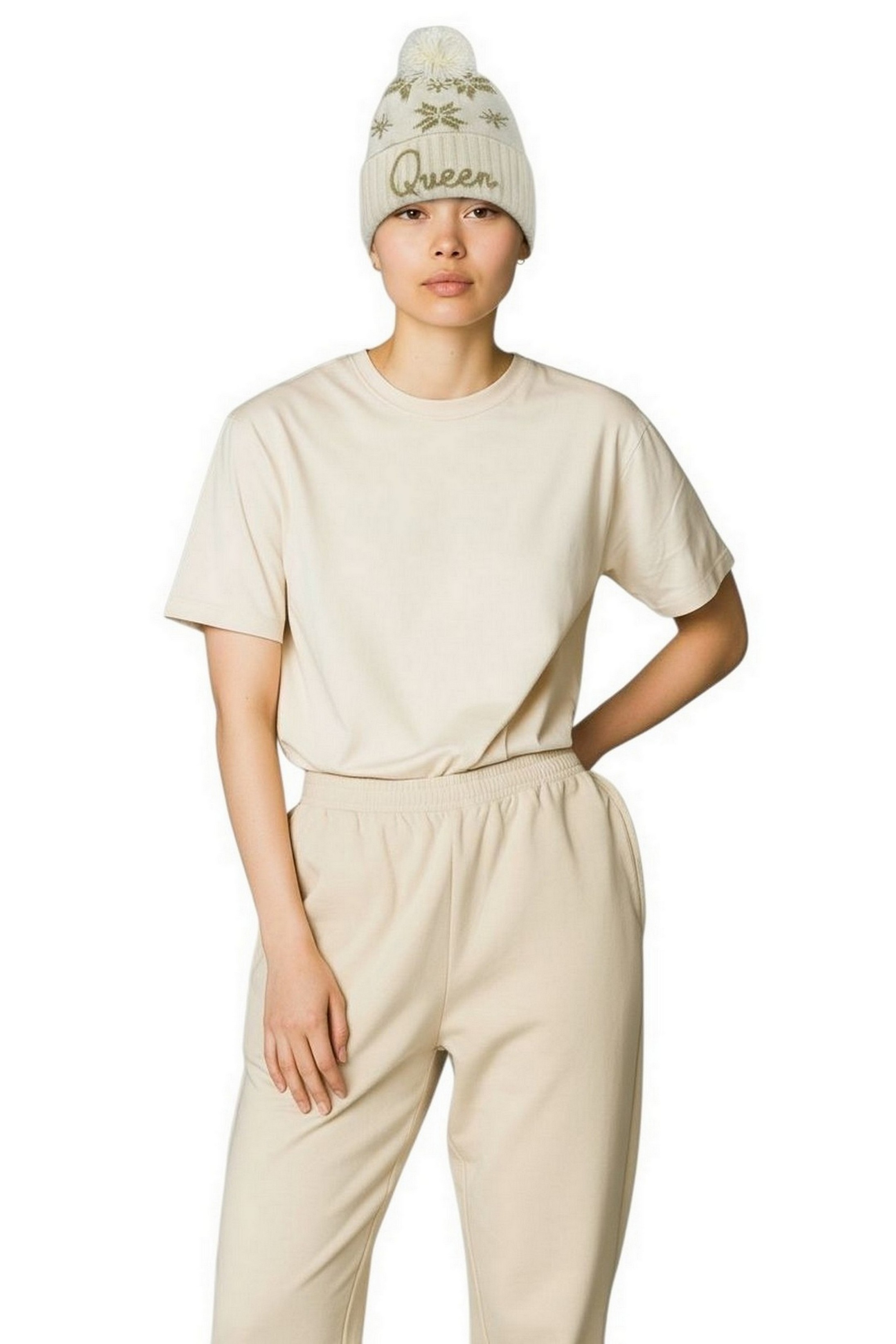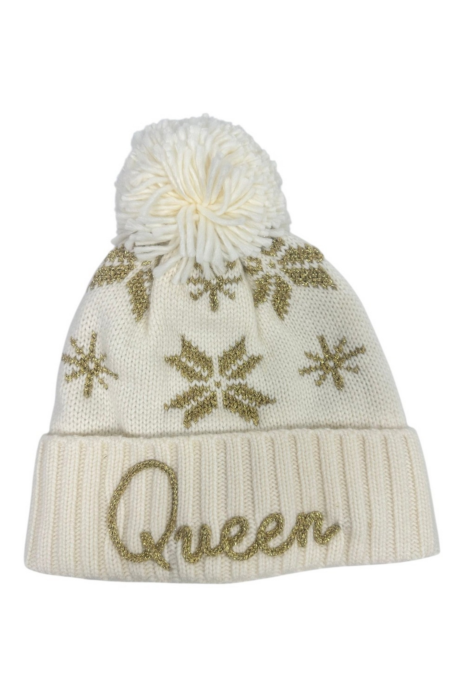 Cappelo di MC2 Saint Barth con pon pon. Fantasia fiocchi di neve in lurex oro. Scritta oro sul davanti. Composizione: 34% lana, 21% nylon; 21% viscosa, 15% poliestere, 9% cachemire.