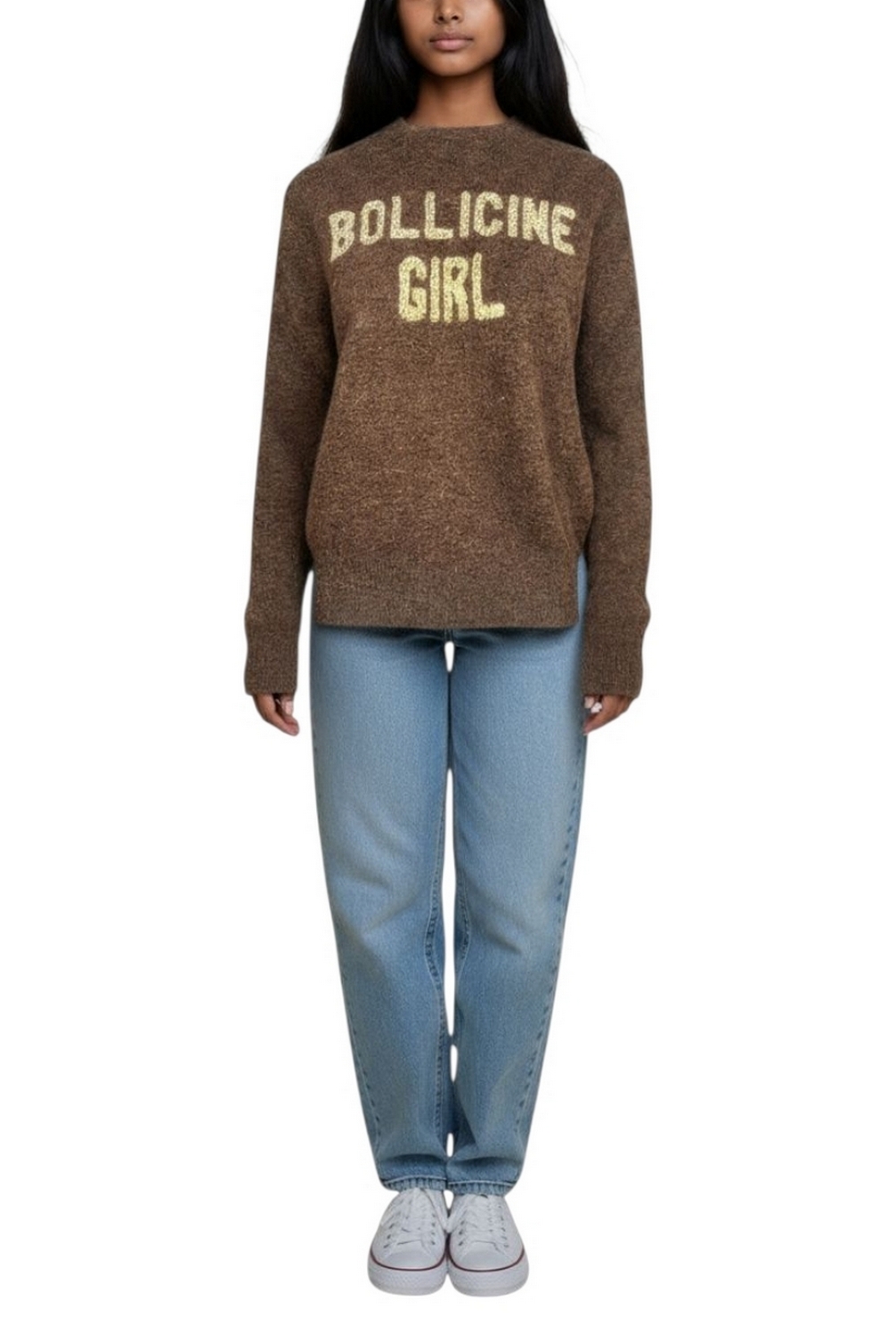 Maglione girocollo "Bollicine Girl" con strass di Mc2 SaintBarth. Taglio regolare, morbido e confortevole, con linea diritto che si adatta facilmente a diverse silhouette senza risultare aderente. La leggera elasticità del tessuto assicura comodità e libertà di movimento, ideale per essere indossato anche in sovrapposizione. Realizzato in filato marrone mélange con scritta frontale "Bollicine Girl" in strass applicati, dal tocco luminoso e glamour. Girocollo classico, polsini e fondo a costine elasticizzate. Texture soffice al tatto, effetto peluche grazie allalpaca, finiture curate e dettagli che aggiungono personalità e modernità al capo. Composizione: 32% alpaca, 32% lana, 30% nylon, 6% elastan. Perfetto per autunno e inverno, da abbinare a jeans slim, pantaloni morbidi o gonne in tessuto per look casual chic. Ideale anche su leggings e stivali per outfit rilassati ma di tendenza. Si presta a essere indossato sia di giorno che per serate informali grazie al dettaglio luminoso degli strass e alla versatilità del colore neutro. Il maglione "Bollicine Girl" con strass è la scelta perfetta per chi cerca comfort, stile e un pizzico di ironia. Leffetto mélange si abbina facilmente a ogni tipo di outfit, mentre la scritta in strass dona luce e carattere, rendendo unico anche il look più semplice. La qualità dei filati garantisce calore, resistenza e una piacevole morbidezza sulla pelle. Pratico e chic, è pensato per accompagnarti nelle giornate più fredde con il sorriso, senza rinunciare alleleganza e allo spirito giocoso. Un must-have per il guardaroba femminile contemporaneo.
