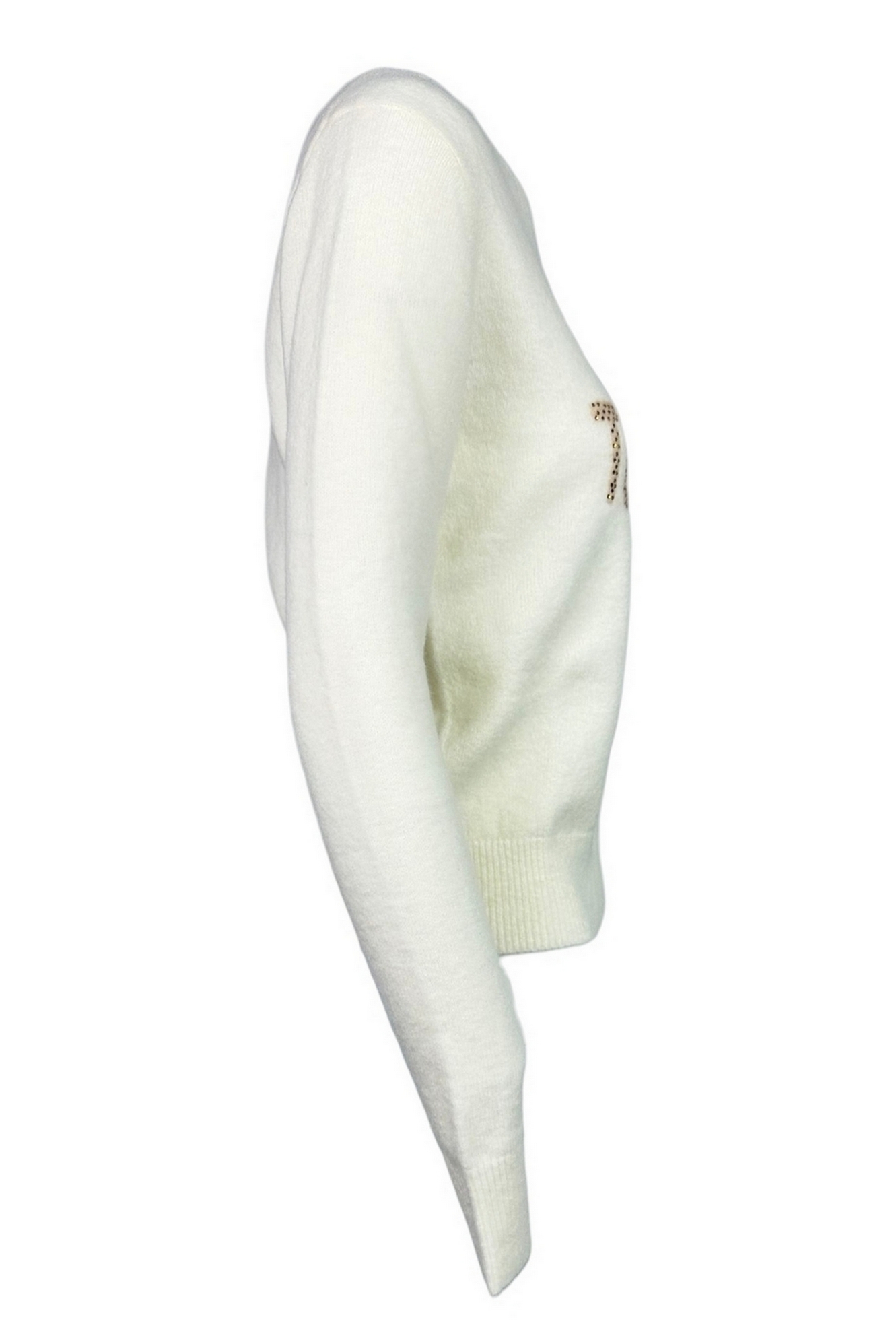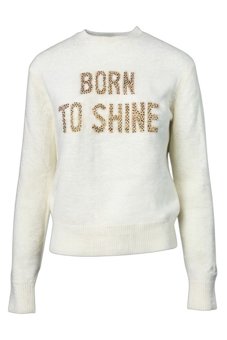 Maglione girocollo "Born to Shine" con strass di Mc2SaintBarth. Vestibilità regolare, confortevole e adattabile a diverse tipologie di silhouette. Taglio diritto e spalla classica, per una maglia facile da indossare sia come primo strato che in abbinamento a camicie o t-shirt leggere. Maglione bianco panna in filato morbido, caratterizzato dalliconica scritta BORN TO SHINE applicata con strass dorati frontali. Rifiniture a costine su collo, polsi e fondo. Texture soffice e piacevole grazie alla presenza di fibre pregiate che garantiscono calore ed elasticità. Composizione: 32% alpaca, 32% lana merino extrafine, 30% poliammide, 6% elastan. Capo ideale per la stagione fredda, da abbinare facilmente sia a jeans sia pantaloni sartoriali per look sbarazzini e chic. Perfetto con sneakers per il giorno o con stivali alti per la sera, valorizza outfit casual e dona luce anche ad abbinamenti più eleganti grazie ai dettagli sparkling. Ideale anche sotto cappotti over o giacche in pelle, per outfit grintosi e contemporanei. Il maglione "Born to Shine" è pensato per chi ama uno stile confortevole, senza rinunciare a un twist luminoso e distintivo. Sofisticato e ironico allo stesso tempo, esalta la qualità dei filati con una lavorazione che assicura morbidezza e durata nel tempo. Il tocco di strass dorati dona personalità e fa brillare ogni look, perfetto per chi vuole esprimere grinta e positività nella vita di tutti i giorni.