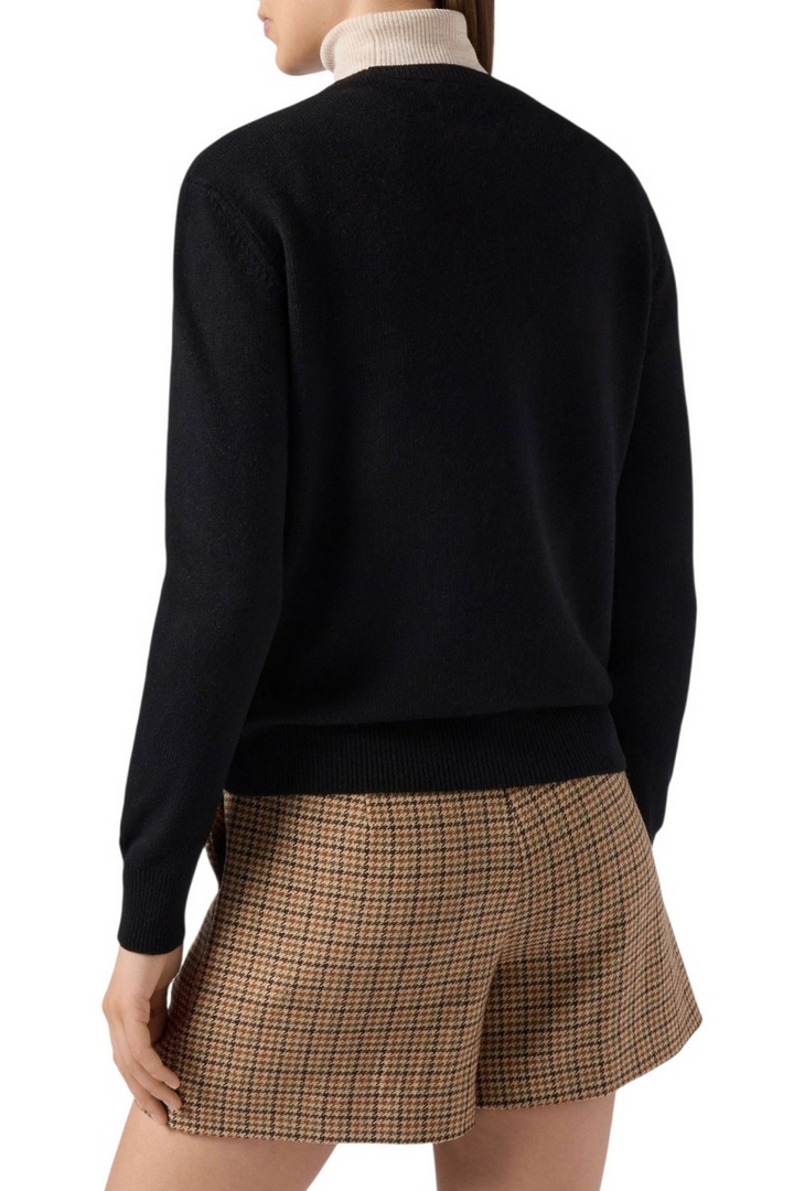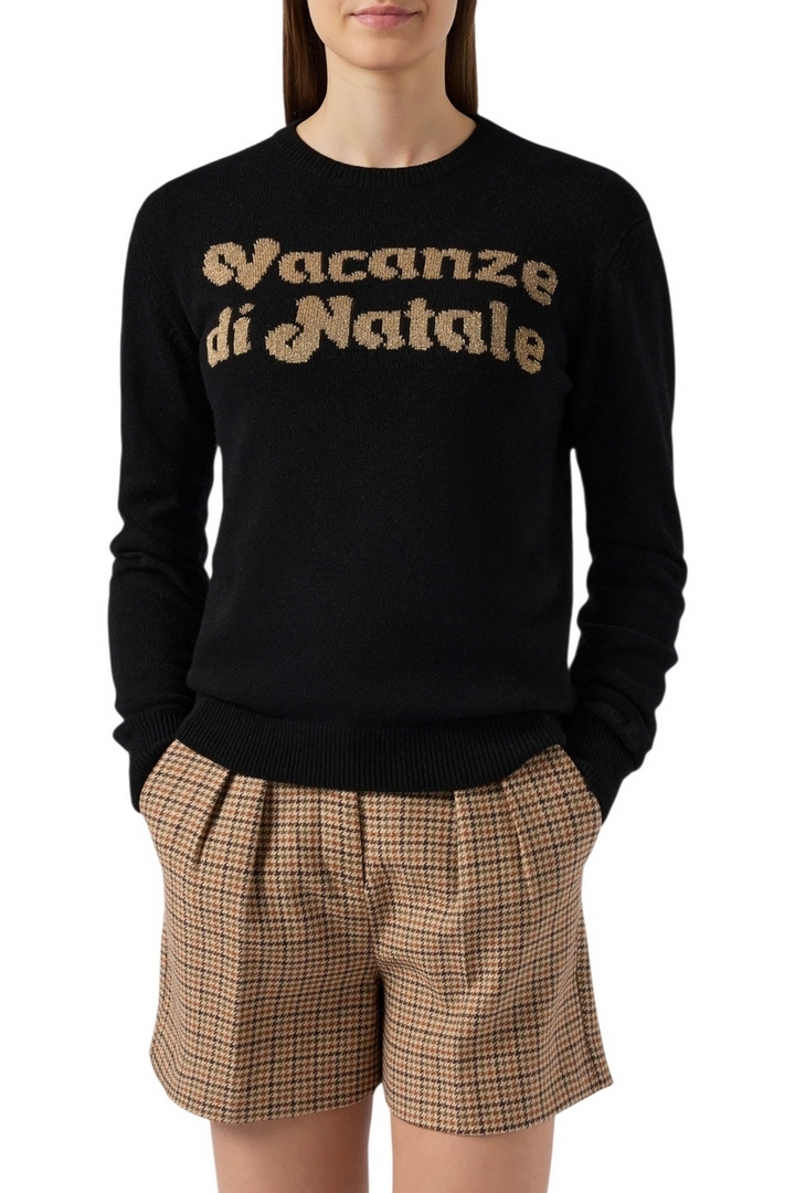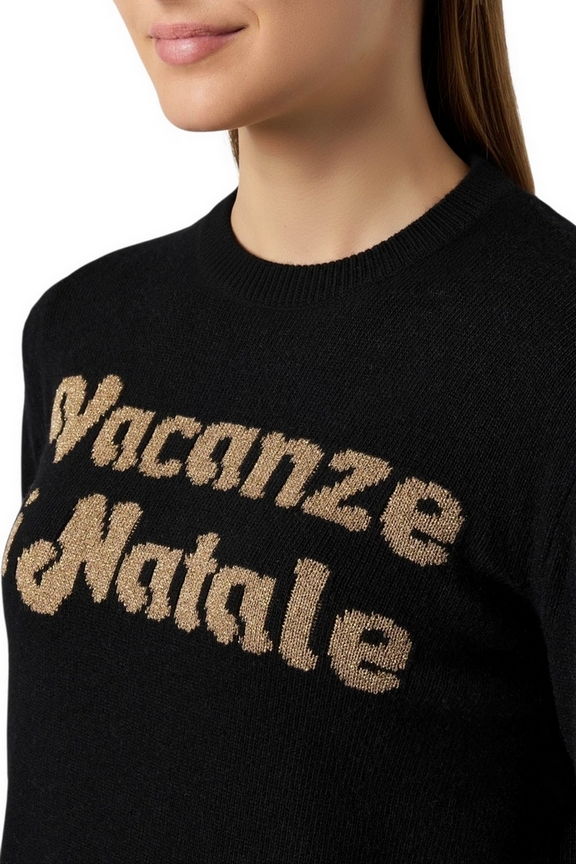 Maglia di MC2 Saint Barth modello New Queen, girocollo, scritta in lurex oro " Vacanze di Natale".Composizione: 45% lana, 30% viscosa, 15% poliammide, 10% cachemire.