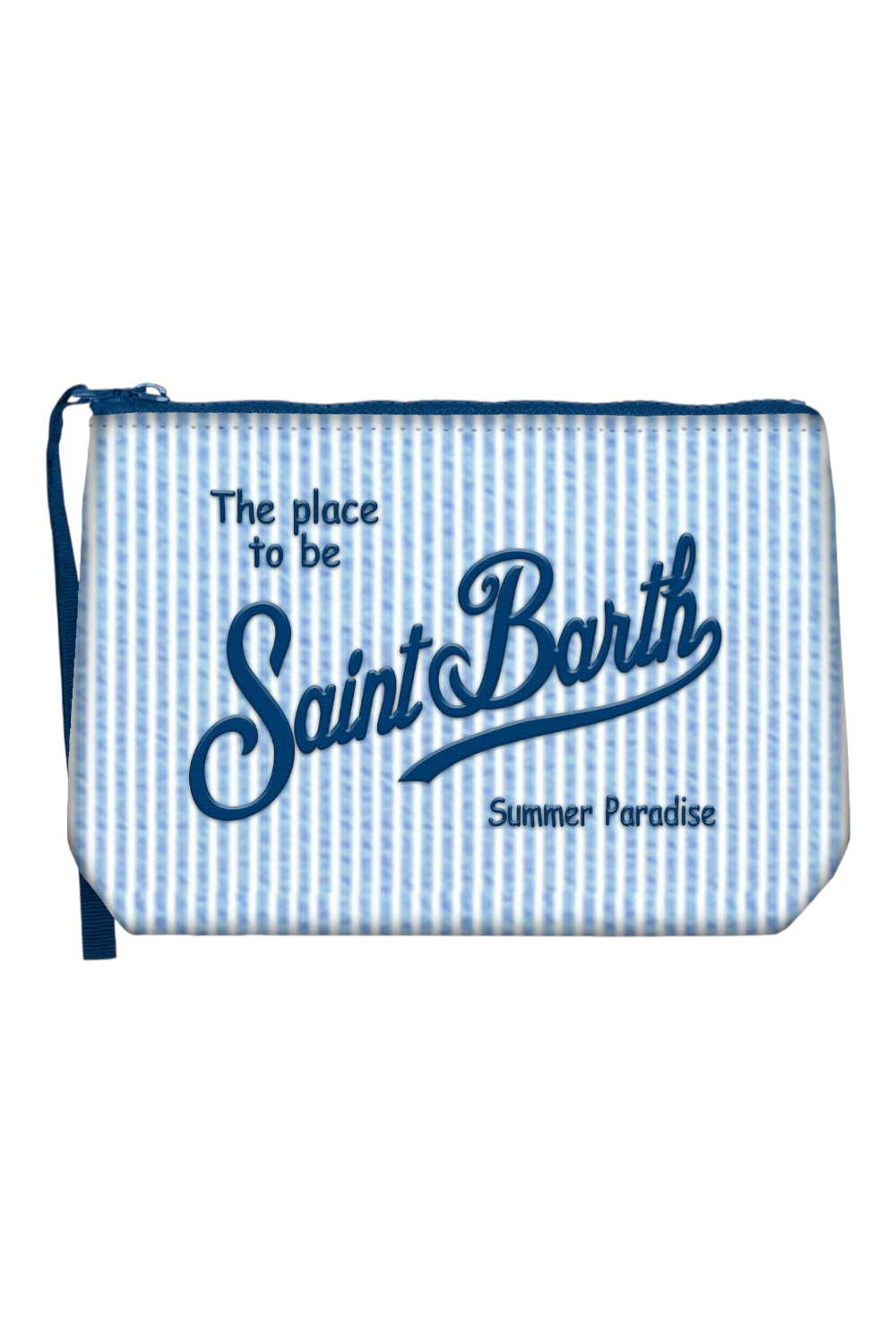 Pochette di MC2 Saint Barth in cotone. Fantasia righe.Chiusura con zip. Polsiera. Logo ricamato. Dimensioni 20x14,4x7.