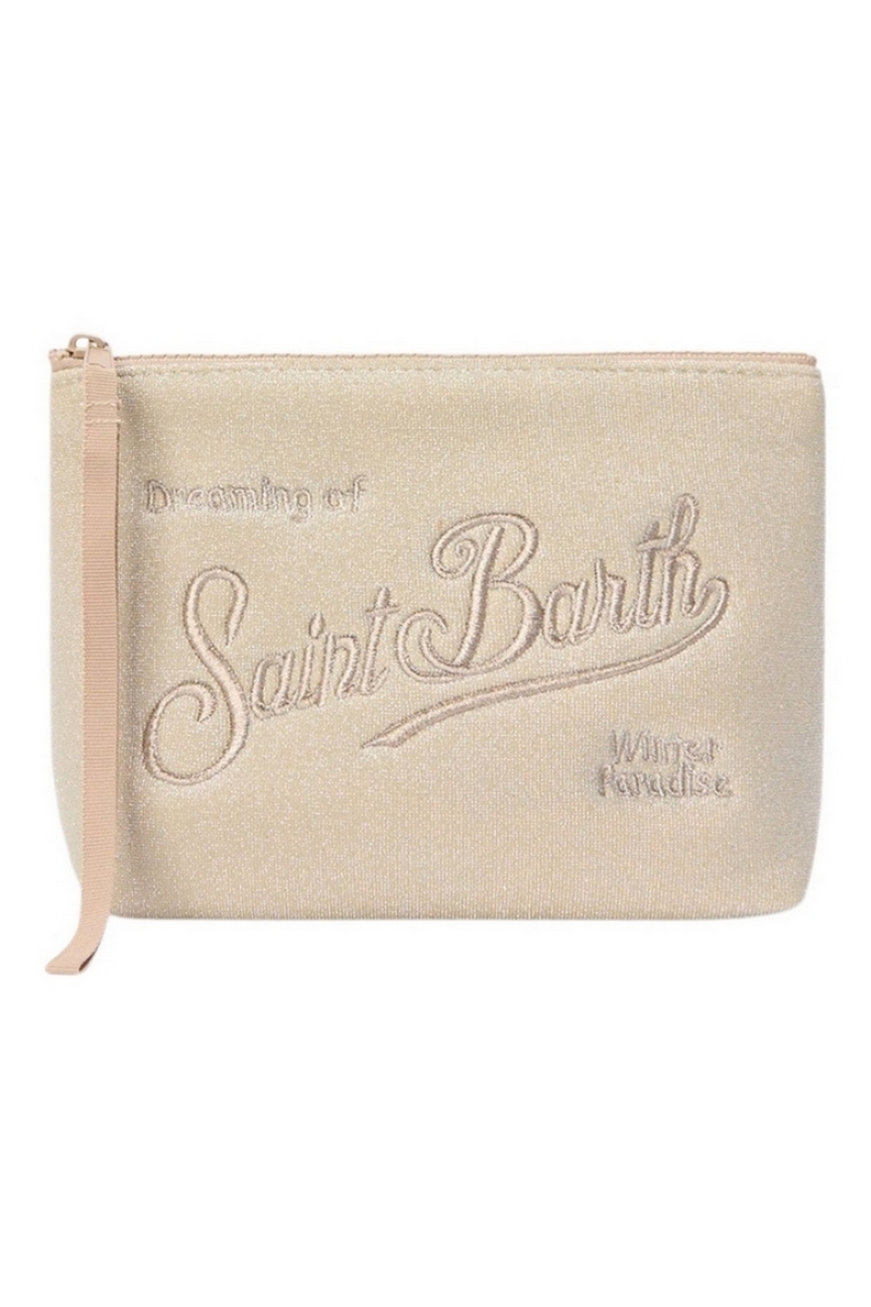 Pochette di MC2 Saint Barth in neoprene effetto lurex,chiusura con zip, logo ricamato, passante per polso in gros-grain. Dimensioni 21 x 15,5 x 7 cm . Composizione: 70% SBR 30% PL