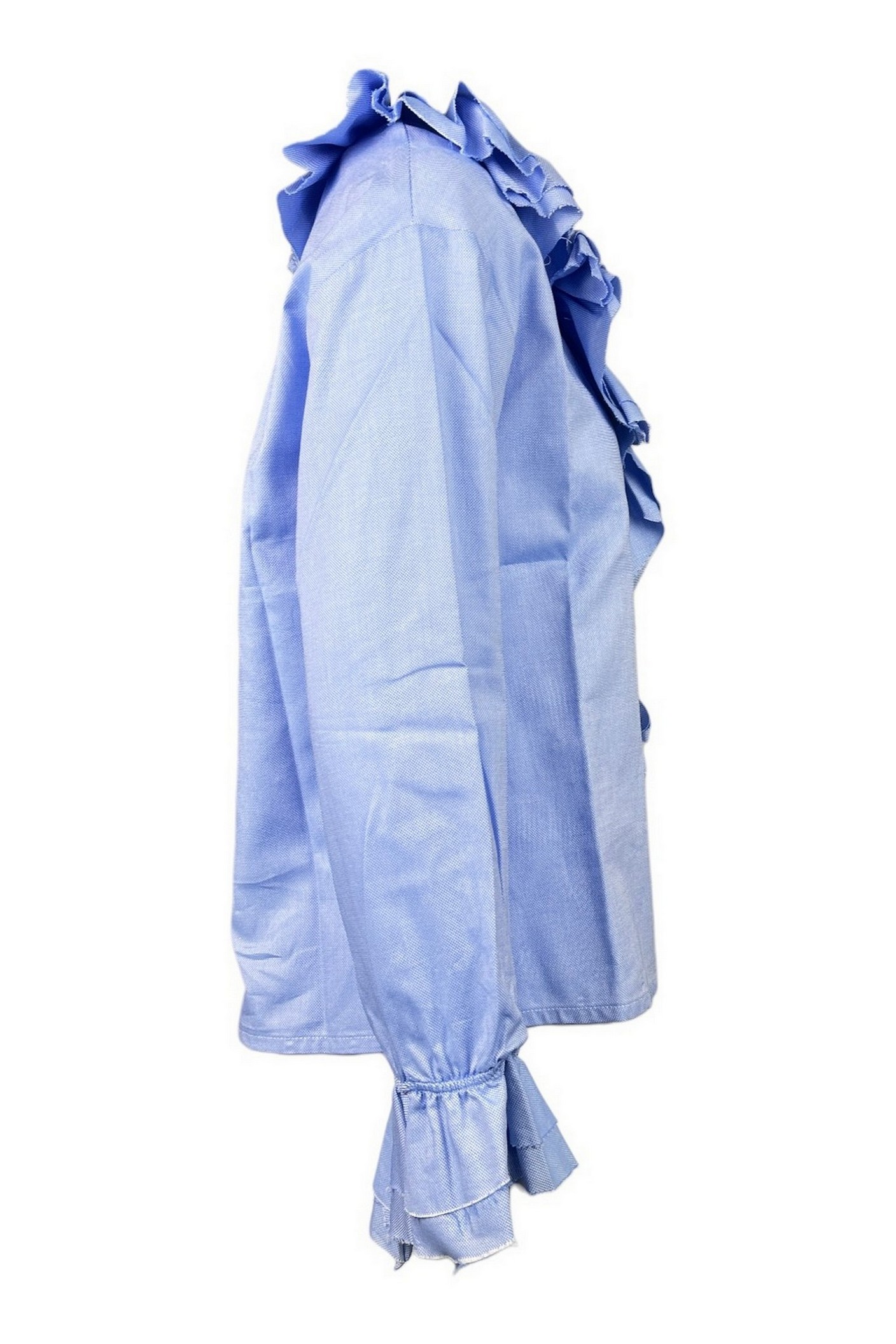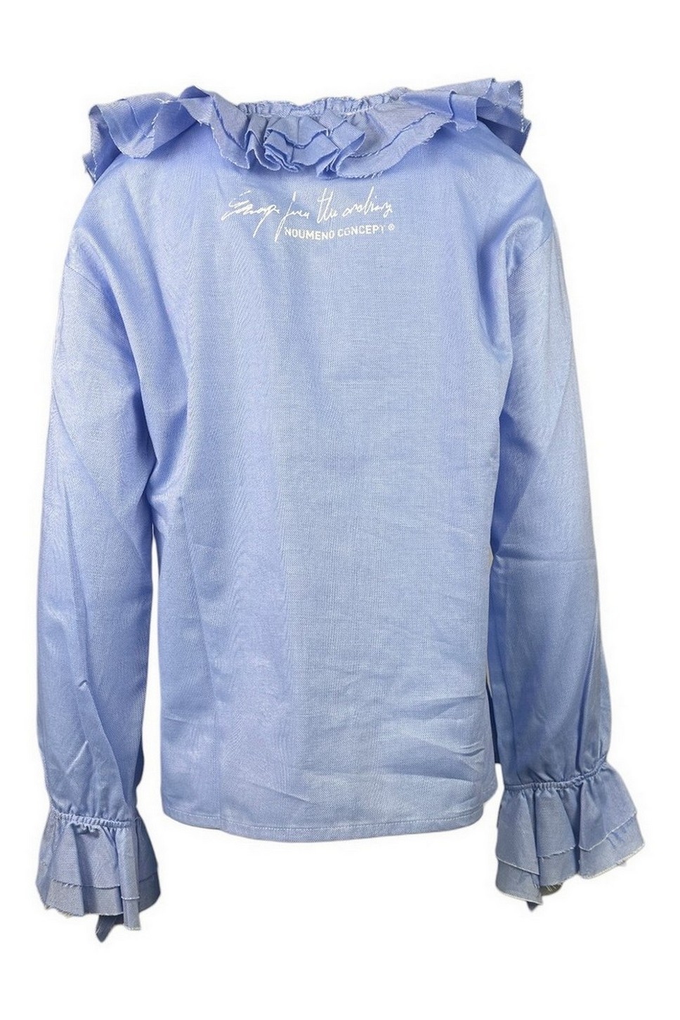 Camicia di Noumeno Concept in oxford. Modello da infilare. Scolloo a v . Dettagli rouche scollatura e polsi. Scritta sul retro. Spacchi laterali. Vestibilità over. Composizione: 100% cotone.