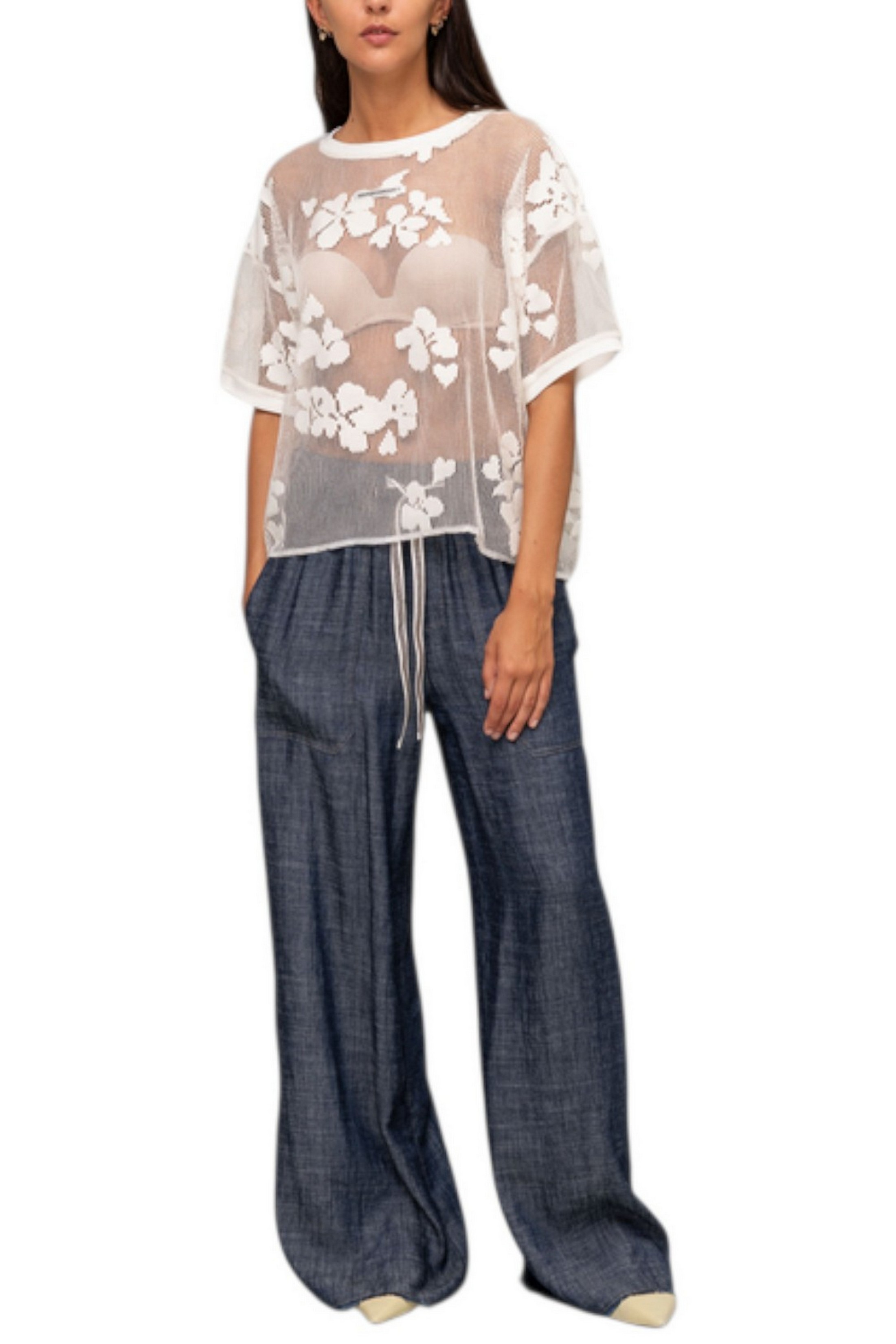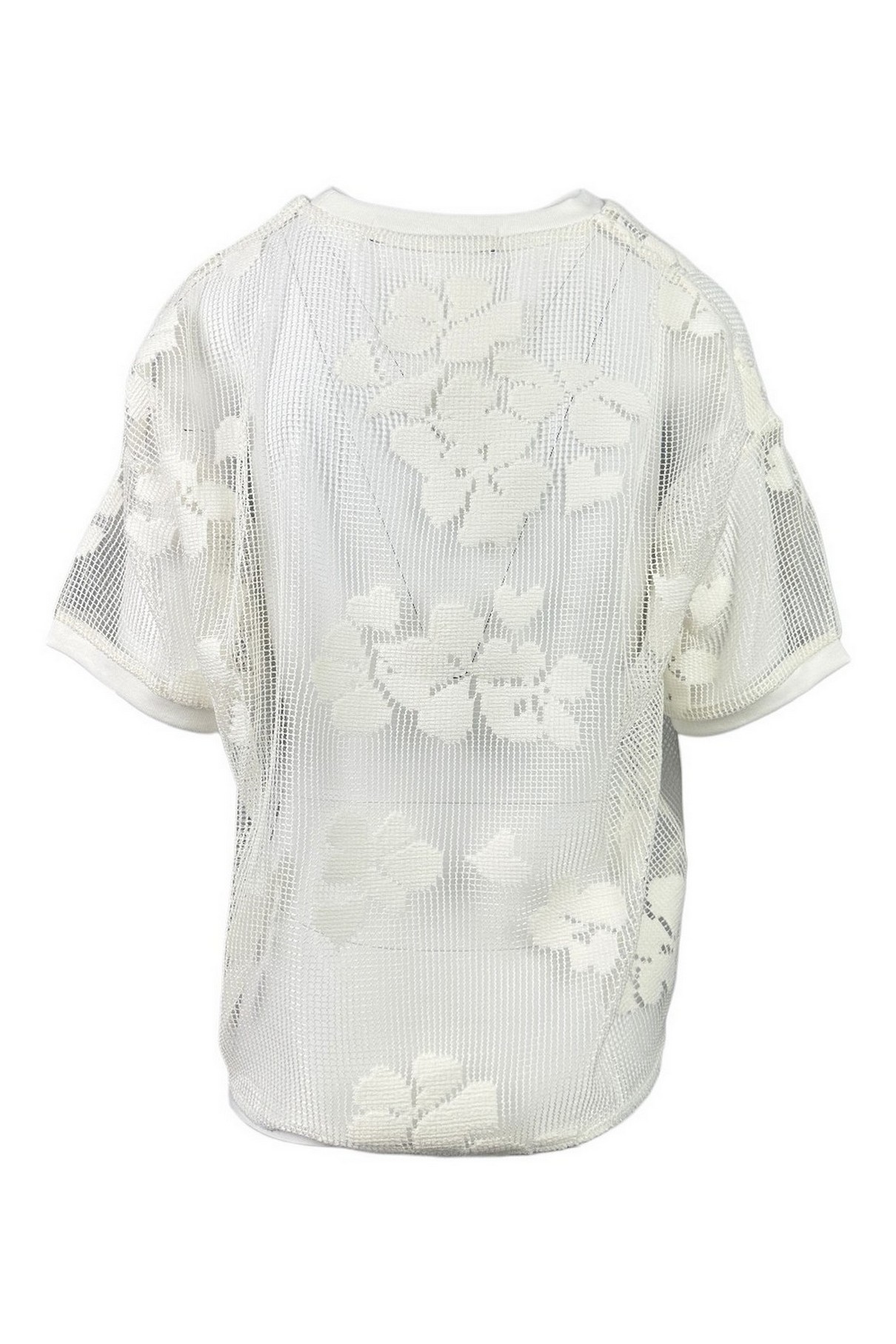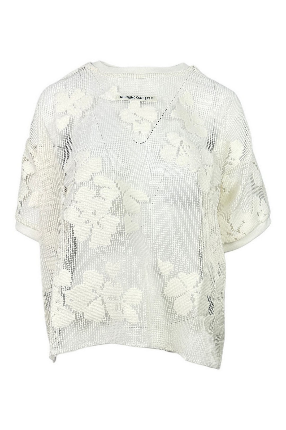 T-shirt di Noumeno Concept in rete. Lavorazione floreale. Girocollo. Mezze maniche. Logo sul davanti Vestibilità a scatola. Composizione: 80% poliestere, 20% cotone. Made in Italy.