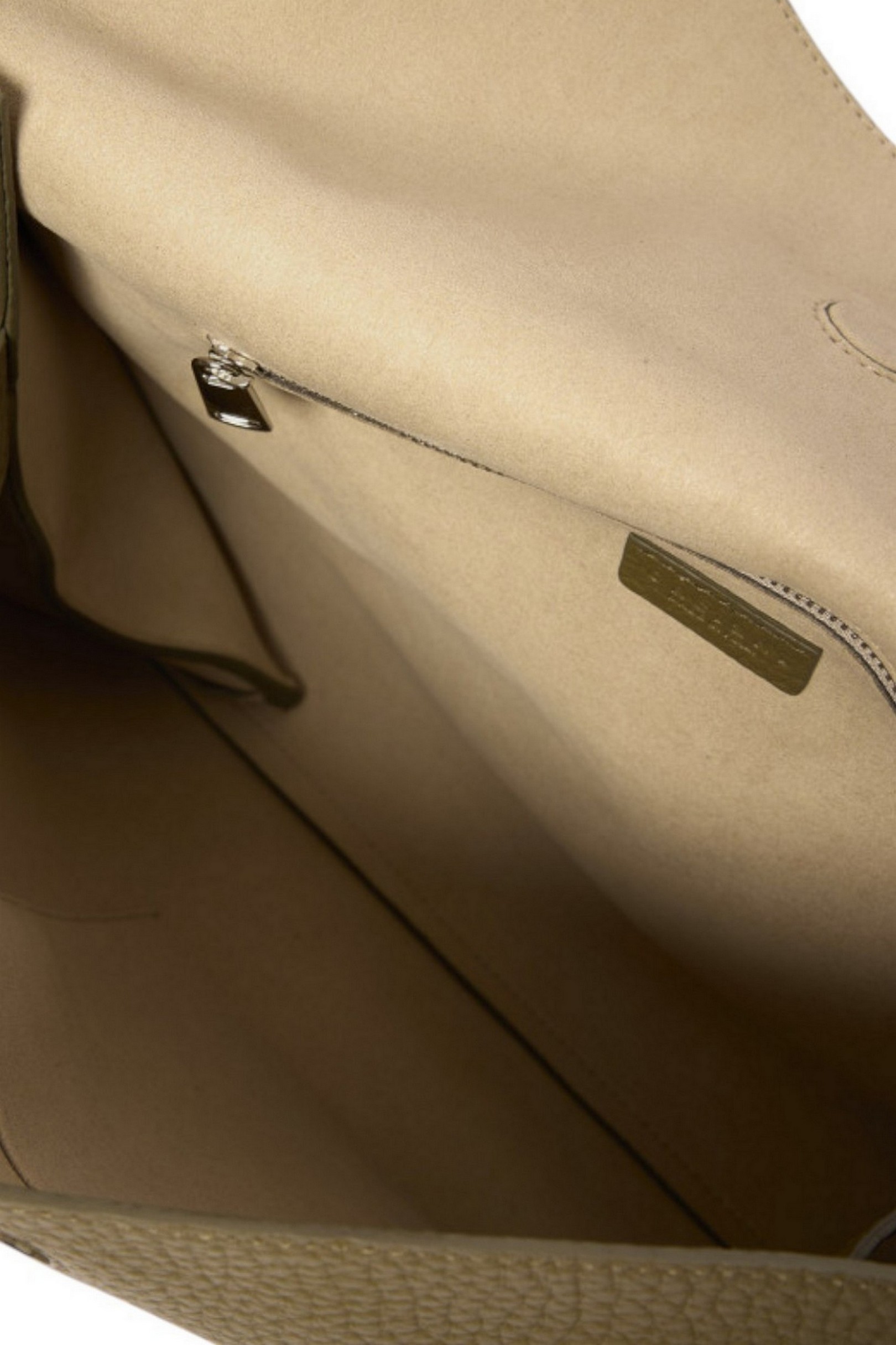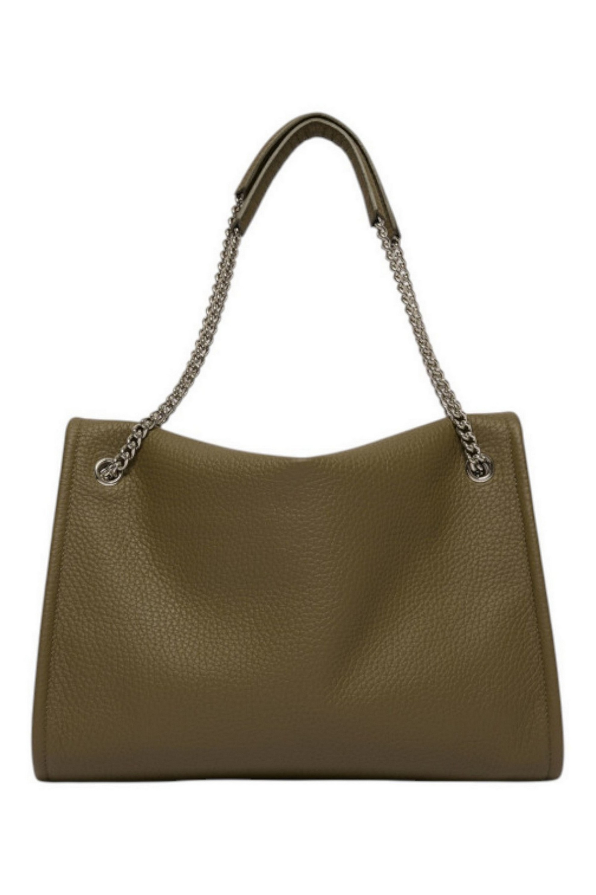 Dimensioni: Larghezza: 40 cm / Altezza: 30 cm / Profondità: 10 cm. Tasche: due taschini interni di cui uno con zip. Chiusura: con patta e bottoni magnetici, dettaglio fibbia. Funzionalità: manici a spalla in catena e pelle. Materiale: pelle di vitello martellata