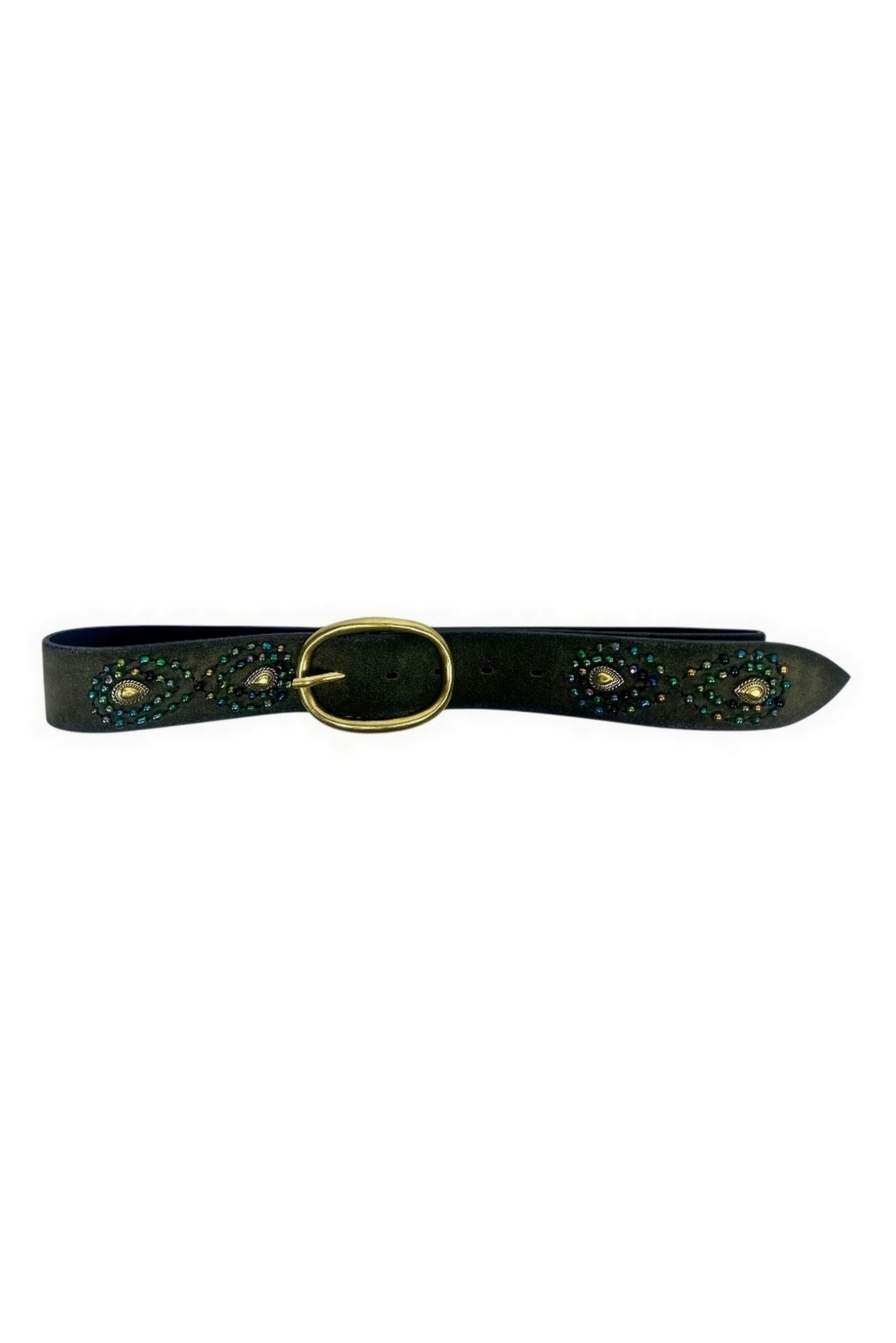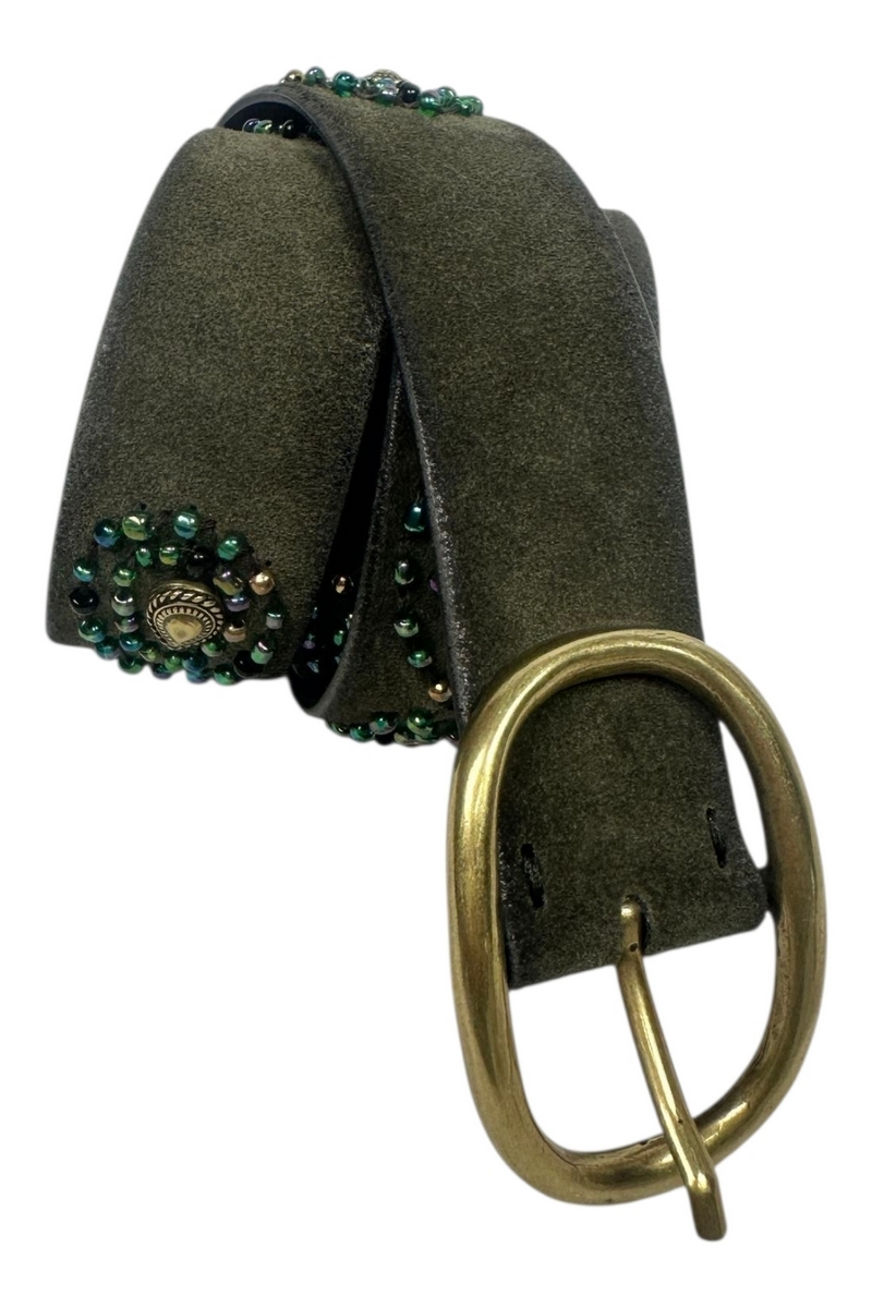 Cintura in pelle decorata con pietre Puntovita & Arsenice. Vestibilità regolabile grazie alla fibbia tonda in metallo dorato, studiata per adattarsi facilmente in vita o sui fianchi, ideale per completare pantaloni, gonne o abiti dal taglio versatile. Realizzata in vera pelle verde scuro, impreziosita da delicate applicazioni di pietre verdi e dettagli metallici bronzati lungo tutta la lunghezza. La fibbia dorata aggiunge un tocco vintage ed elegante, mentre le finiture precise rendono laccessorio resistente e ricercato.Composizione: pelle, dettagli metallici e pietre sintetiche decorative. Indicata per tutte le stagioni e perfetta con jeans, gonne midi, vestiti ampi e look boho-chic o rock. Si abbina facilmente sia a capi casual che a outfit più ricercati, donando un tocco di carattere e originalità anche agli abbinamenti minimal. Questa cintura in pelle decorata unisce artigianalità e stile contemporaneo. Le pietre verdi e i dettagli metallici donano luminosità e personalità, facendo di ogni outfit unespressione unica di gusto e tendenza. Ideale per chi cerca un accessorio distintivo e versatile, capace di valorizzare ogni look con eleganza e creatività. Accessorio perfetto per valorizzare ogni outfit. Perfetto per completare qualsiasi look, dal più casual al più sofisticato. La composizione dei tessuti offre leggerezza e comfort. Eleganza discreta per un prodotto versatile e senza tempo. Dettagli e lavorazioni di tendenza conquistano i fashion lover.