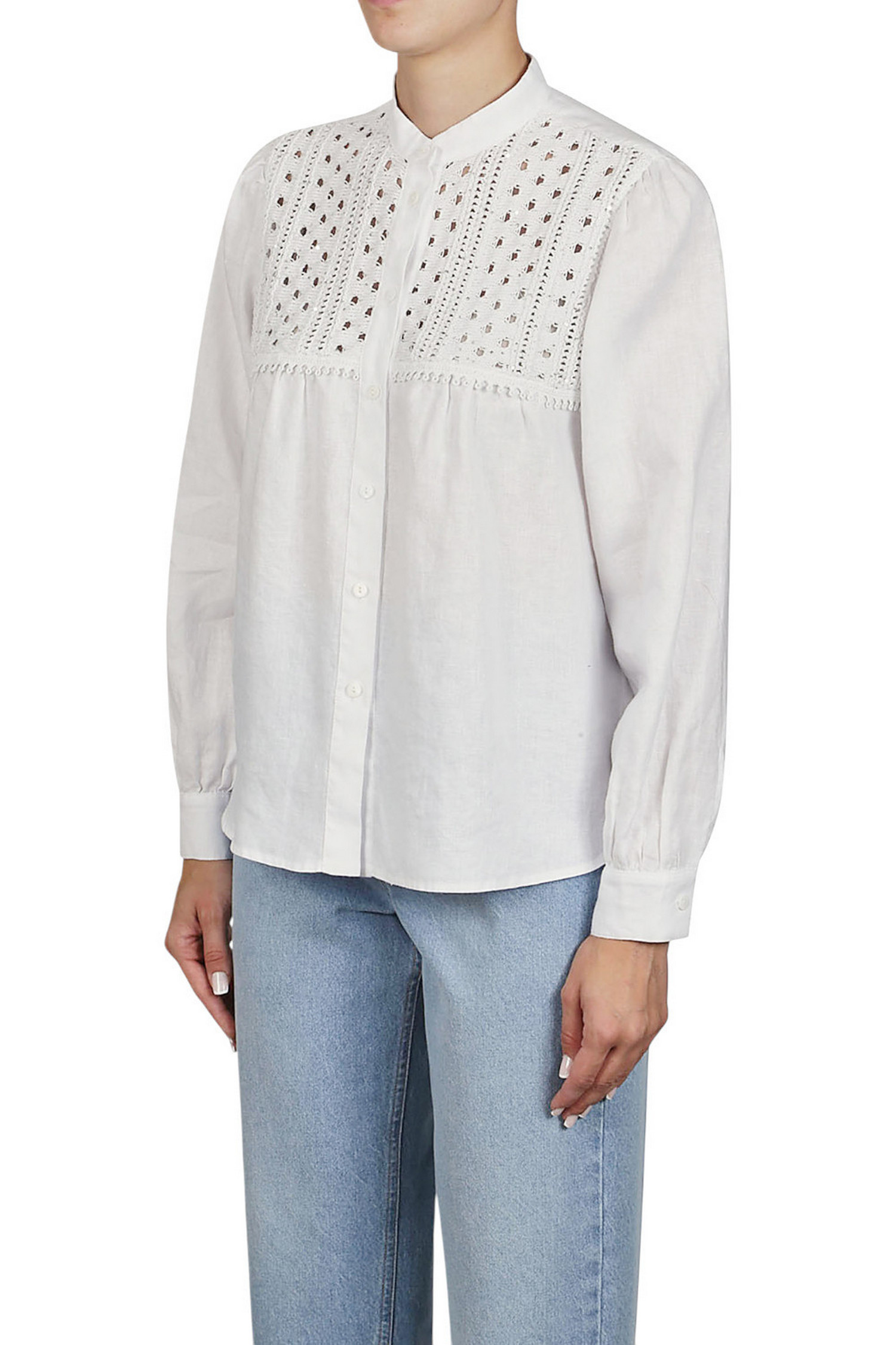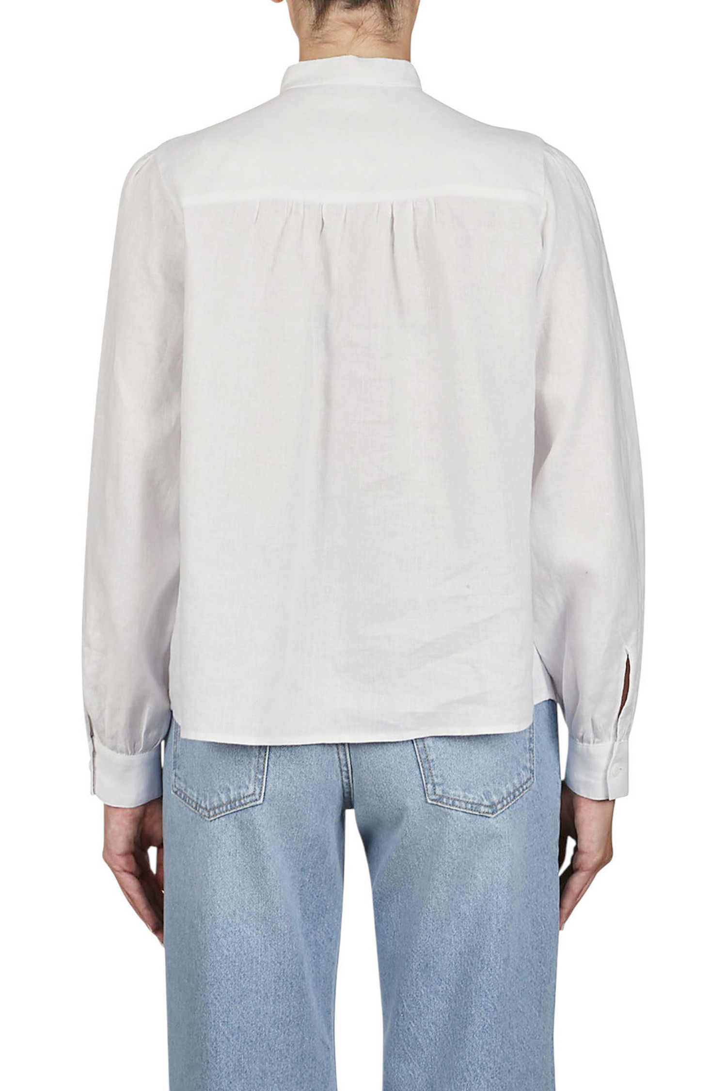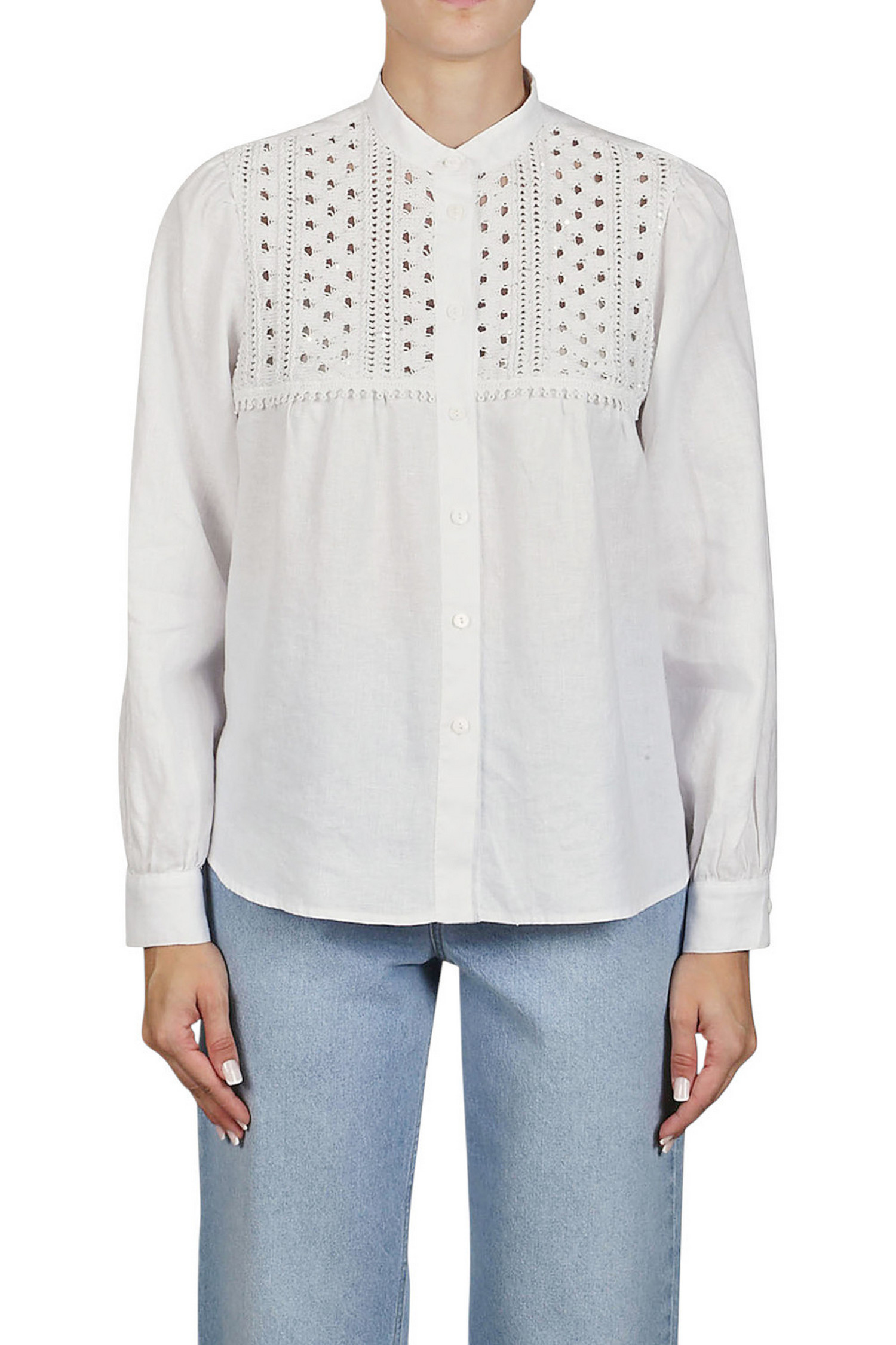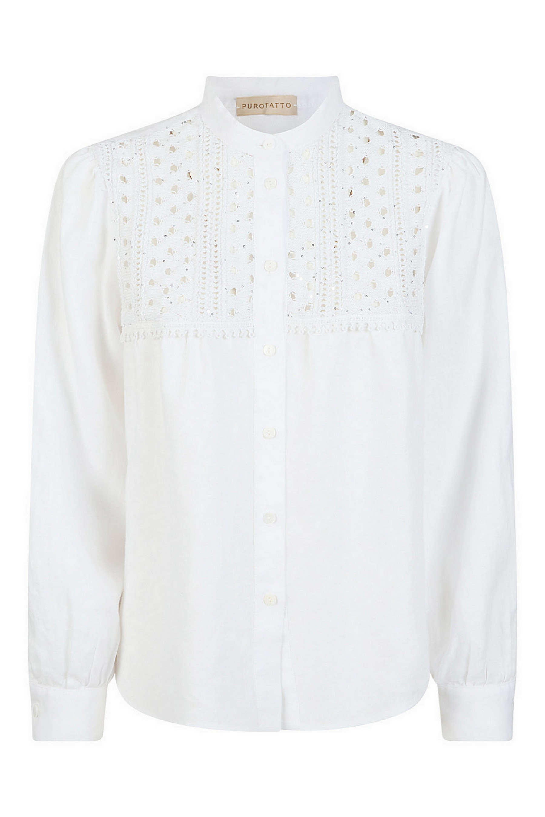 Camicia di Purotatto. Lino. Lavorazione a lucinetto con micro paillettes. Collo alla coreana. Vestibilità morbida. Composizione: 96% cotone, 4% poliestere. Made in Italy.