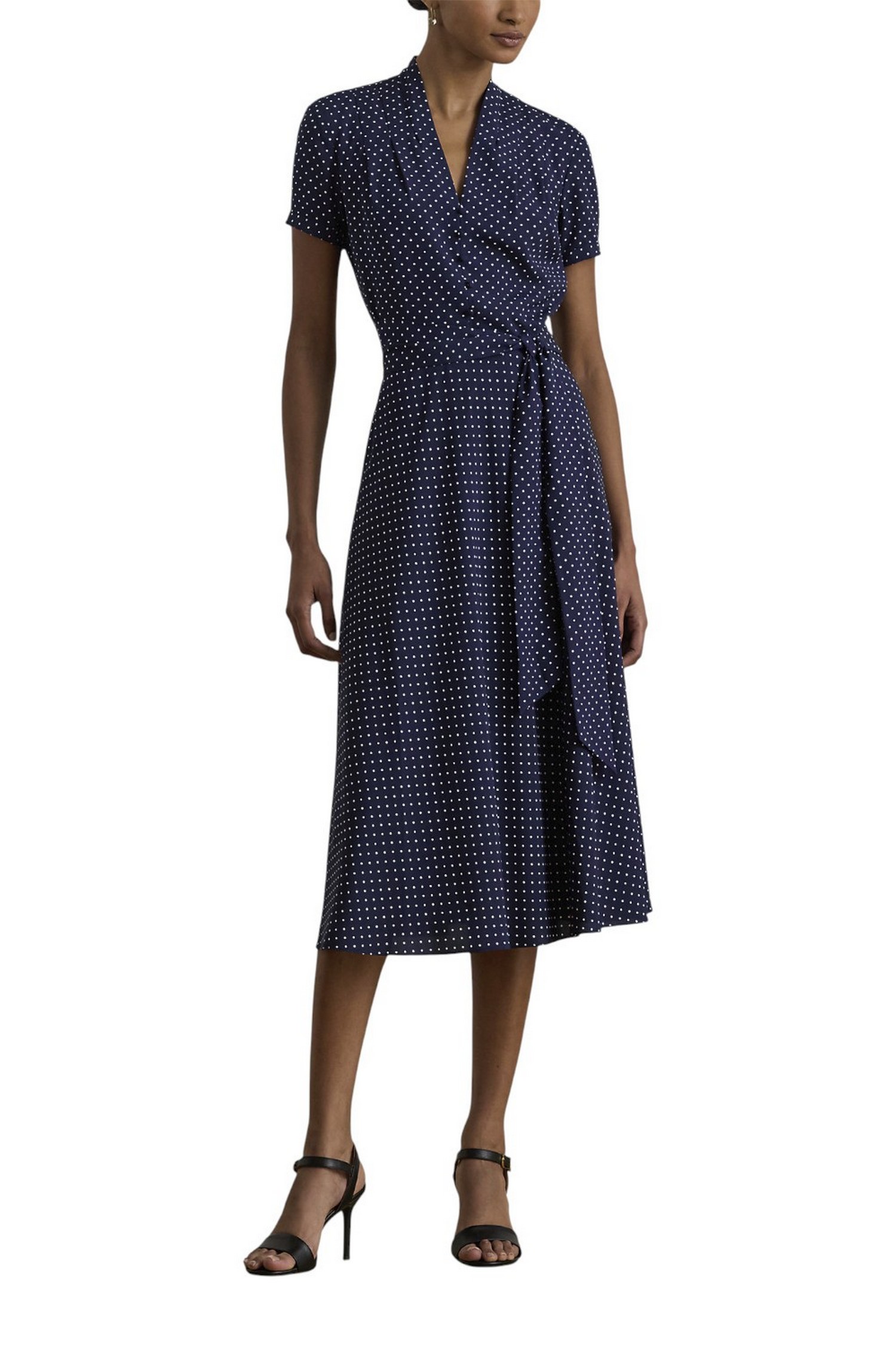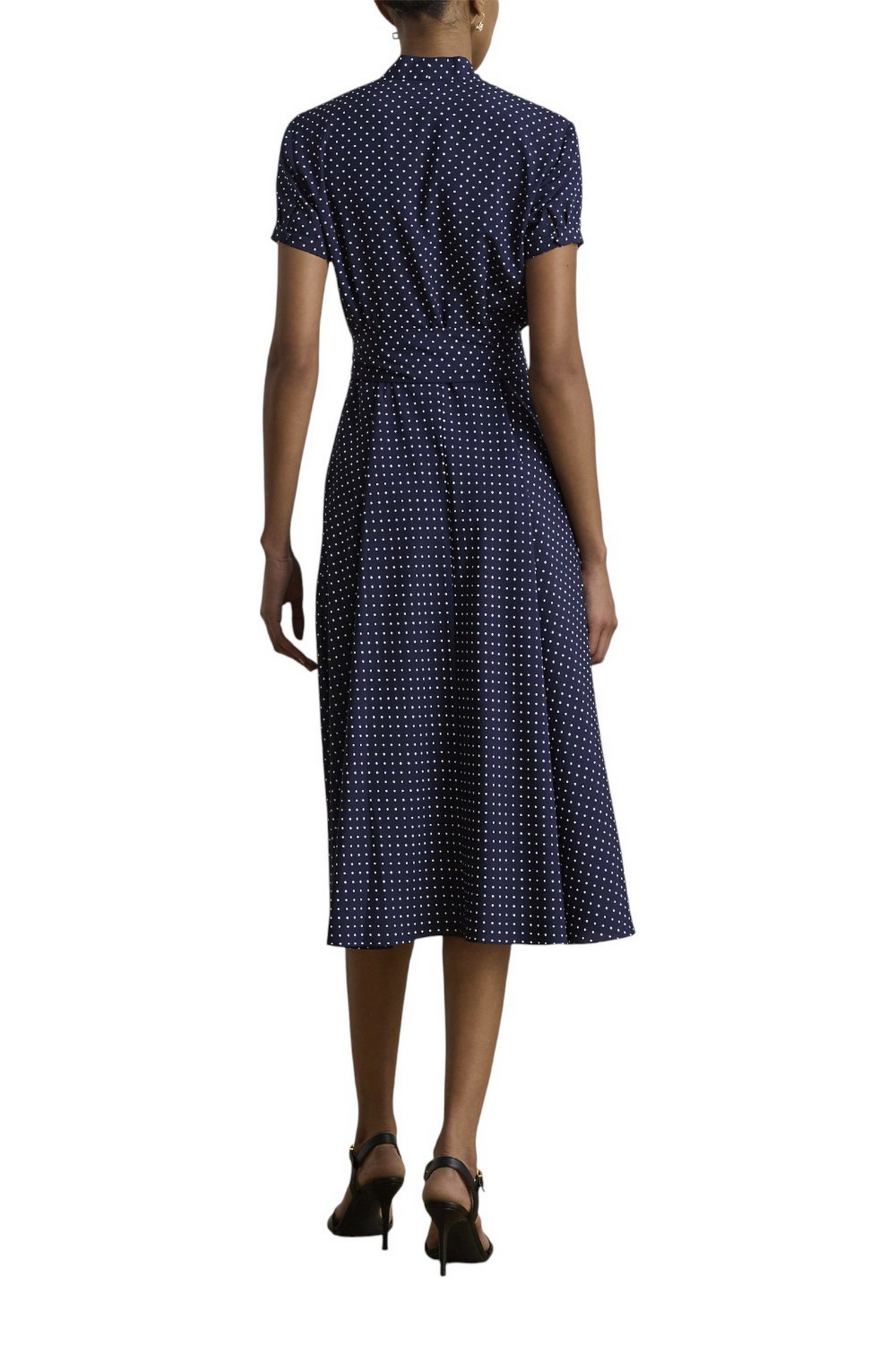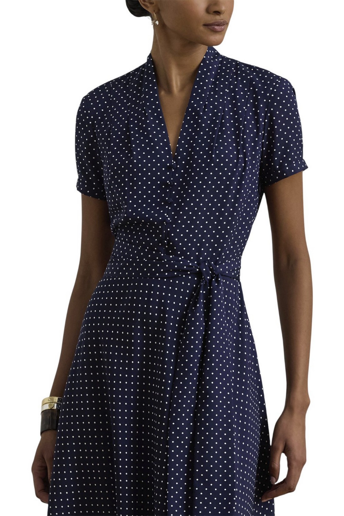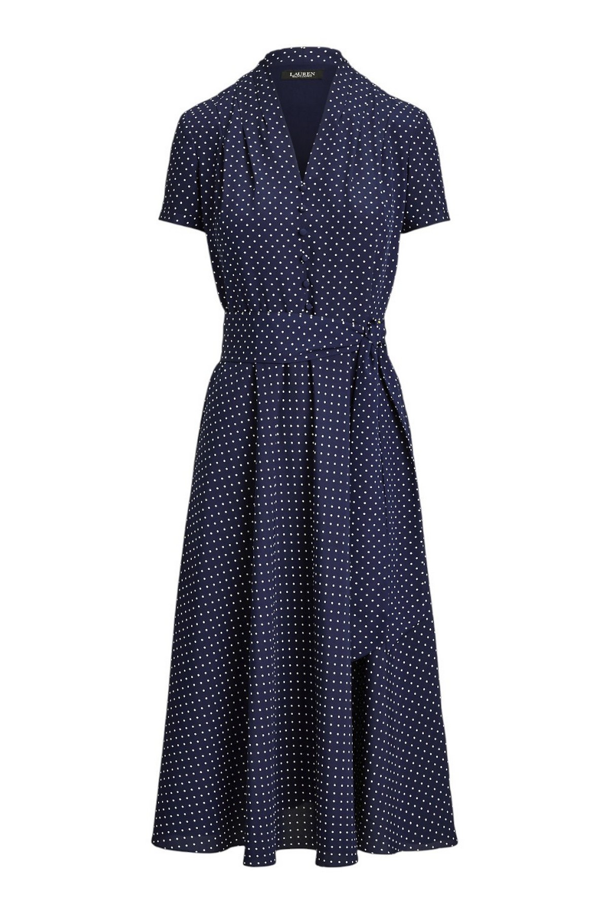 Abito a pois di Lauren Ralph Lauren. La cintura in vita accentua la silhouette aderente e svasata di questo abito con scollo a V, realizzato in morbido crêpe de chine con stampa a pois blu navy e bianchi. Silhouette aderente e svasata. Lunghezza prevista a metà polpaccio. Scollo a V arricciato. Mezza abbottonatura con bottoni e passanti. Cerniera nascosta nella cucitura laterale sinistra. Maniche corte con polsini abbottonati. Passanti per cintura. Dotato di cintura rimovibile con fibbia. Foderato sul corpetto. Esterno e fodera: 100% poliestere. Lavabile in lavatrice o a secco. La modella è alta 178 cm e indossa una taglia 4 americana.