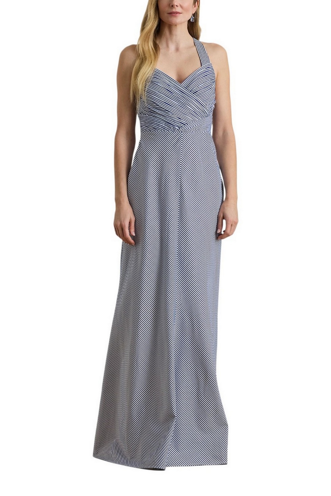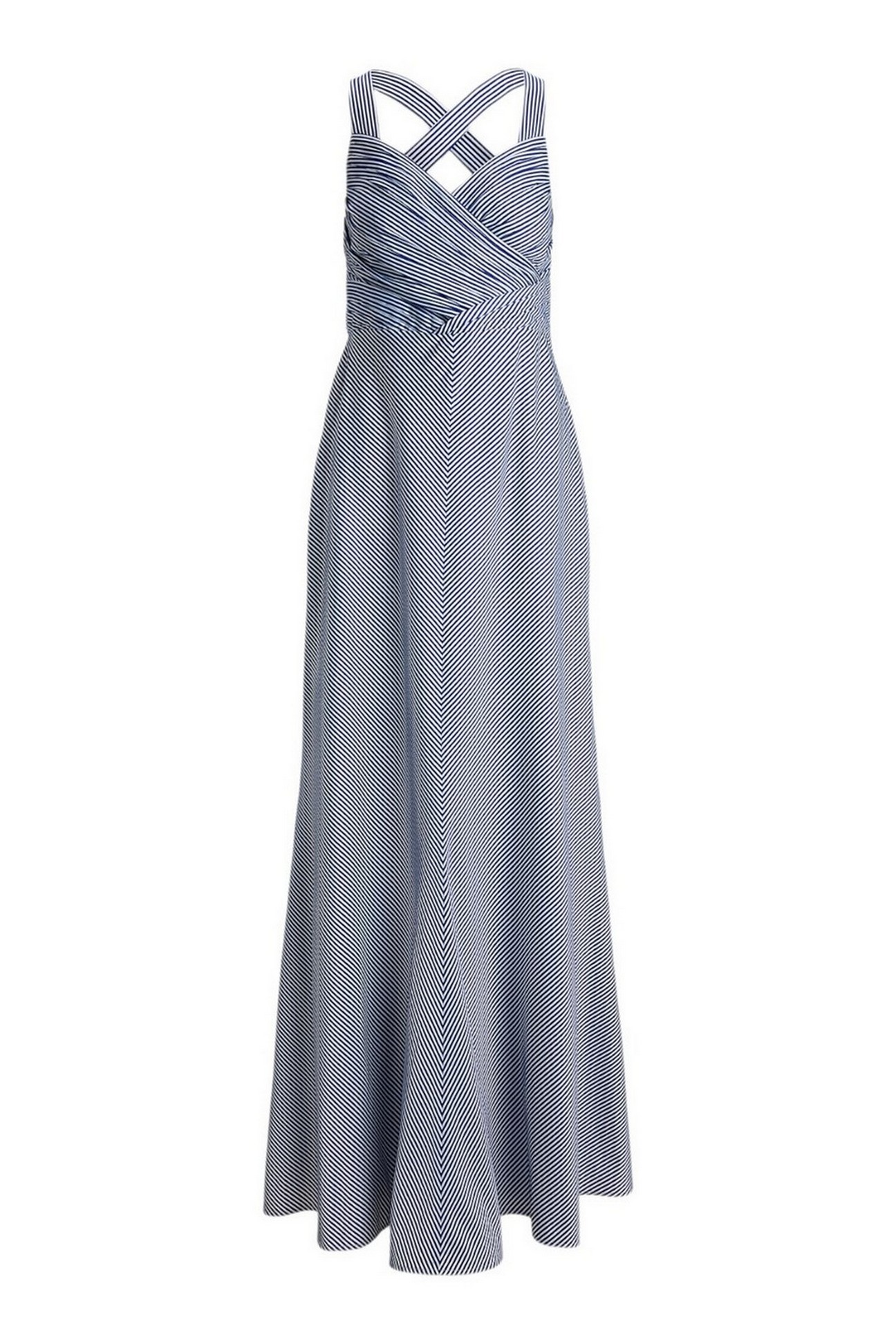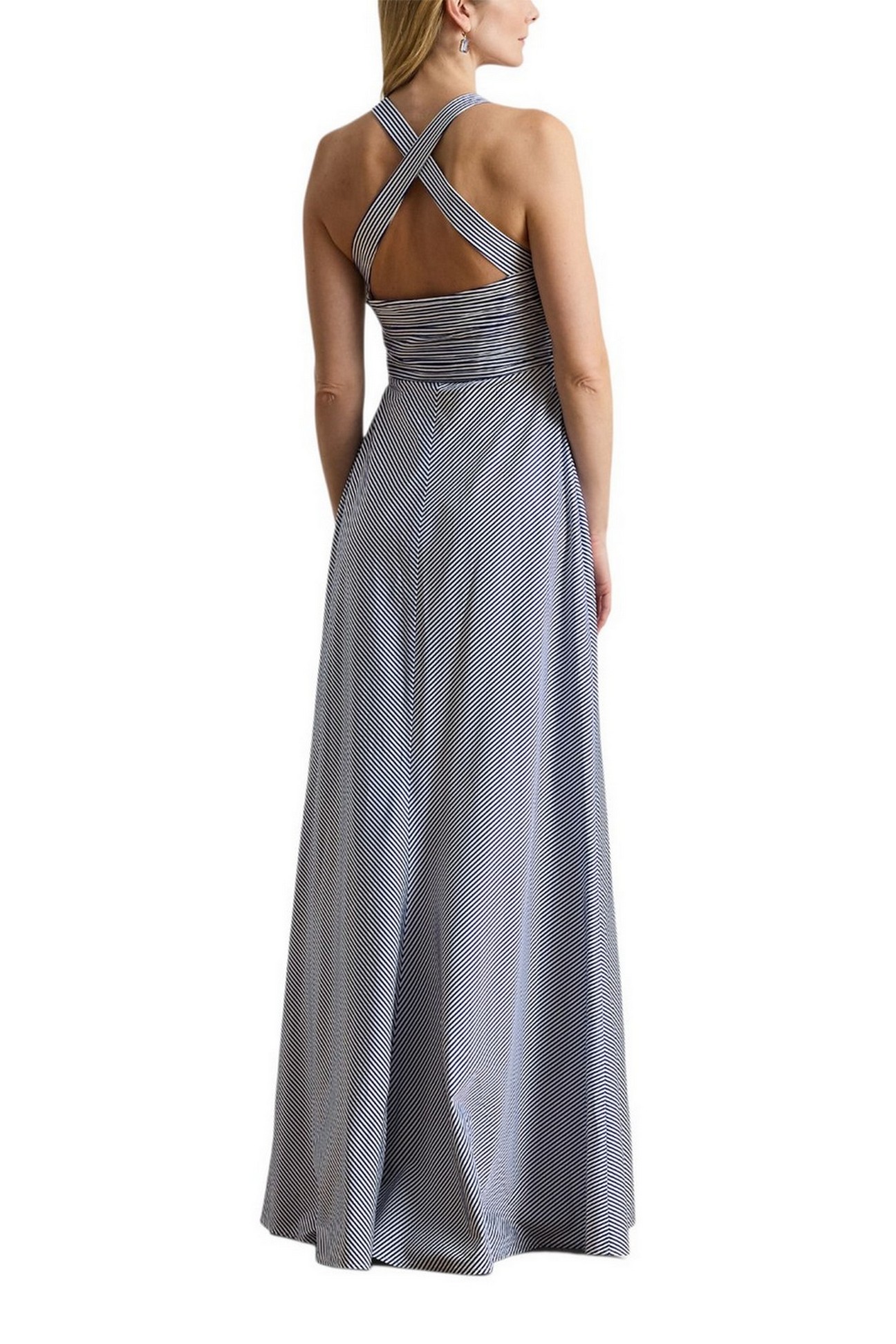 Abitondi Ralph Lauren realizzato in taffetà strutturato, a righe, presenta un corpetto incrociato plissettato con spalline incrociate sul retro e una gonna ampia tagliata in sbieco che scende fino a terra. Silhouette aderente e svasata. Lunghezza prevista fino a terra. Scollo a cuore. Corpetto incrociato. Cerniera nascosta sul lato sinistro con chiusura a gancio. Silhouette senza maniche. Spalline incrociate sul retro. Corpetto plissettato. Foderato sul corpetto. Esterno e fodera: 100% poliestere. Lavare a mano o a secco. La modella è alta 178 cm e indossa una taglia 4.